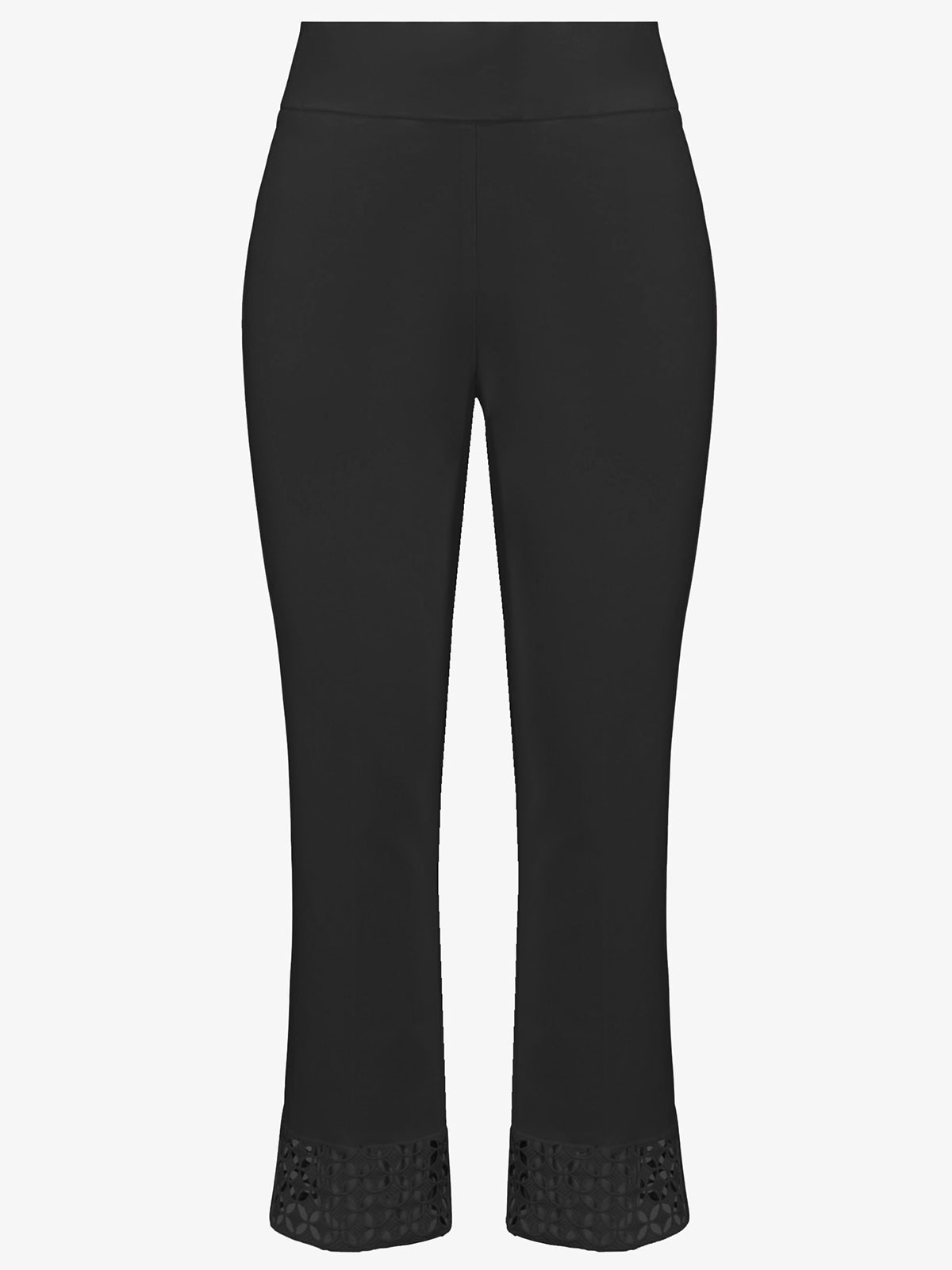 Stretchig "dra-på-byxa" från Joseph Ribkoff med en dekorativ spetskant vid bensluten. Byxan har ankellängd och en bred och dold resår upptill.