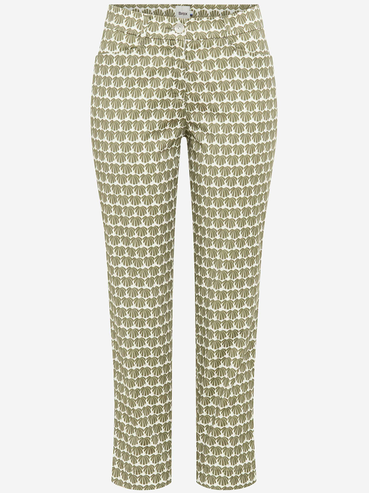 Mara S från Brax är en bekväm byxa som du känner dig klädd i. Benen har 7/8-delslängd och tyget på denna säsongskvalitet har ett grönt mönster på vit botten. Mara är en omtyckt vår- och sommarmodell som vi sålt i flera säsonger. Modellen har en normalhög midja med ett rakt ben som smalnar av nedtill. En modell som passar många kroppsformer. Hällor och diskreta fickor fram och bak.