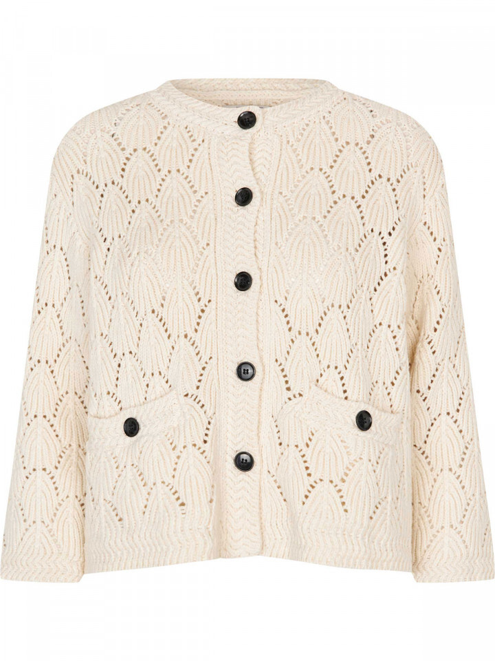 Mönsterstickad kofta med kontrasterande knappar från Masai. Koftan är i en mjuk bomullsmix och modellen är rak med rundad hals och hellång ärm.