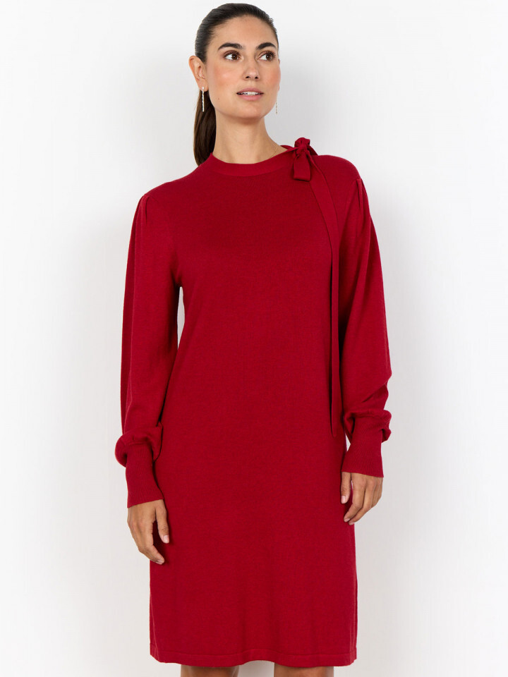 Finstickad klänning från SoyaConcept i skön viskosmix. Modellen är rak och enkel med knytband i halslinningen. Ärmen har puff och en extra bred mudd i nederkant. Inga fickor eller slitsar. Rak nederkant.