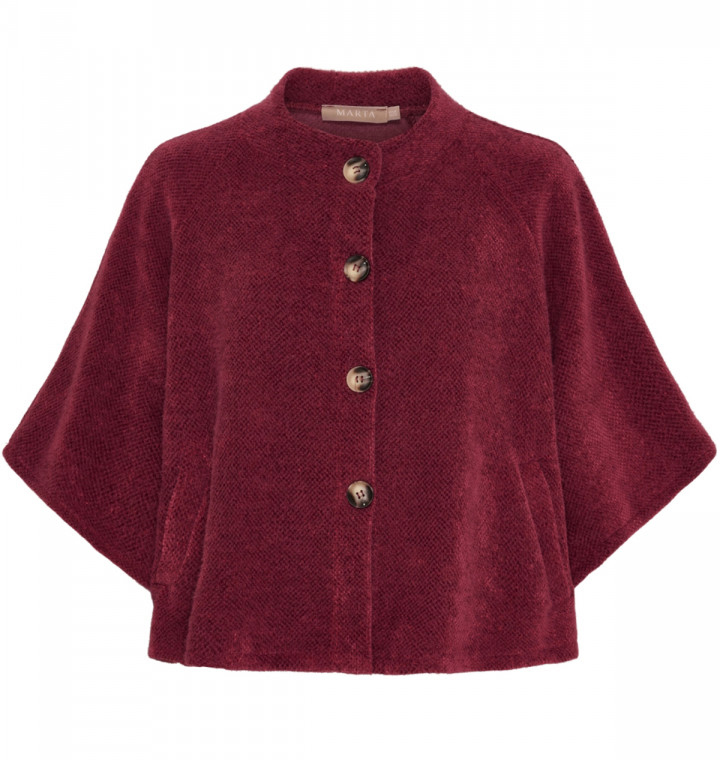En A-linjeformad cape från Marta du Chateau i en texturstickning med sammetsliknande garn. Perfekt som en värmande jacka över en både fest- och vardagsklänning. Eller som en lite vidare kavajjacka. Knäppning med melerade knappar, halvlång vid ärm och snedställda fickor på sidorna. Ofodrad.