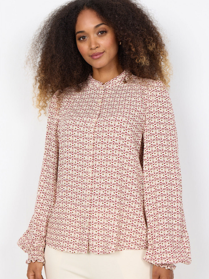 Jättefin småmönstrad viskosblus från SoyaConcept. Modellen har rundad hals med kort, stående volangkrage. Längs med axlarna finns det smockade partier som övergår i en puffärm. Den vida ärmen har även en bred smock i nederkant. Feminint och elegant!