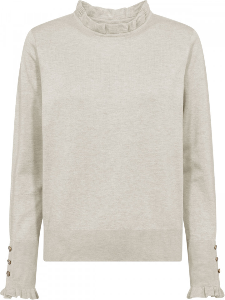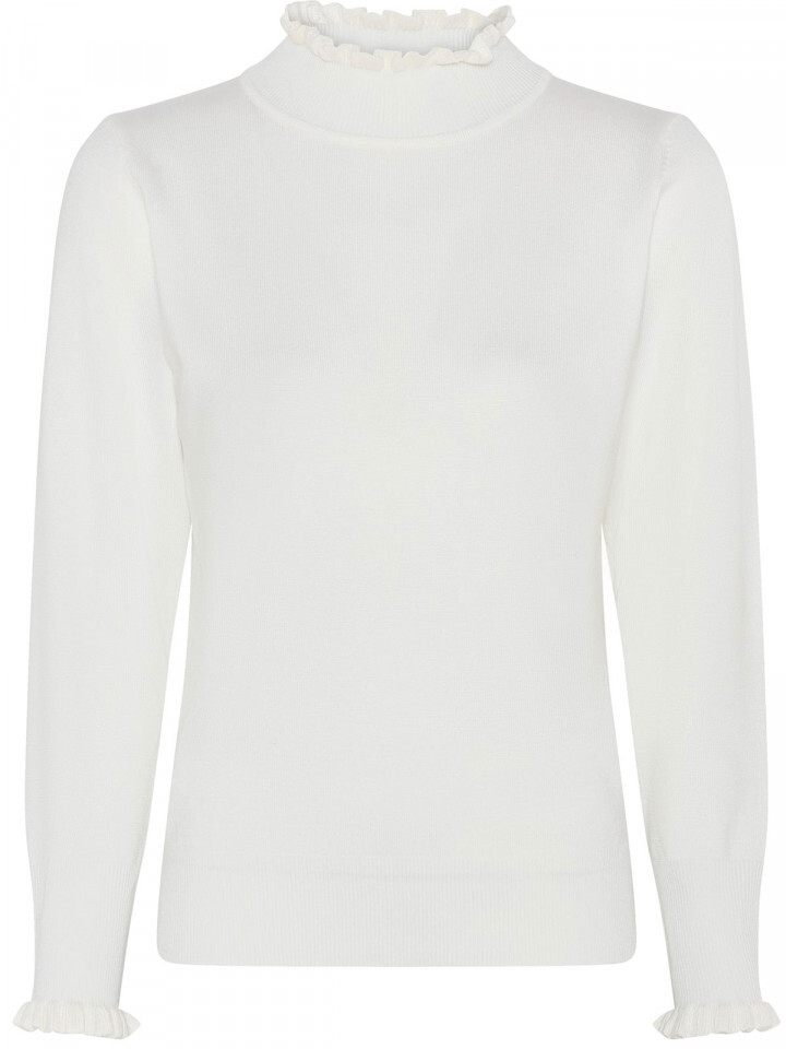 Feminin och finstickad tröja från danska FREEQUENT. Modellen är rak med mudd i nederkant. Halsen har en kort volangmudd som är så snygg att bära under kavaj eller jacka, eller bara som den är. Likaså har den hellånga ärmen en snygg nederkant där mudden är bredare och pryds av stenbeklädda knappar. Även här finns en kort volangmudd.