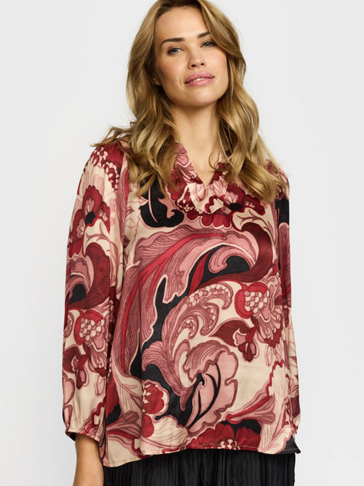 En vackert mönstrad satinblus från 2-BIZ. Modellen har rundad halsringning och en V-formad öppning fram. Den vida trekvartslånga ärmen avslutas med en resår.