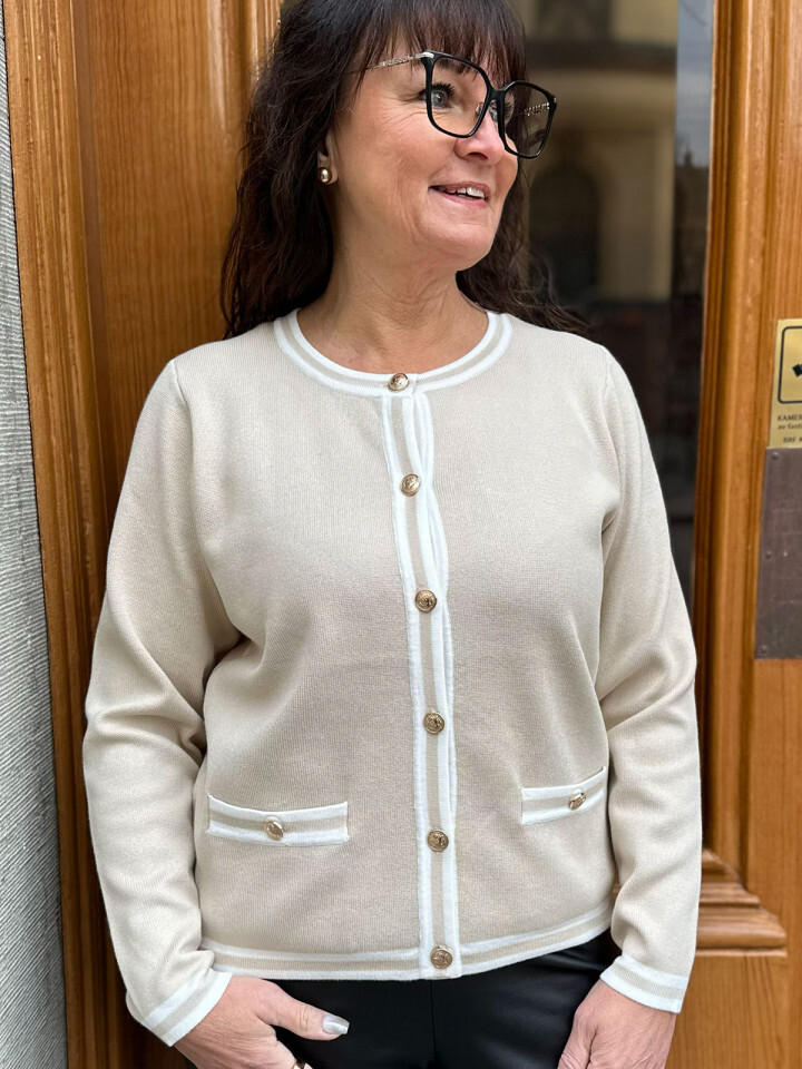 Elegant finstickad kofta från Micha med dekorativa guldknappar. Klassisk rak modell, med rundriungad hals och hellång ärm. Koftan har två fickor fram med knapp.