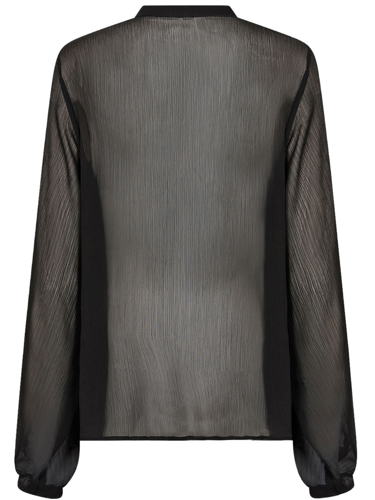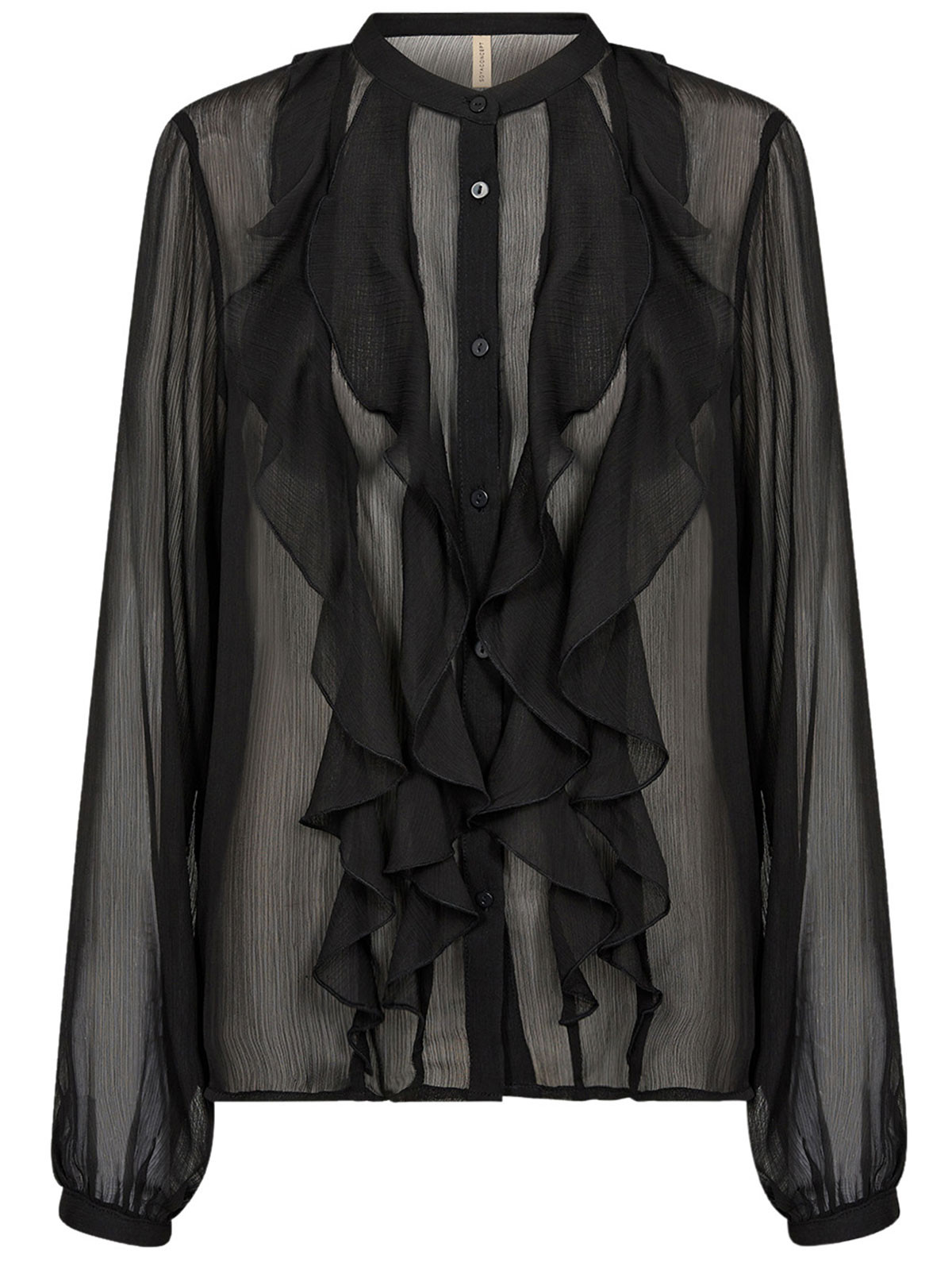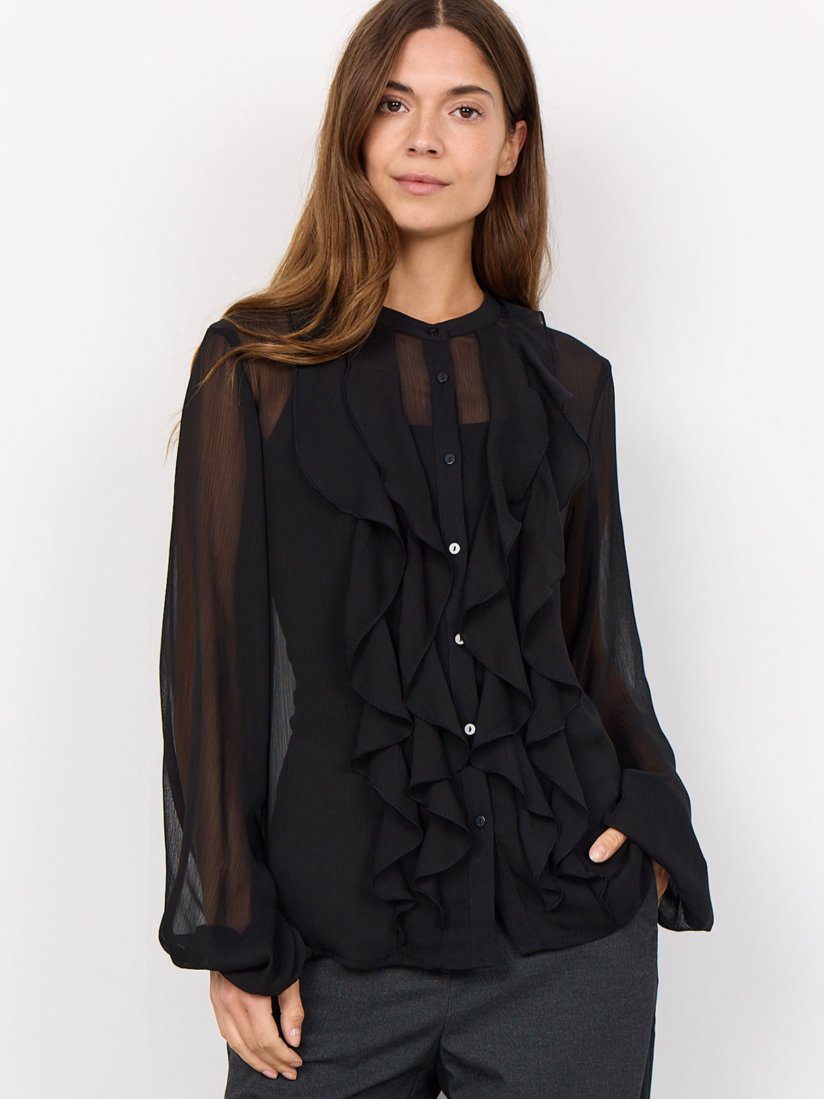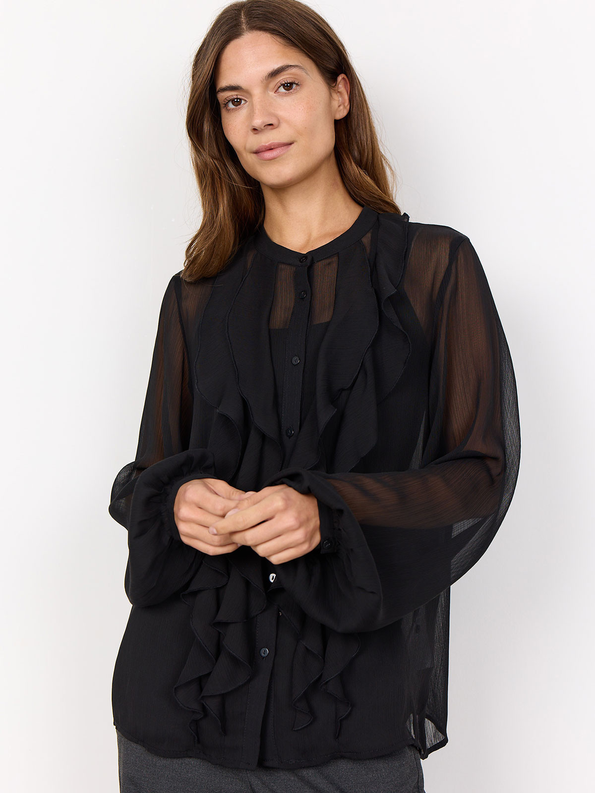 Fin chiffongblus från SoyaConcept med dubbel volangkrage. Modellen är rak och har rundad hals och hellång vid ärm med avsmalnande manschett. Tyget har genomlys så det är bra att ha ett linne under om du inte vill att din BH ska synas.