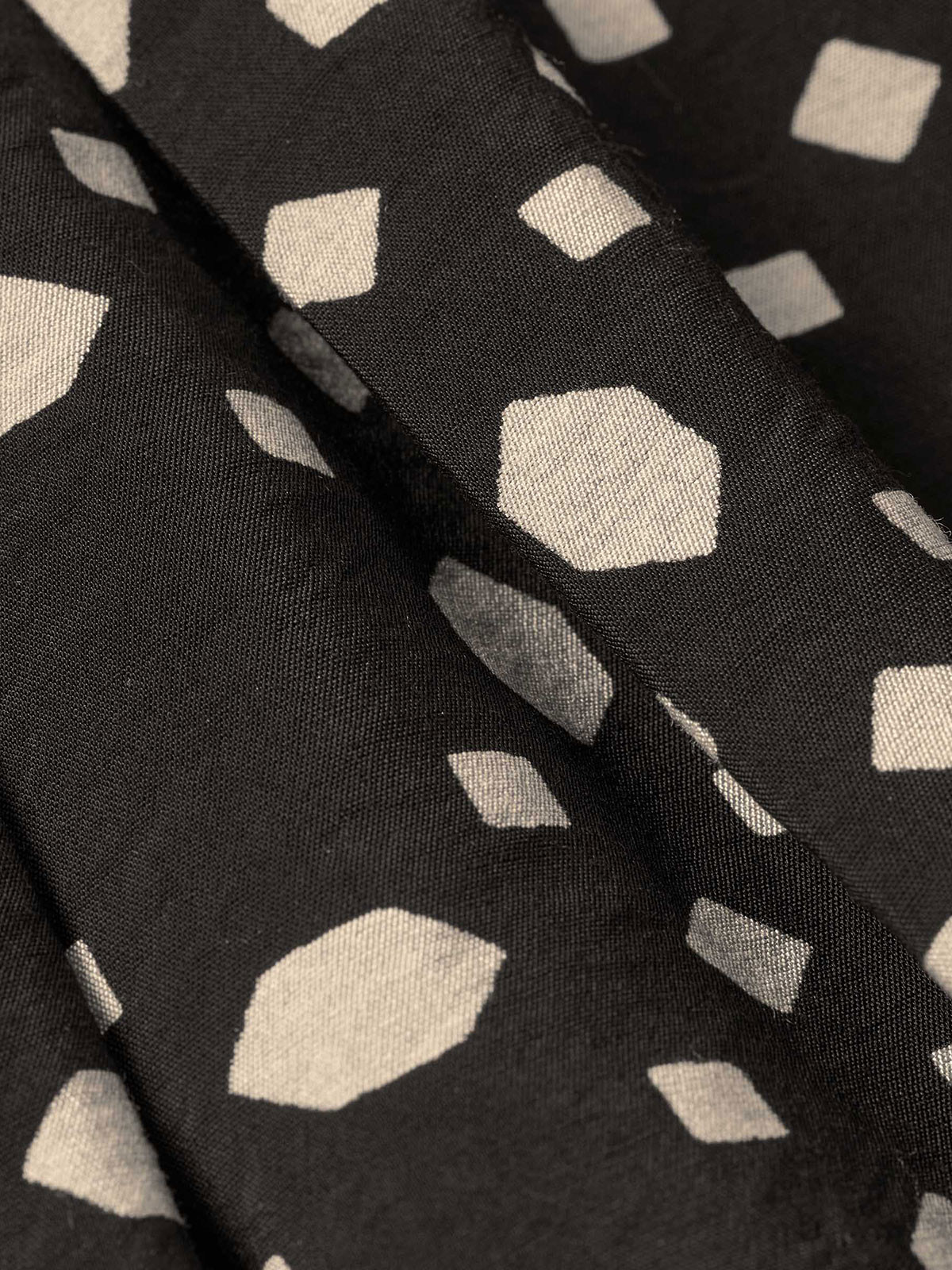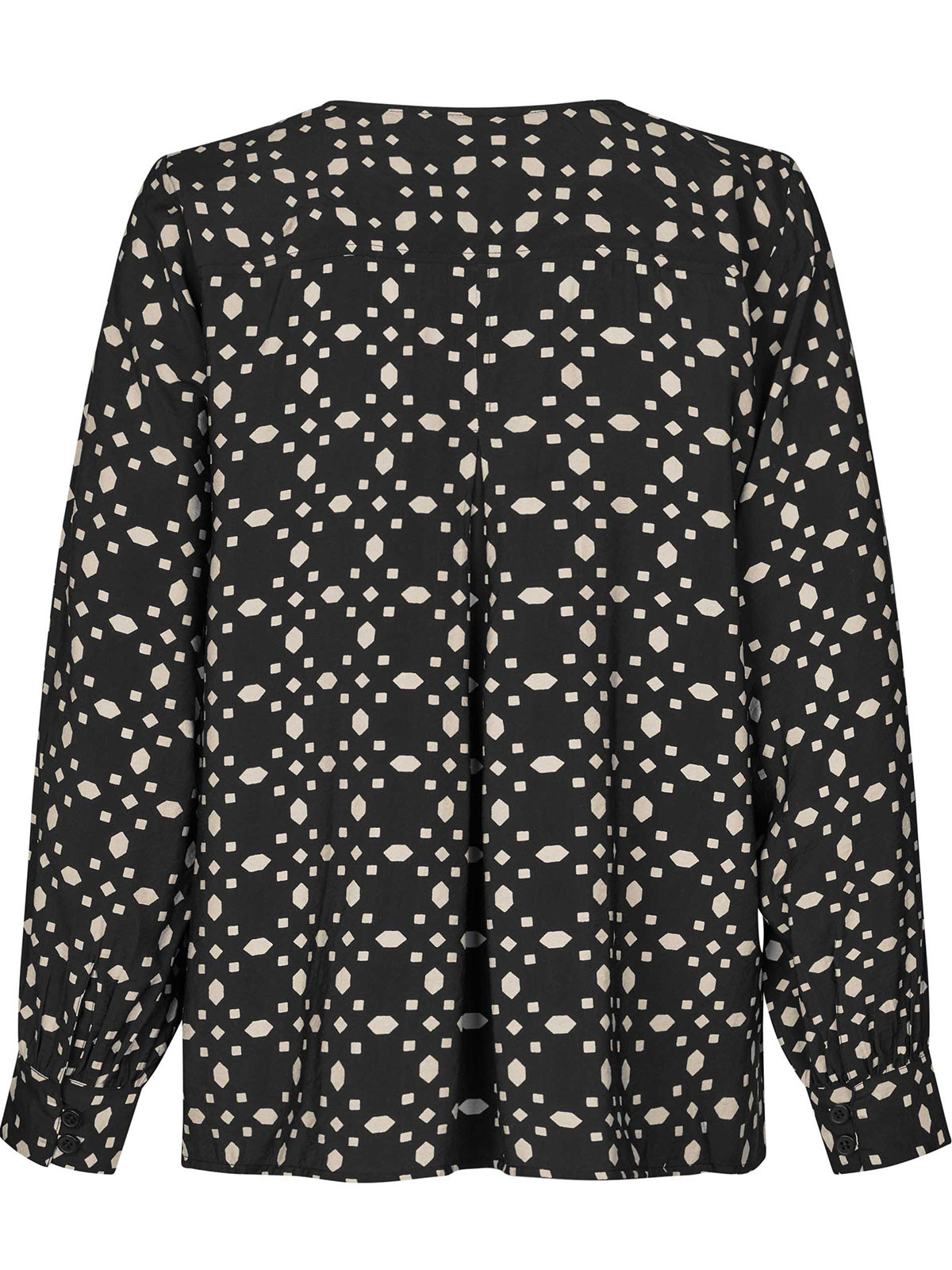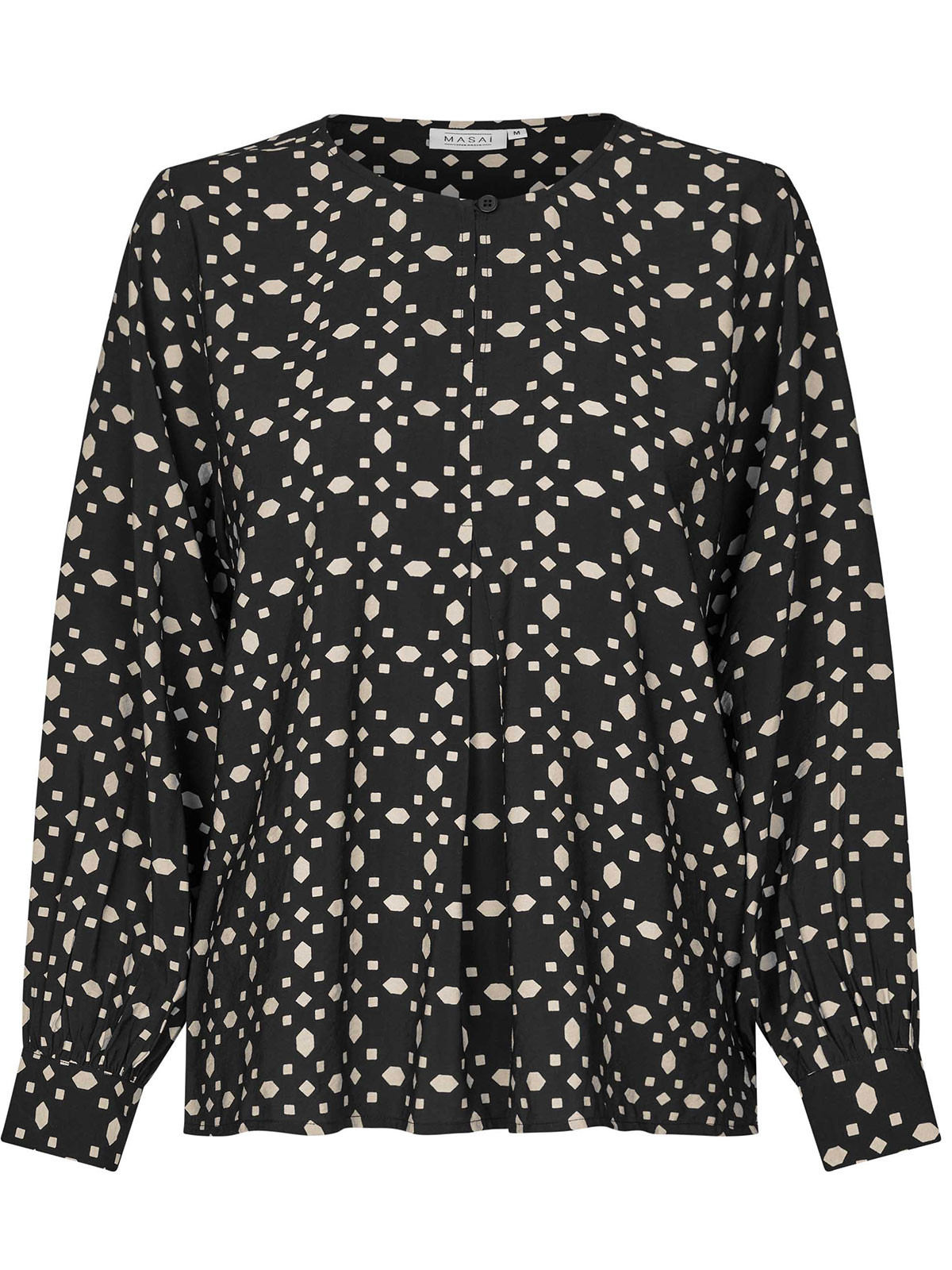 Söt blus från Masai i ett grafiskt mönster. Modellen är rak med rundringad hals och en knapp framtill. Ärmen är hellång med manschett. I ryggen finns ett motveck som ger lite vidd och nederkanten är svagt rundad för en fin siluett.