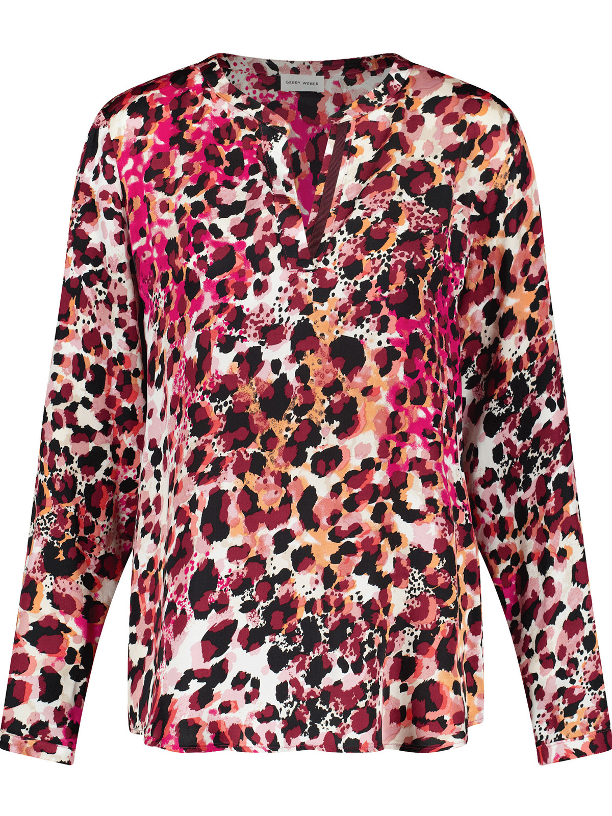 Härlig satinblus från Gerry Weber i ett härligt leomönster. Modellen är rak och har rundad hals med V-formad öppning. Längs med öppningen finns ett vinrött kantband som en snygg detalj. Ärmen är hellång och avslutas med en smal manschett. Nederkanten är mjukt rundad för en fin siluett.