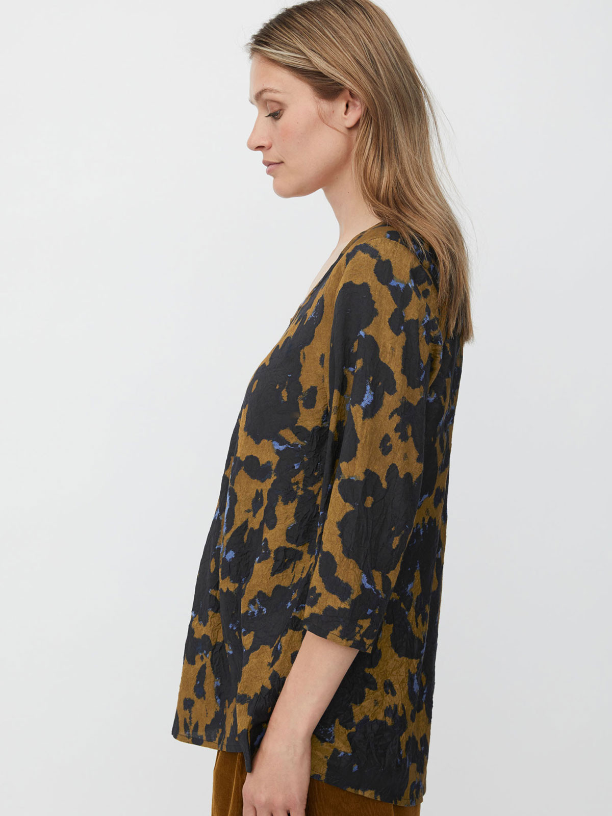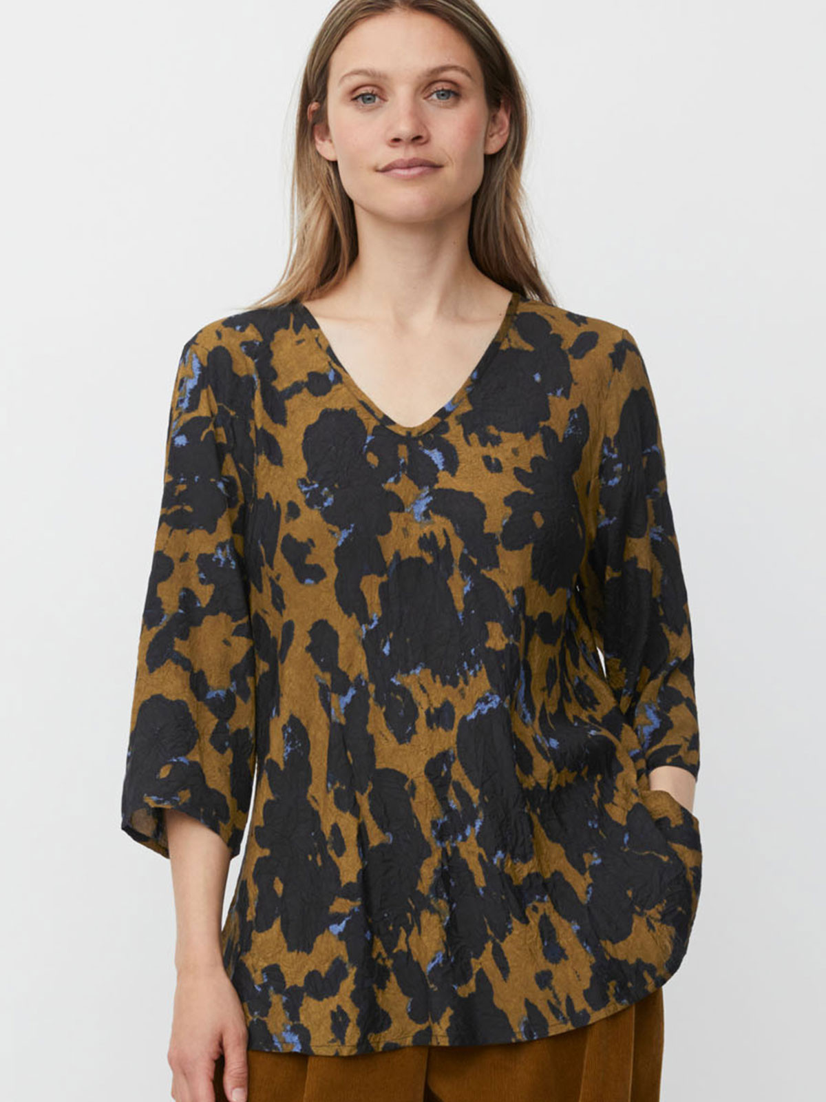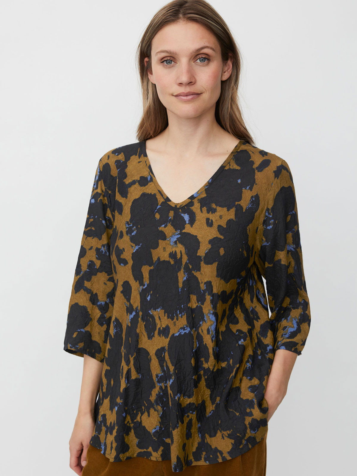 Denna tunika/topp är designad med en djup, feminin V-ringning och trekvartslånga ärmar. Modellen är A-linjeformad och är snygg till både byxor och kjol.