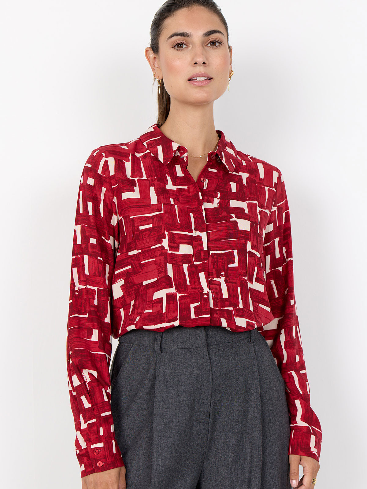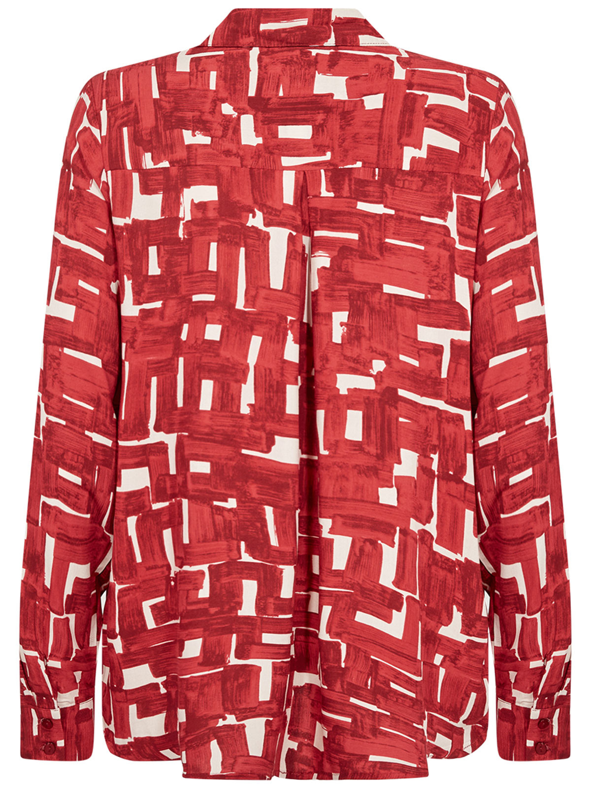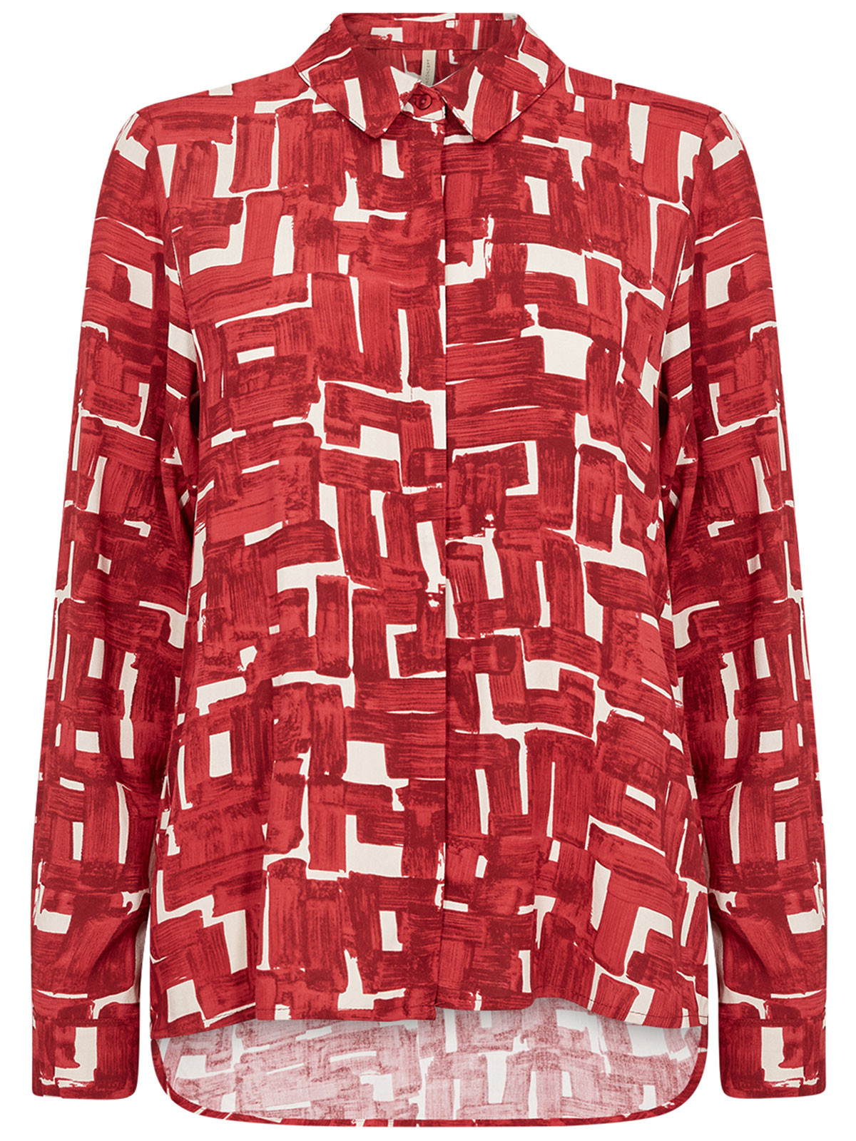 Viskosblus från SoyaConcept i klassisk skjortmodell. Dold knäppning, hellång ärm med manschett och rundad nederkant som är längre bak.