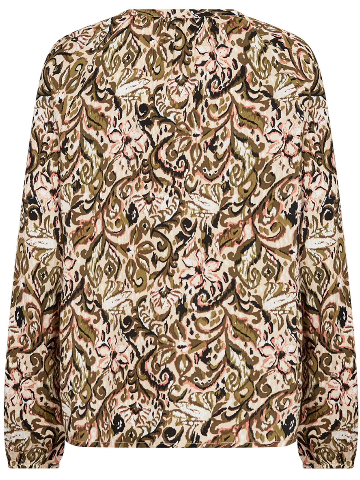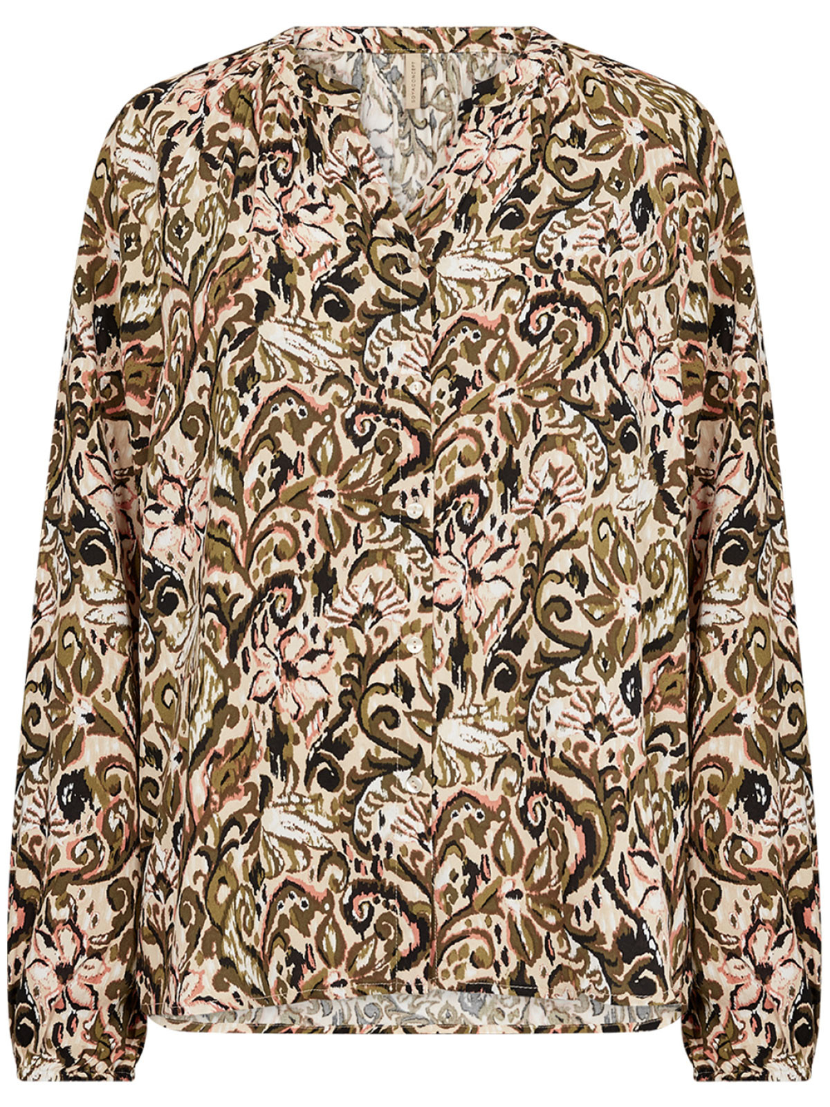 Rymlig viskosblus från SoyaConcept med rynkad söm längs den rundringade halsen. Modellen är ledig med en vid och lång ärm som samlas ihop med en resår i nederkant. Knäppning hela vägen fram.