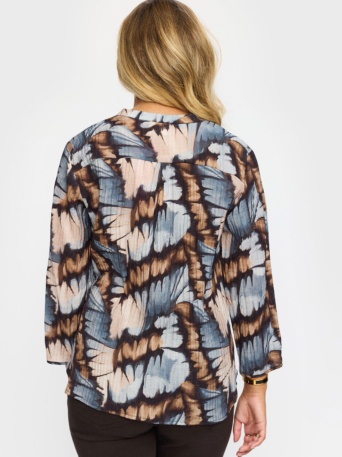 Elegant blus från 2Biz i ett strukturerat viskostyg. Modellen är rymlig och har rundringad hals med V-formad öppning och tre knappar.