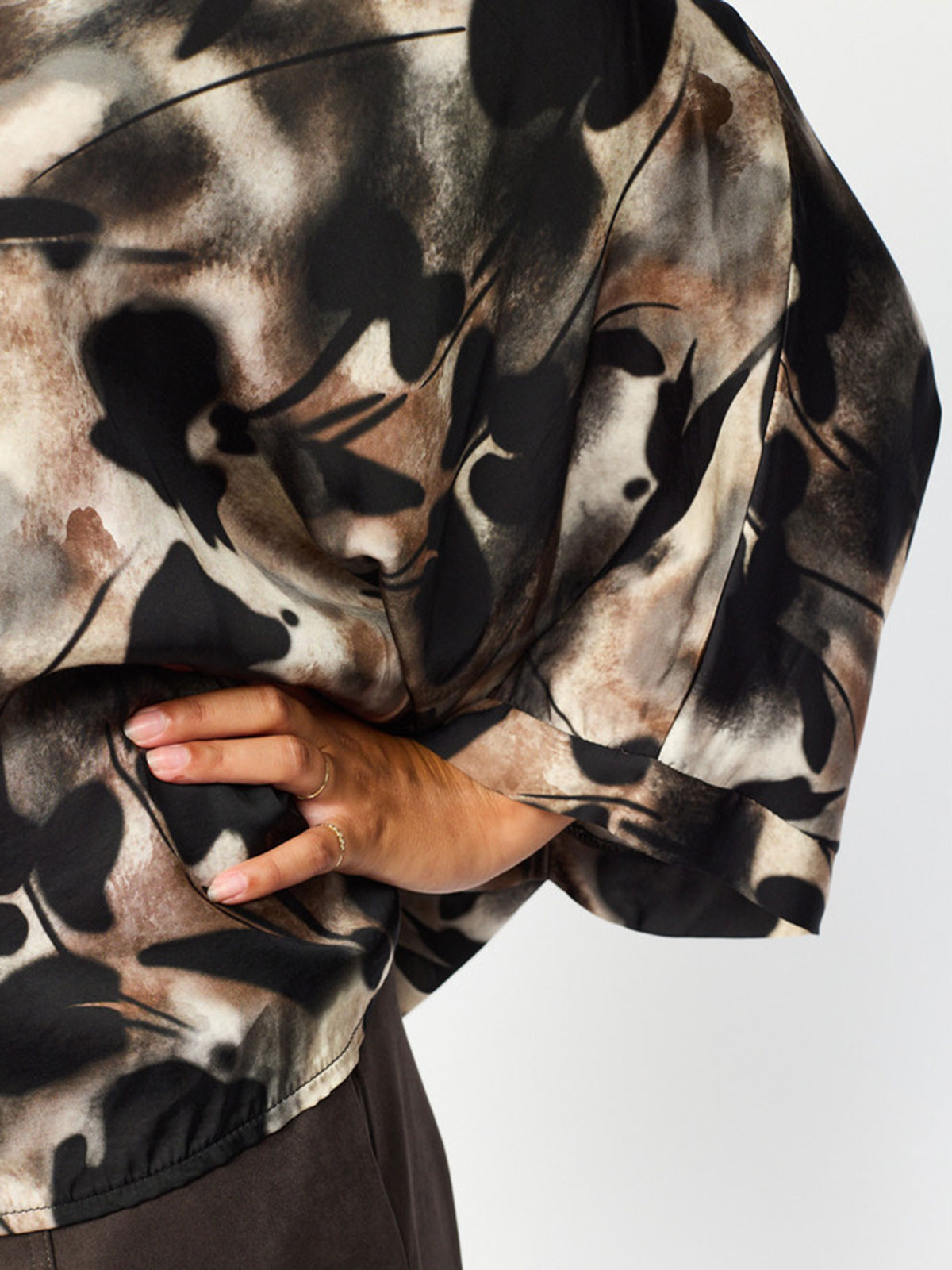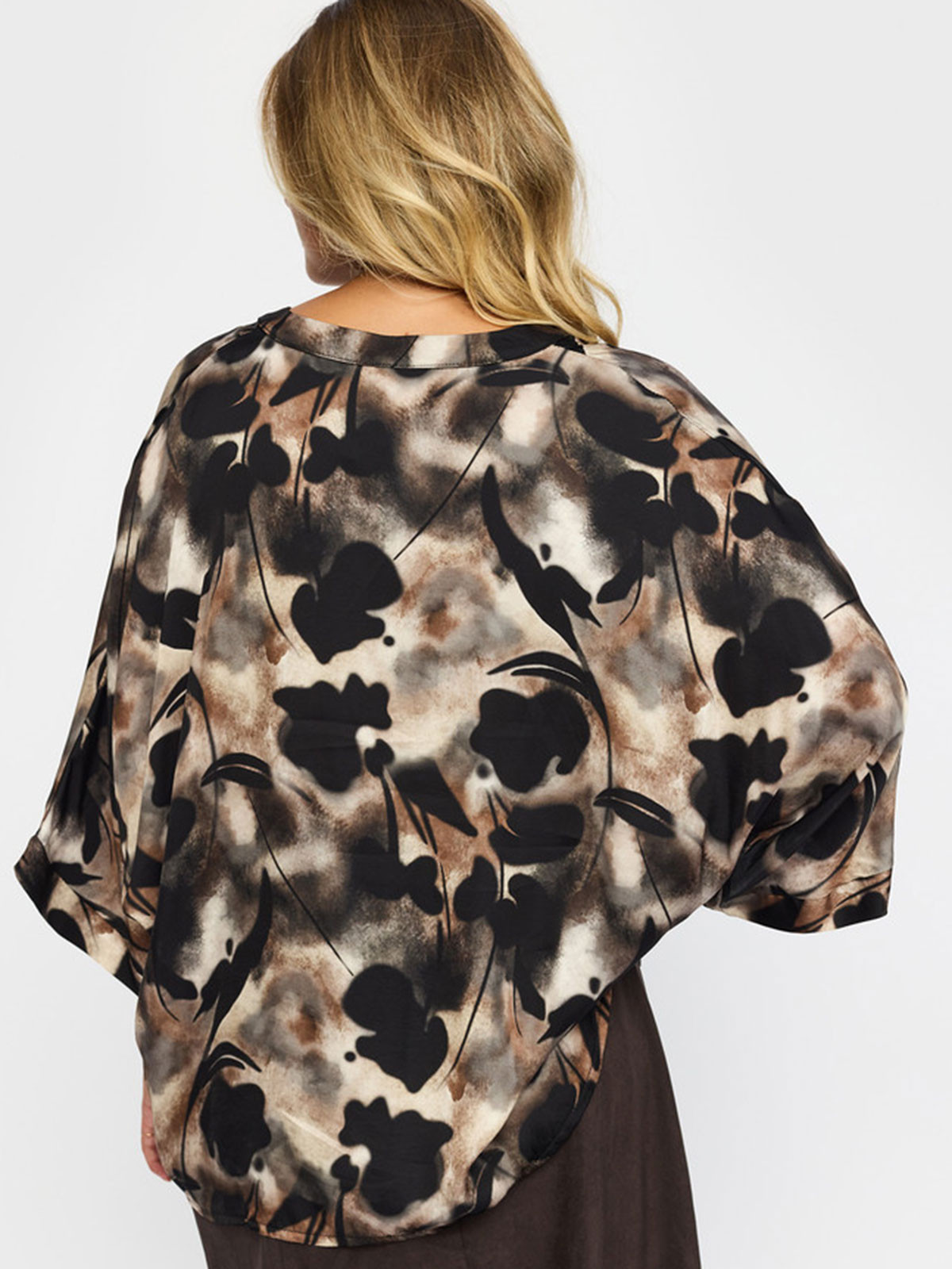 Härlig satinblus från 2-BIZ i viskos- och silkesmix. Modellen är oversize och luftig och faller fint över kroppen. Ärmen har armbågslängd och knapparna är som små pärlor med guldkant.