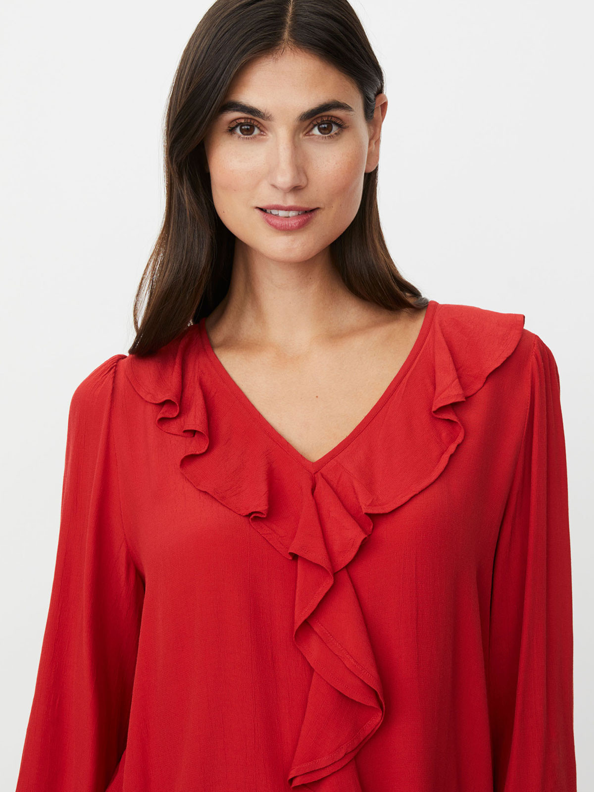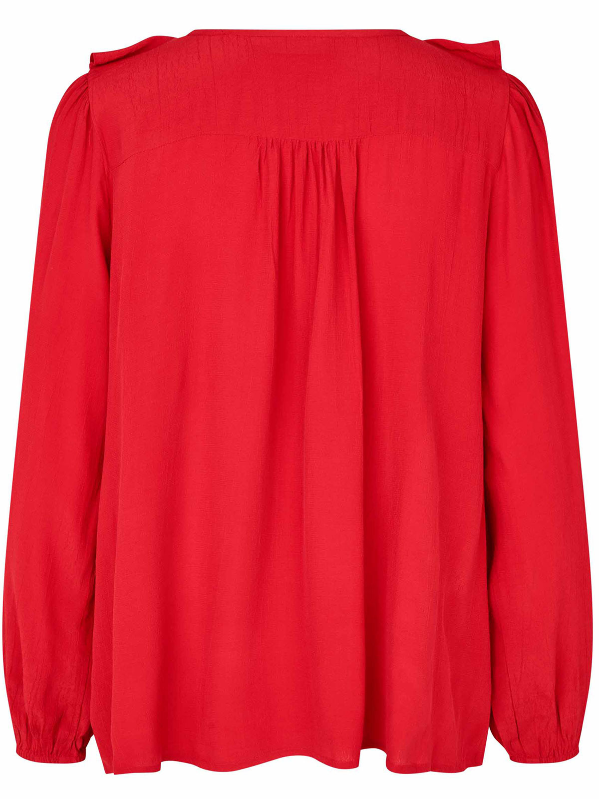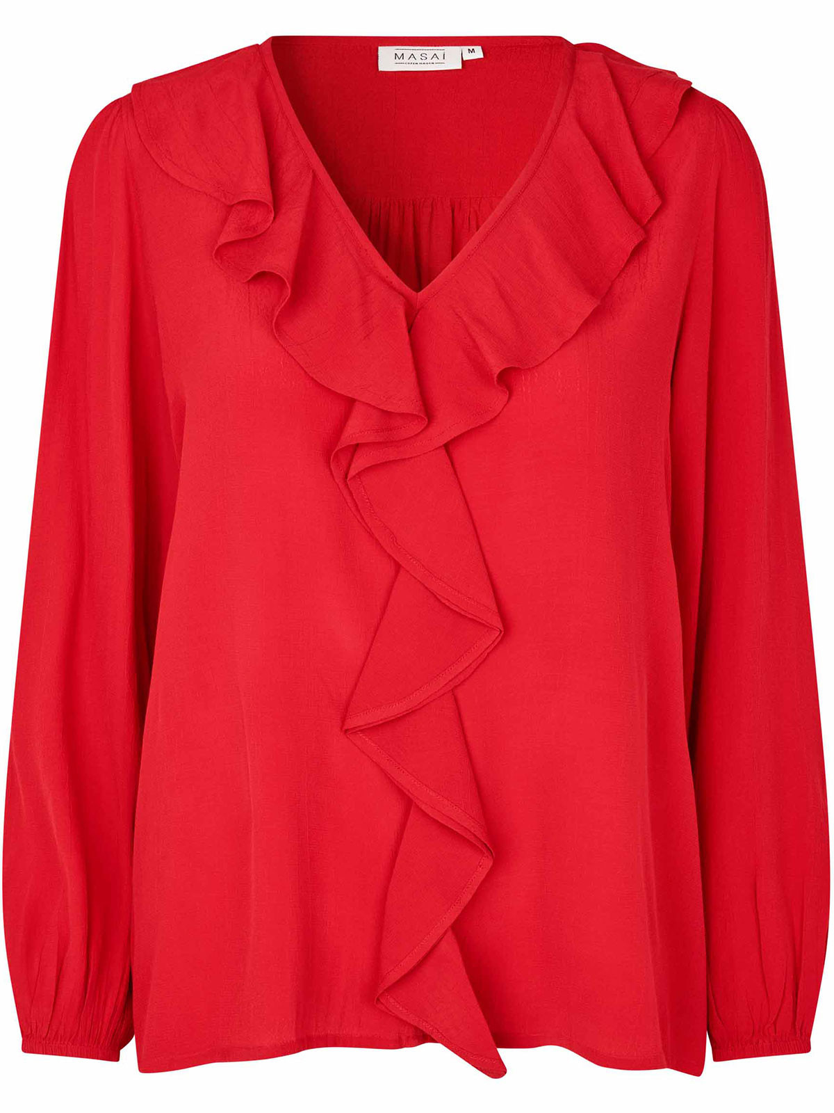 Härligt röd viskosblus från Masai med fin volangkrage. Modellen är ledig och rak med V-ringad hals som pryds med volang. Ärmen har liten puff, är hellång och avslutas med en resårkant.