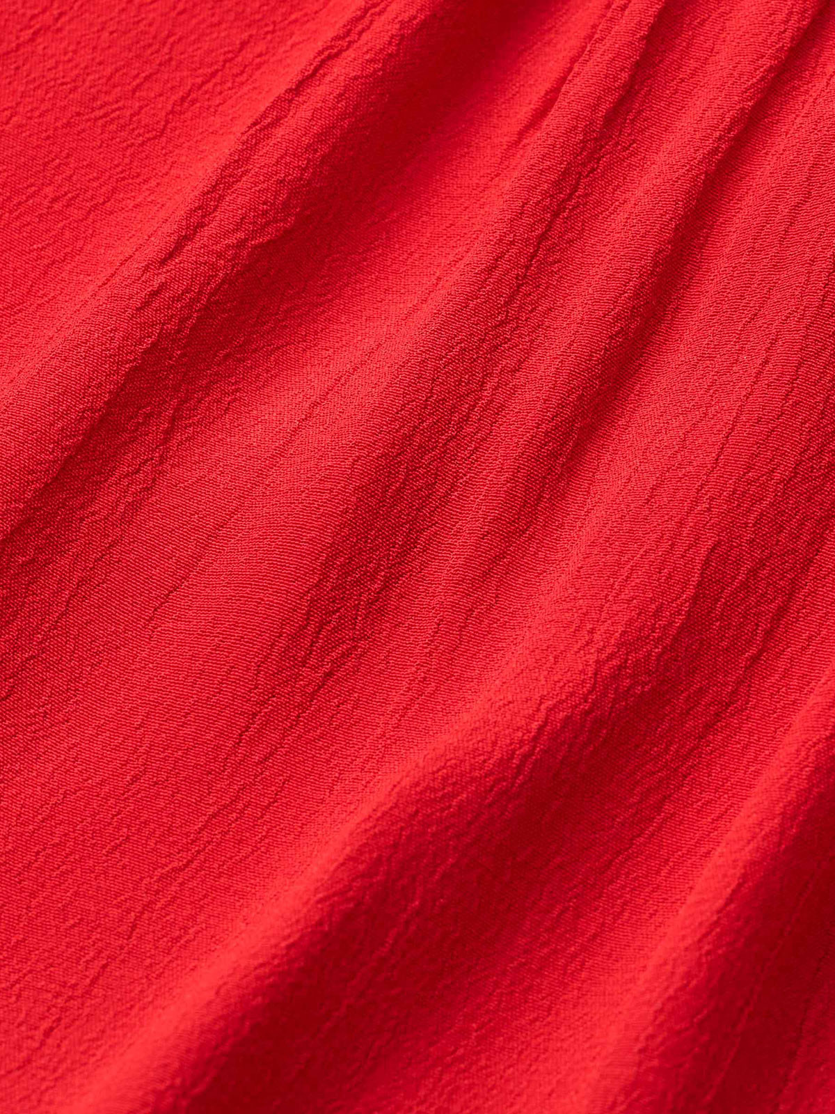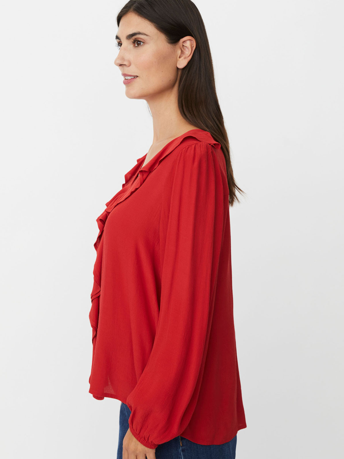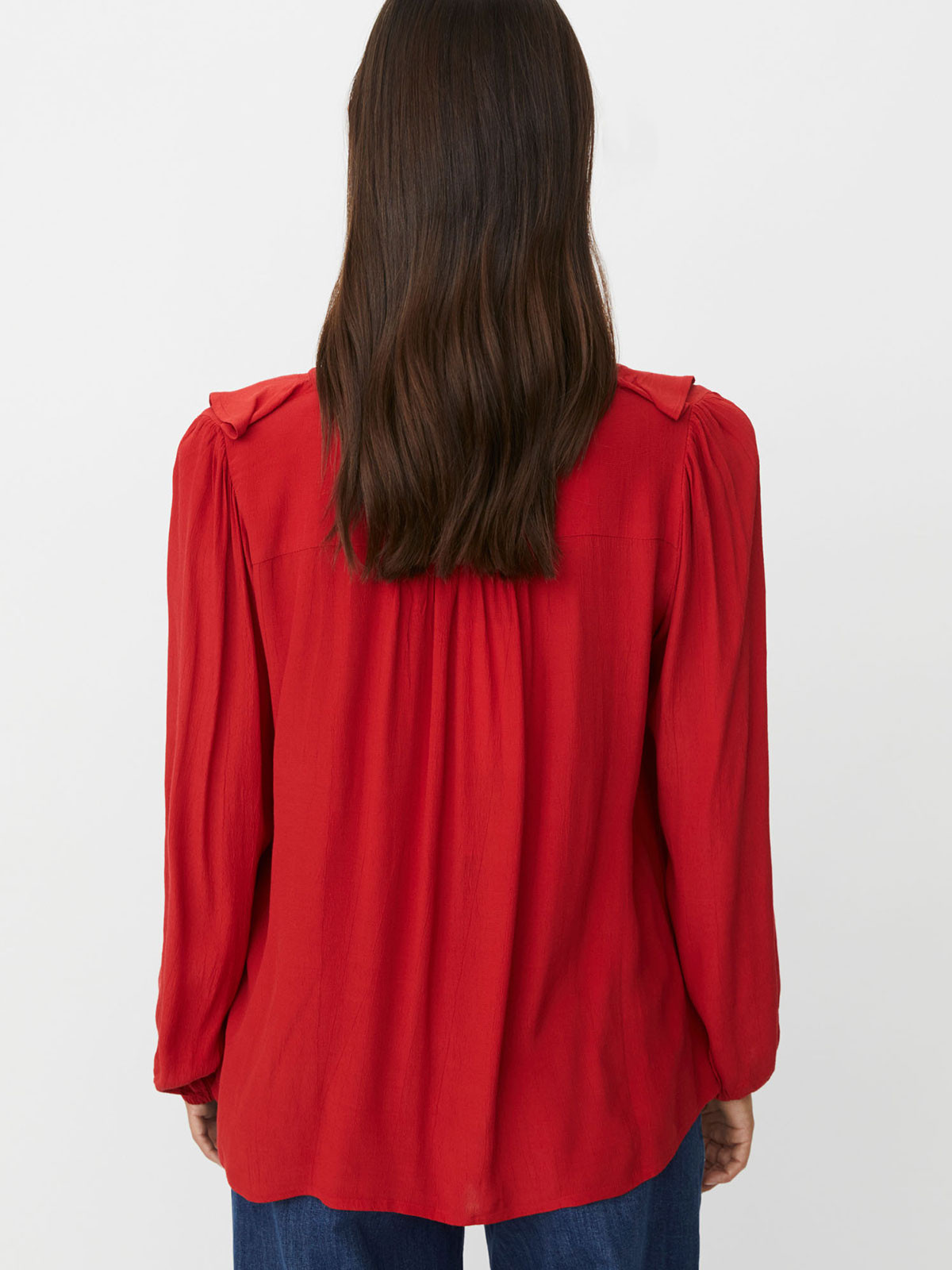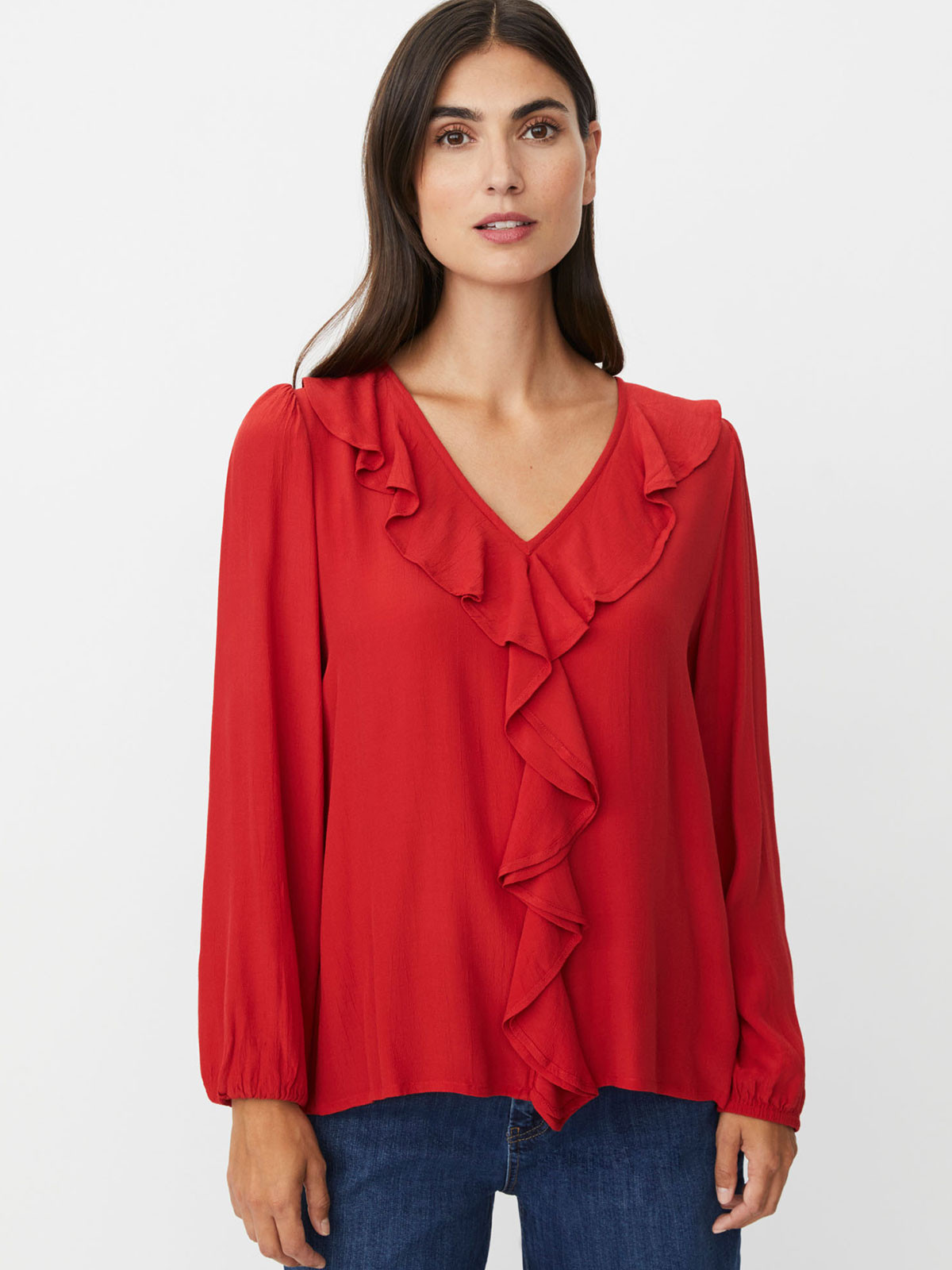 Härligt röd viskosblus från Masai med fin volangkrage. Modellen är ledig och rak med V-ringad hals som pryds med volang. Ärmen har liten puff, är hellång och avslutas med en resårkant.
