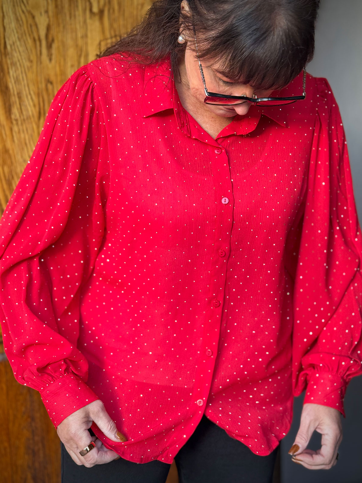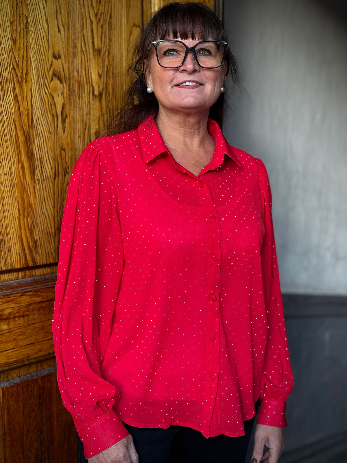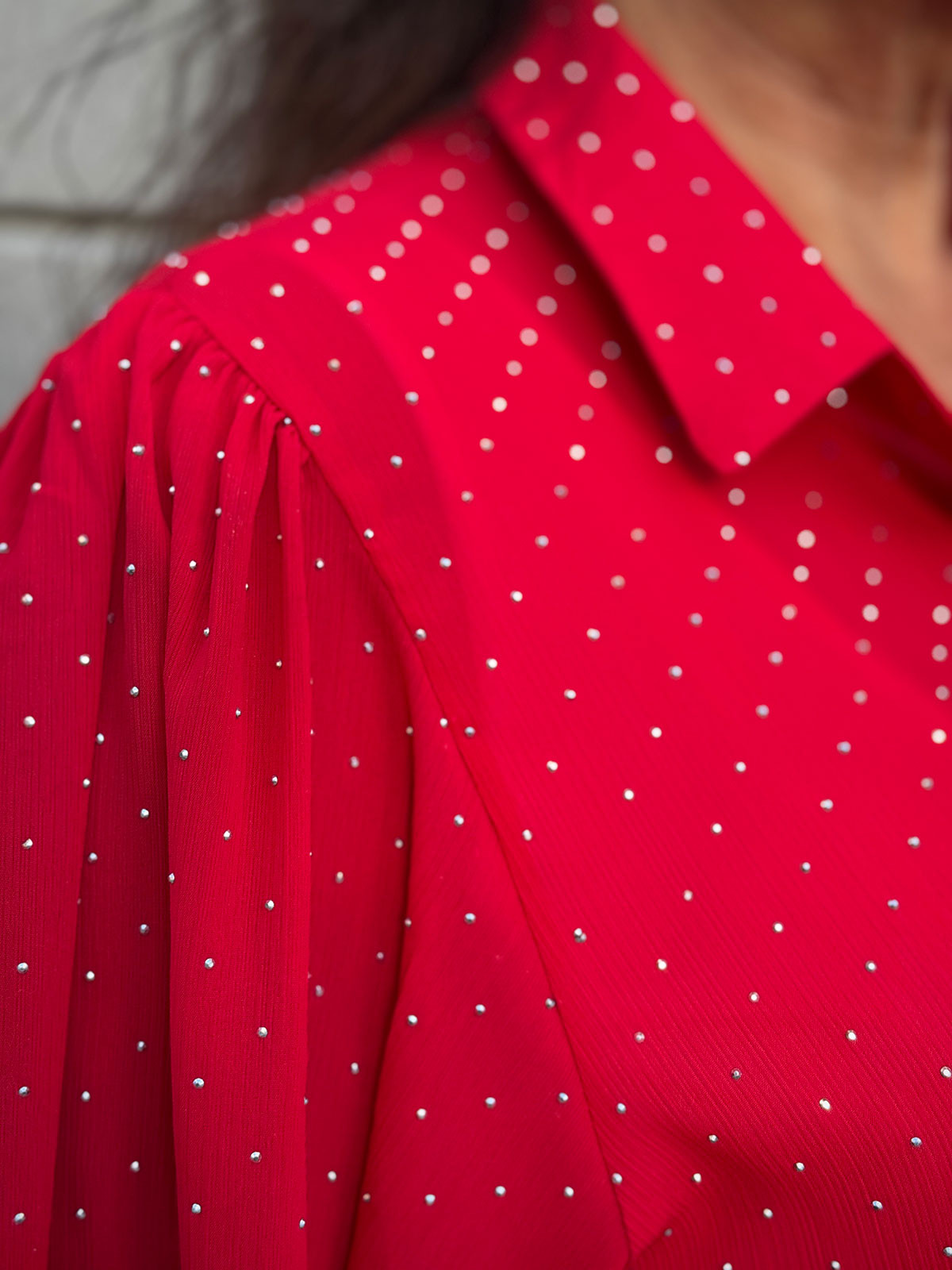 Härlig festblus med gnistrande stenar strösslade över tyget runt om hela. Modellen är klassisk i sin bas med skortkrage och rakt snitt. Ärmarna är rejält vida, har puff och en samlande manschett i nederkant. Elegant rundad i nedekant.