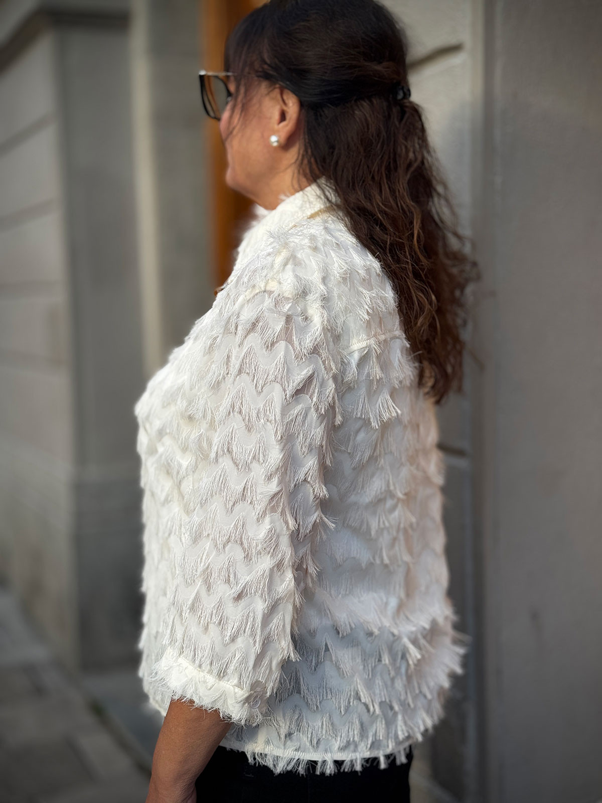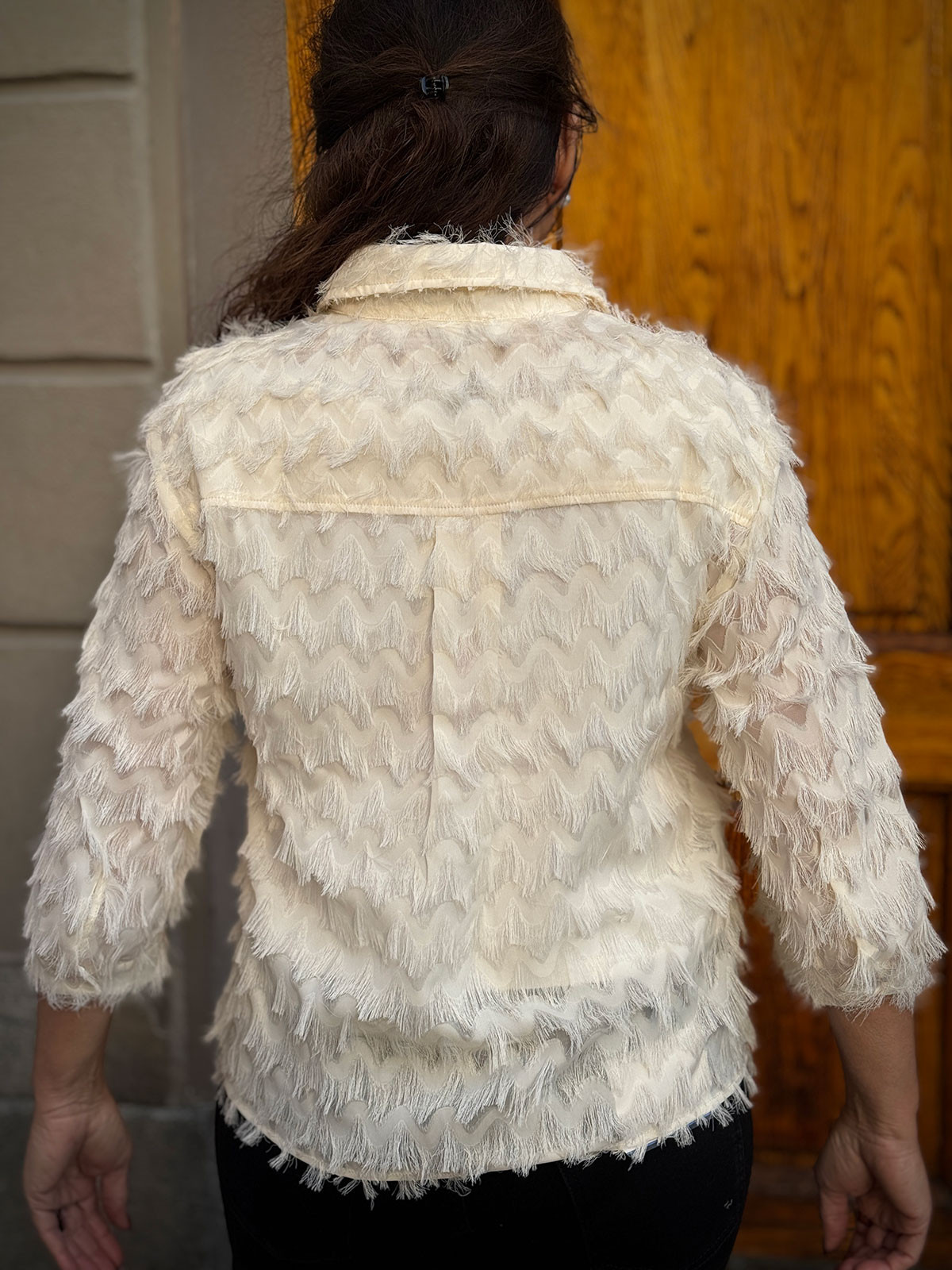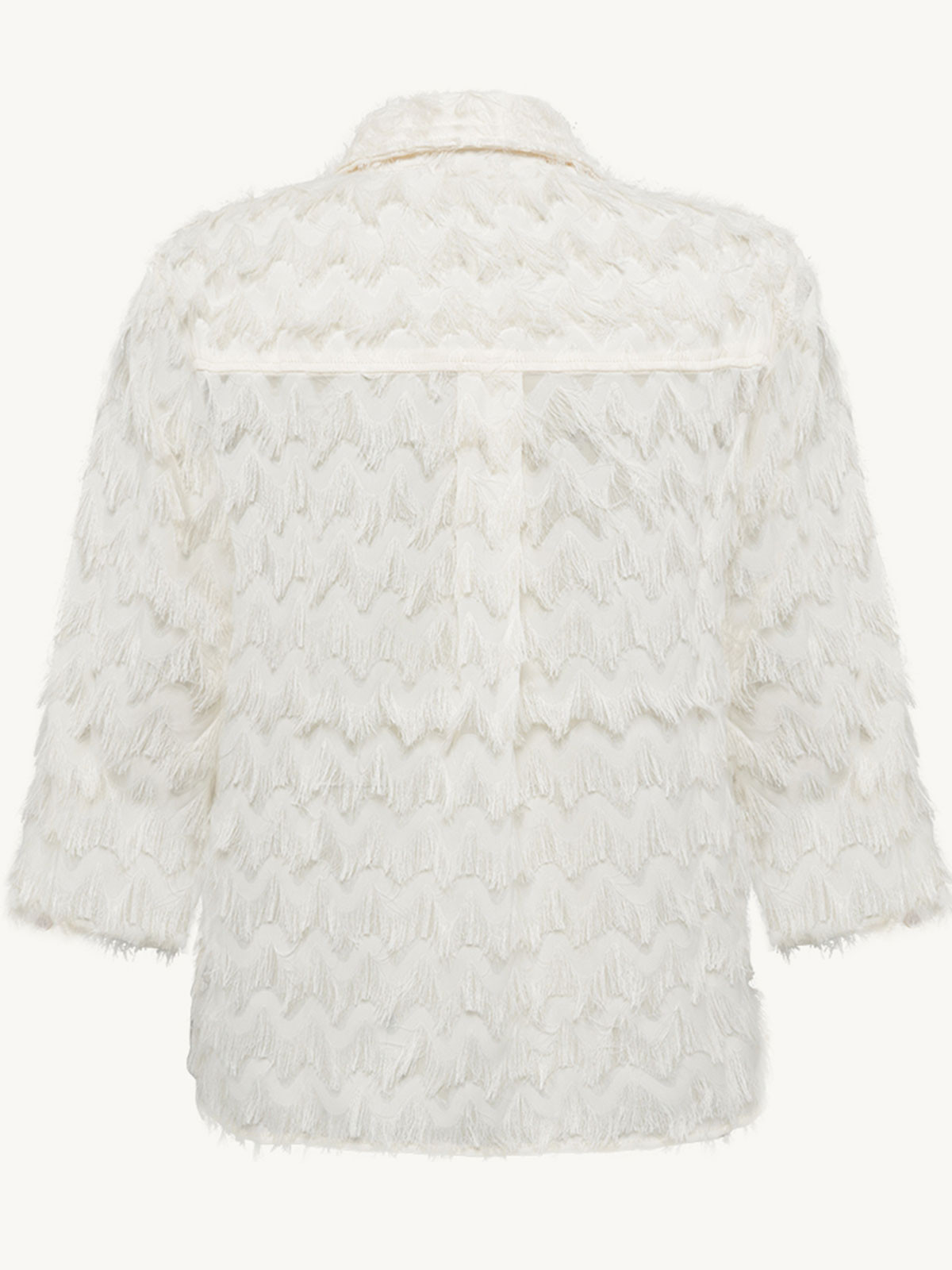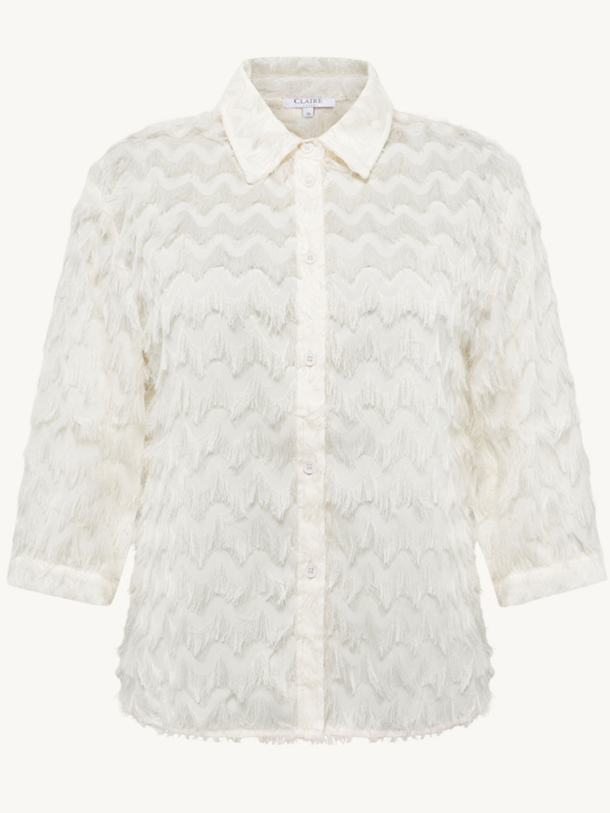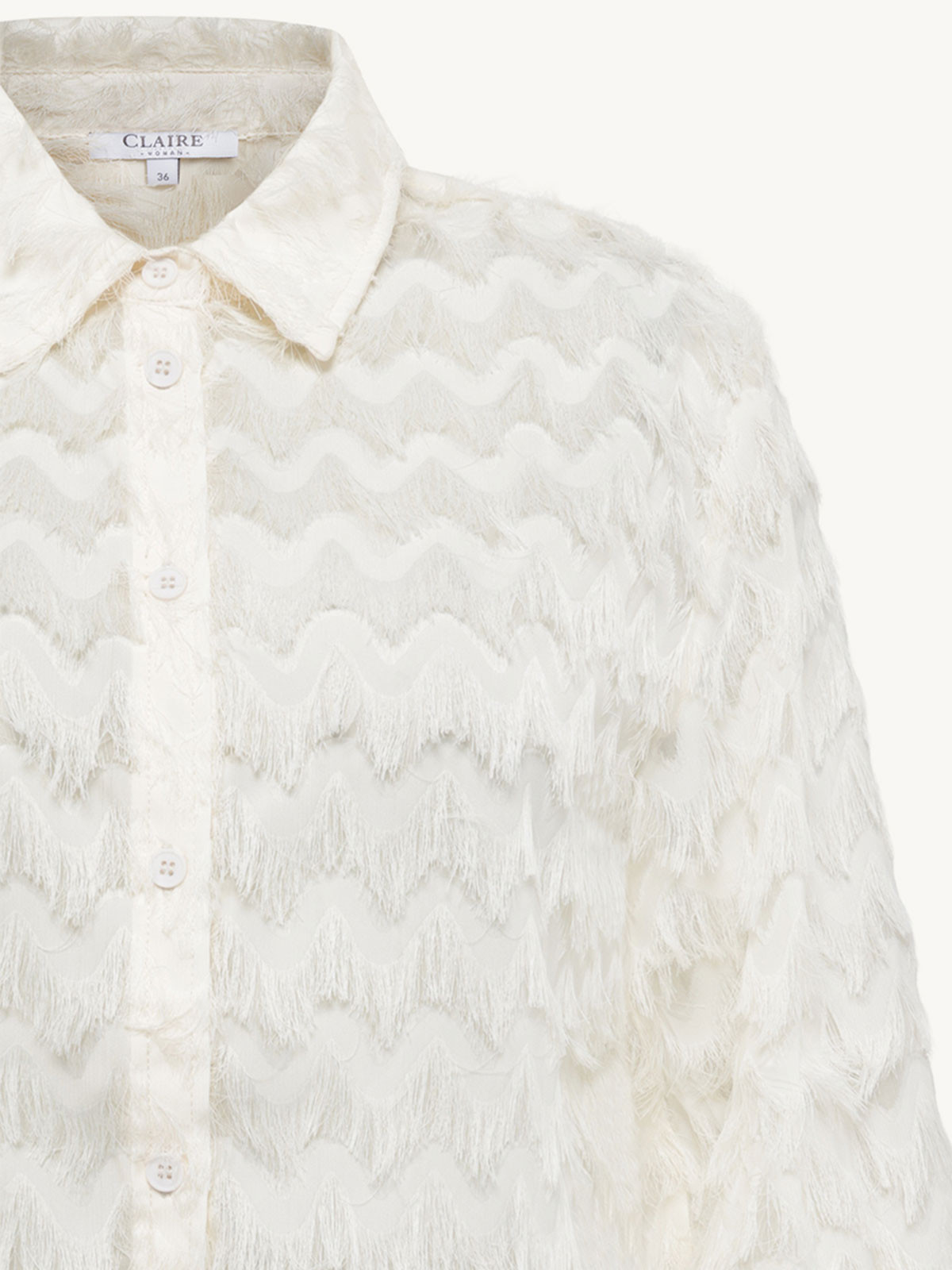Superläcker blus från Claire Woman där tyget har fransar i vågmönster. Modellen är rak och med klassisk skjortkrage. Ärmen är vid och trekvartslång med smal manschett i nederkant.