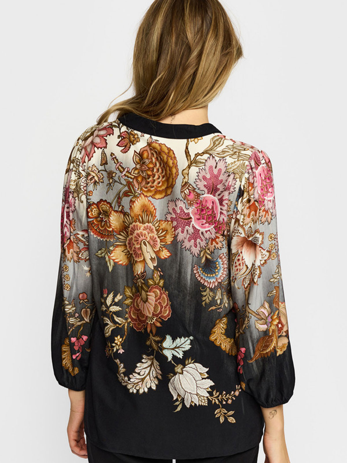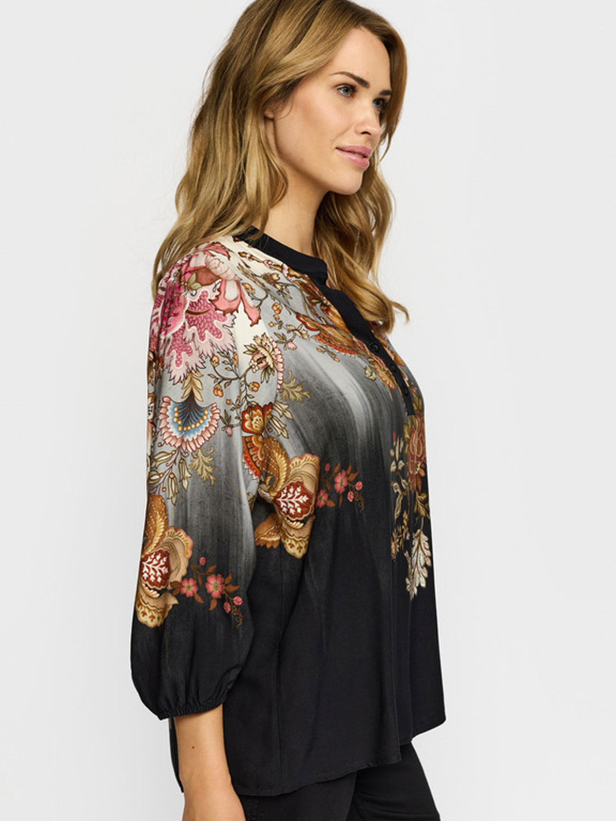 Vackert mönstrad viskosblus från 2-BIZ! Modellen är rak och vid och har rundad hals med V-formad öppning. Ärmen har puff och är av trekvartslängd med en resår i nederkant.