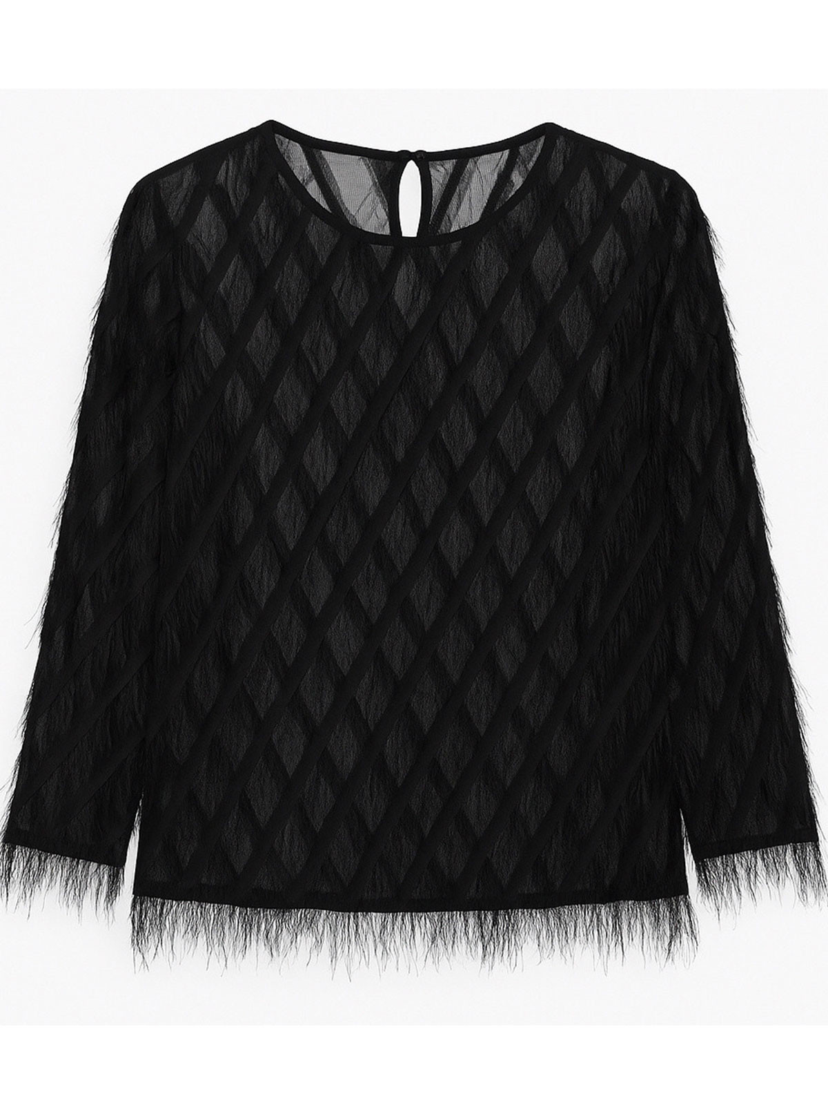 Urläcker festblus från 2-BIZ med tunna fransar i tvärställda ränder på ett semitransparent tyg. Modellen är rak och har rundad hals med knäppning i nacken. Ärmen är trekvartslång med resår vid avslut. Rak nederkant för en tuff siluett.