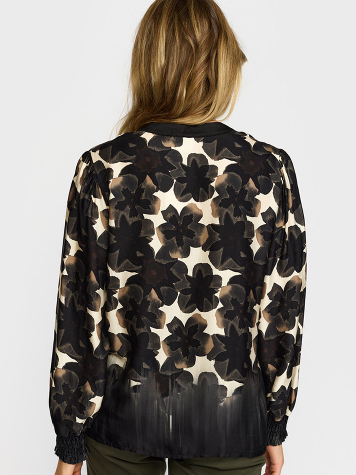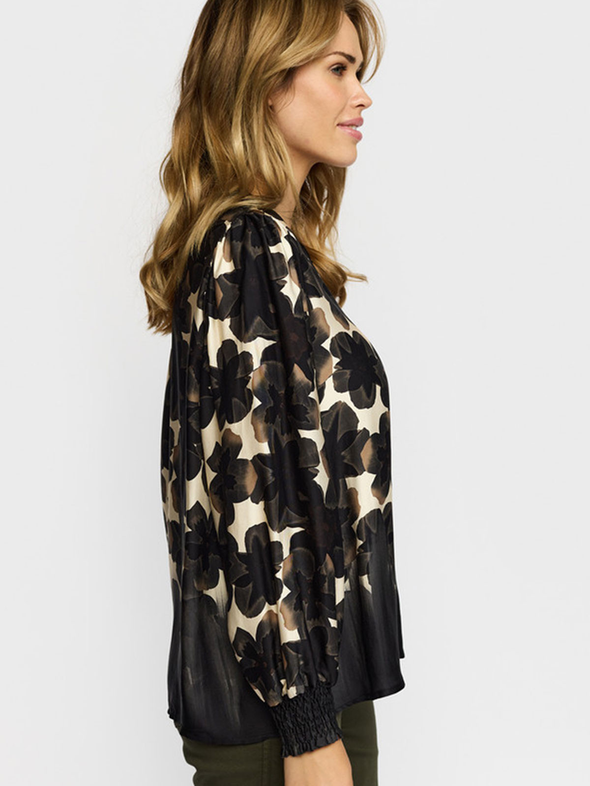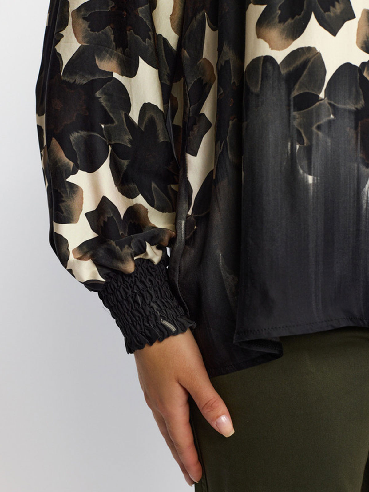 Underbar satinblus från 2-BIZ i deras klassiska viskos- och sidenmix (70%, 30%). Modellen är rak och har rundad hals och knäppning halva vägen fram. Ärmen har puff och är hellång med bred smock i nederkanten.