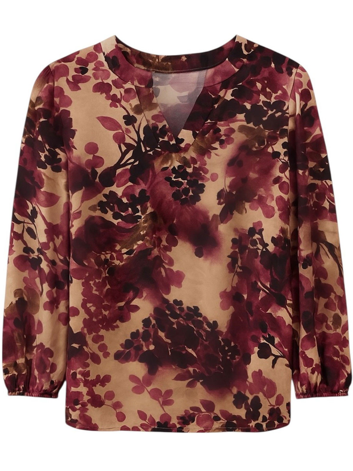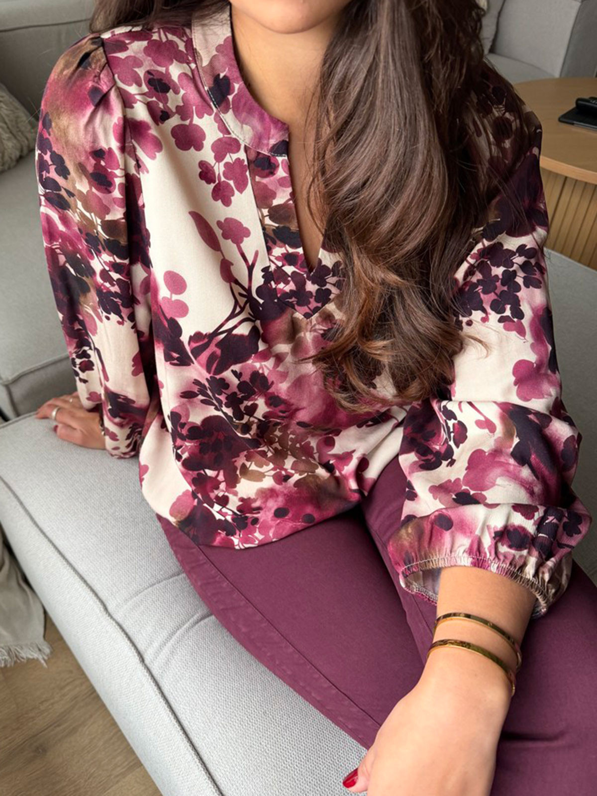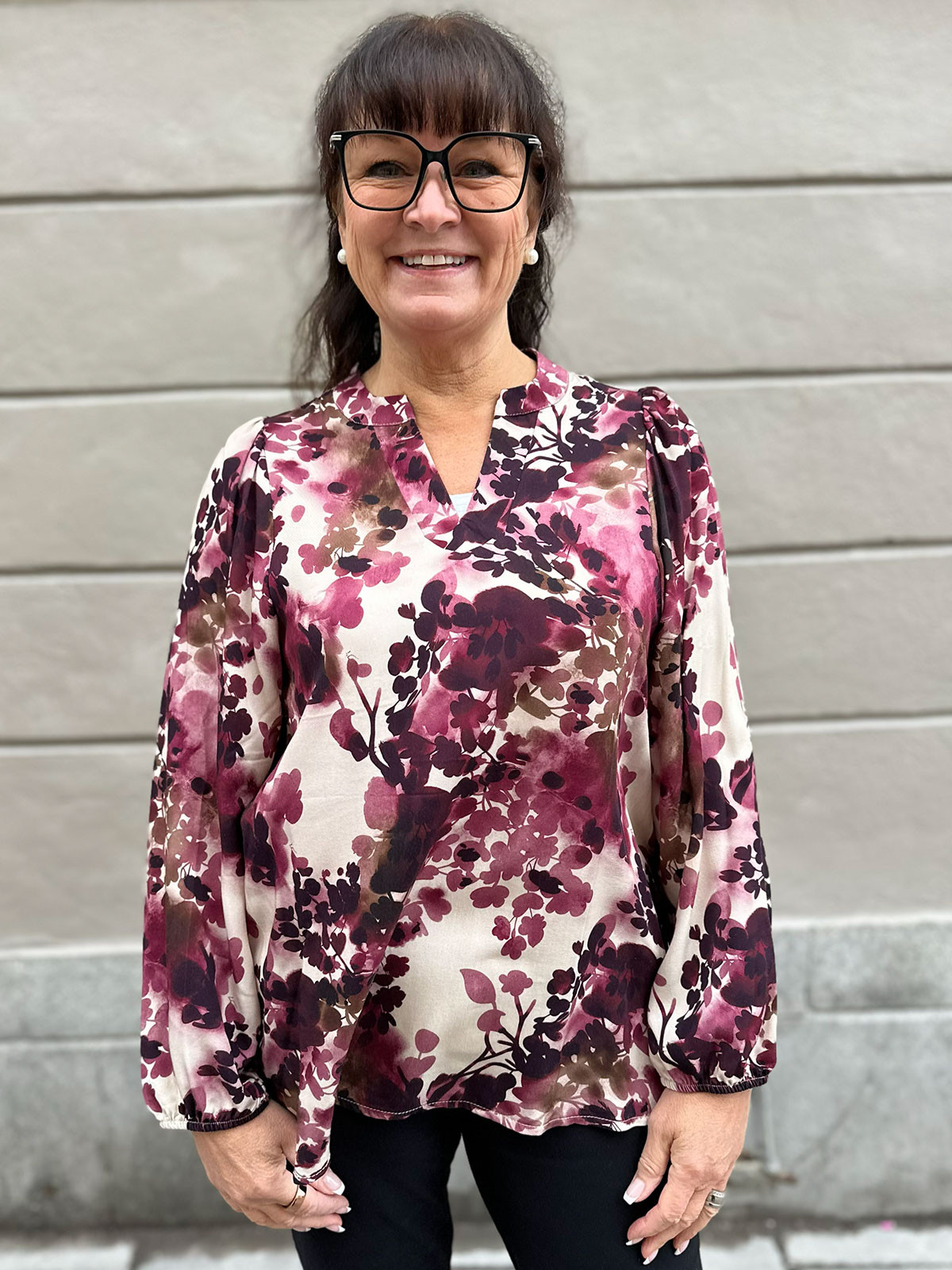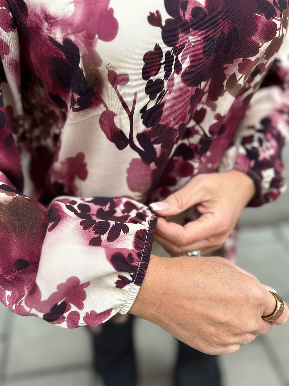 Vacker viskosblus från 2-BIZ i ett härligt mönster. Modellen är rak och vid, har rundad hals med V-formad öppning och hellång ärm med puff och resår i nederkant.