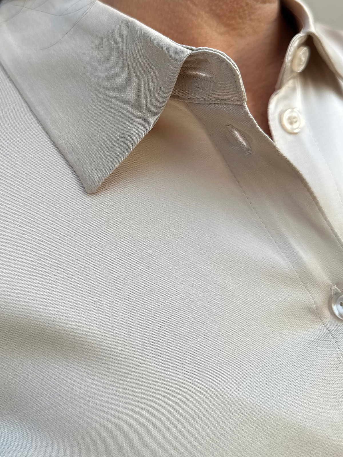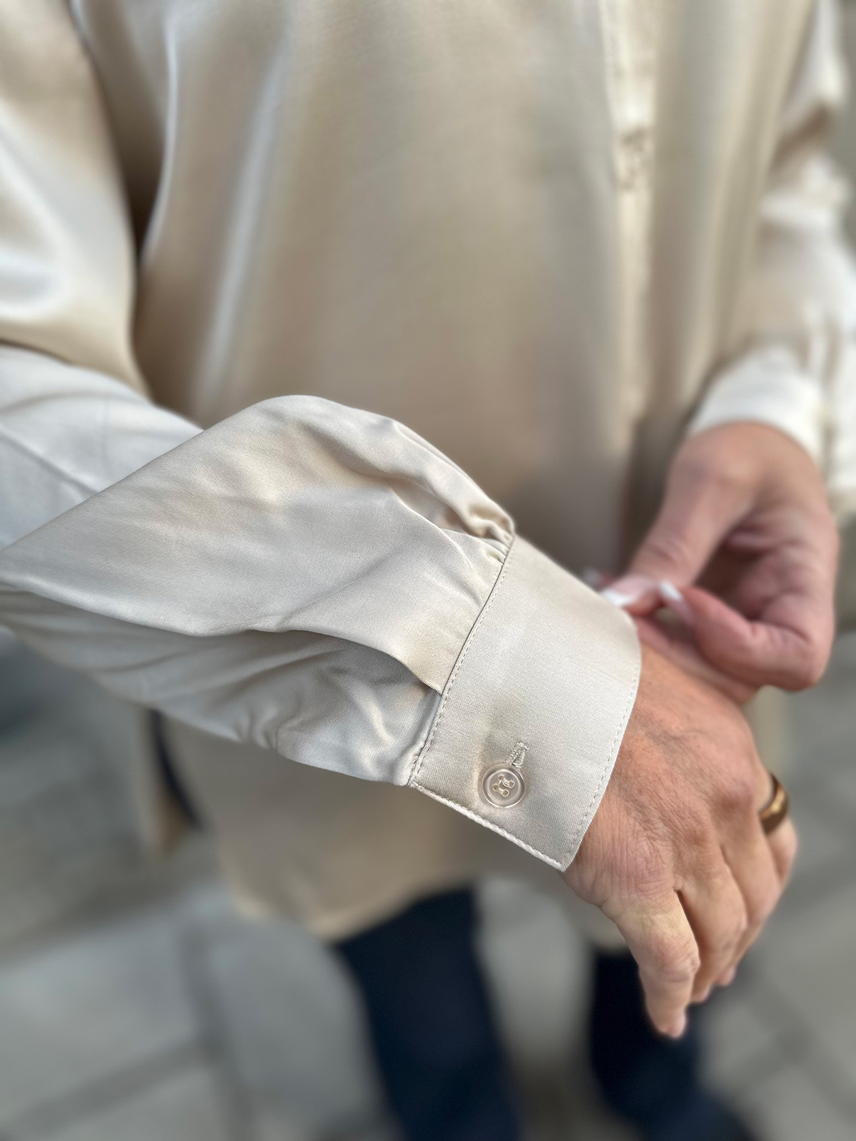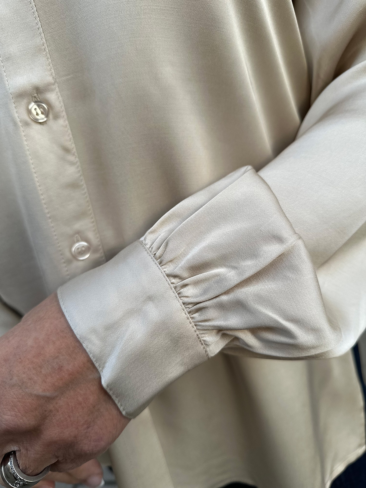 Elegant satinblus från Claire Woman i klassiskt snitt. Modellen har skjortkrage, hellång ärm med manschett, knäppning med pärlemoknappar och mjukt rundad nederkant och slitsar i sidorna.