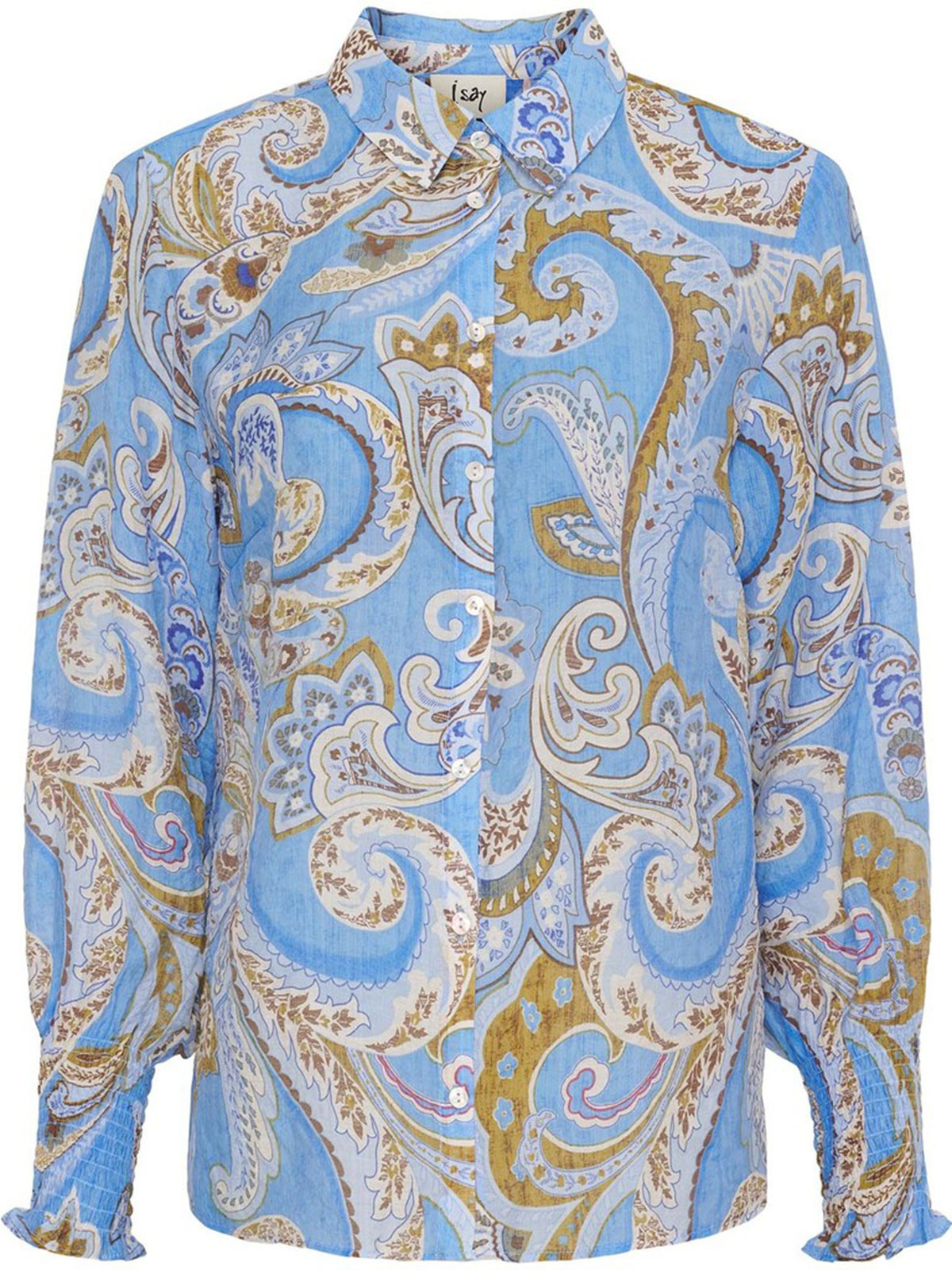 Härlig blus från Isay i en vackert himmelsblå färg. Modellen har skjortkrage, pärlemoknappar och bred smock på den hellånga ärmen. Mjukt rundad nederkant för en fin siluett.
