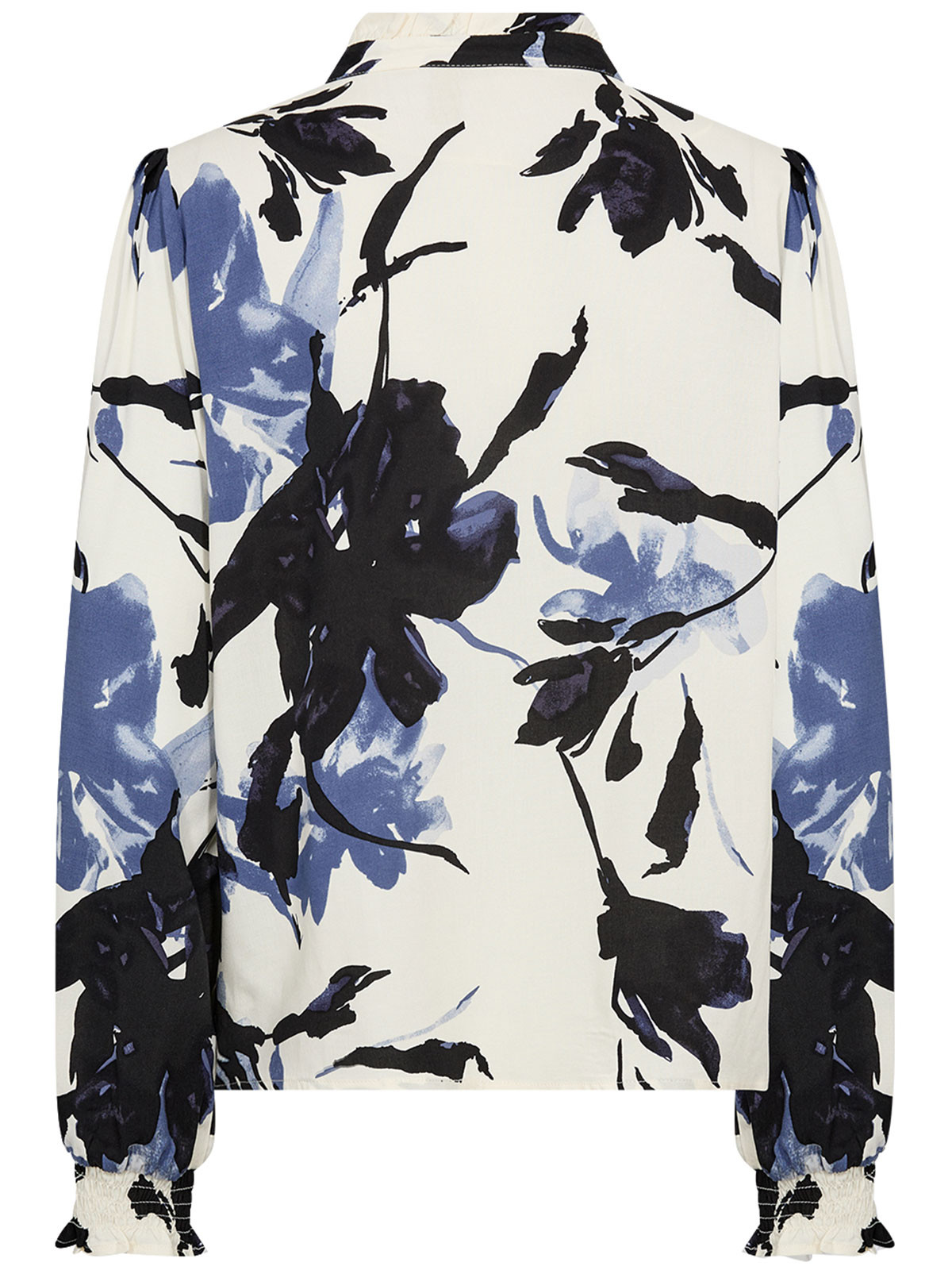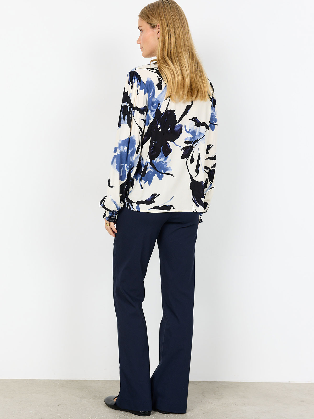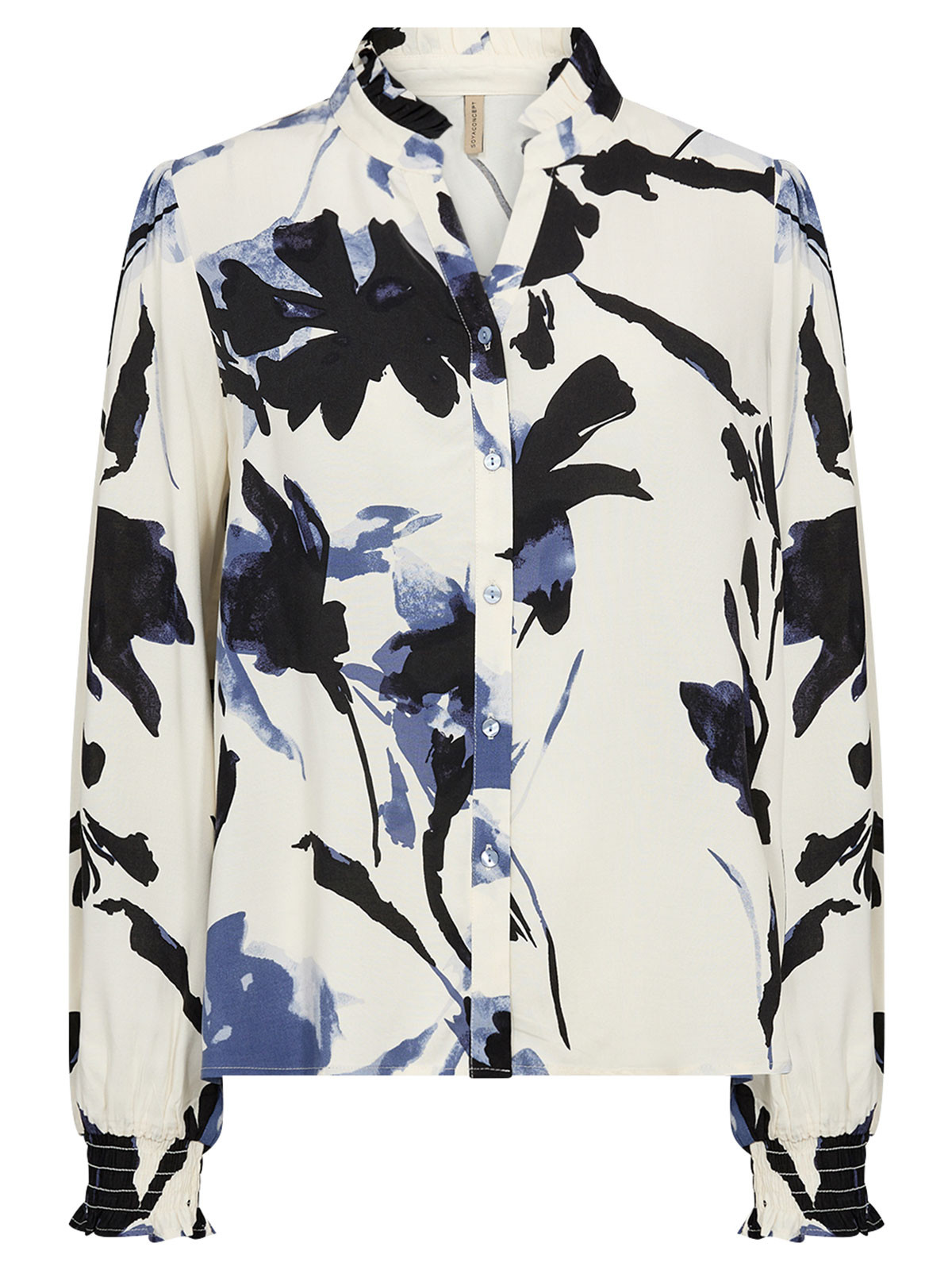 Söt viskosblus från SoyaConcept i ett fint abstrakt mönster. Modellen har hellång ärm med smock i nederkant, har rundad hals med liten ståkrage av volang, V-formad öppning fram ner till knapprad.