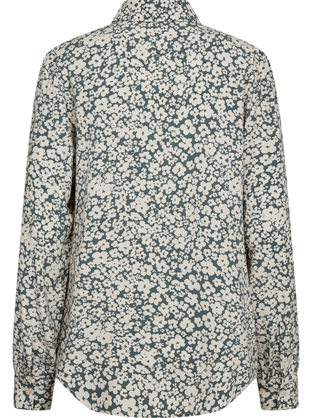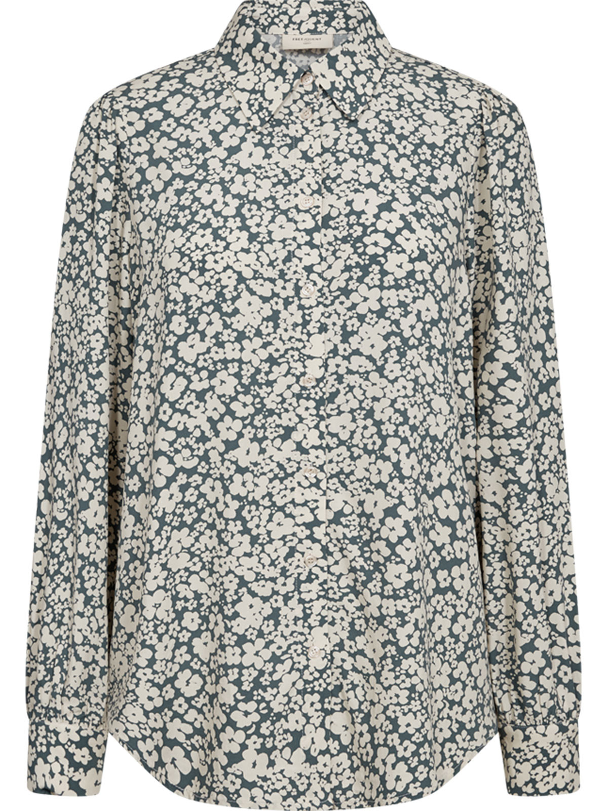 Skön och ledig viskosblus från FreeQuent i ett fint blommönster. Modellen är klassisk med skjortkrage, puff på den hellånga ärmen och manschett i nederkant. Knäppning hela vägen fram och mjukt rundad nederkant.