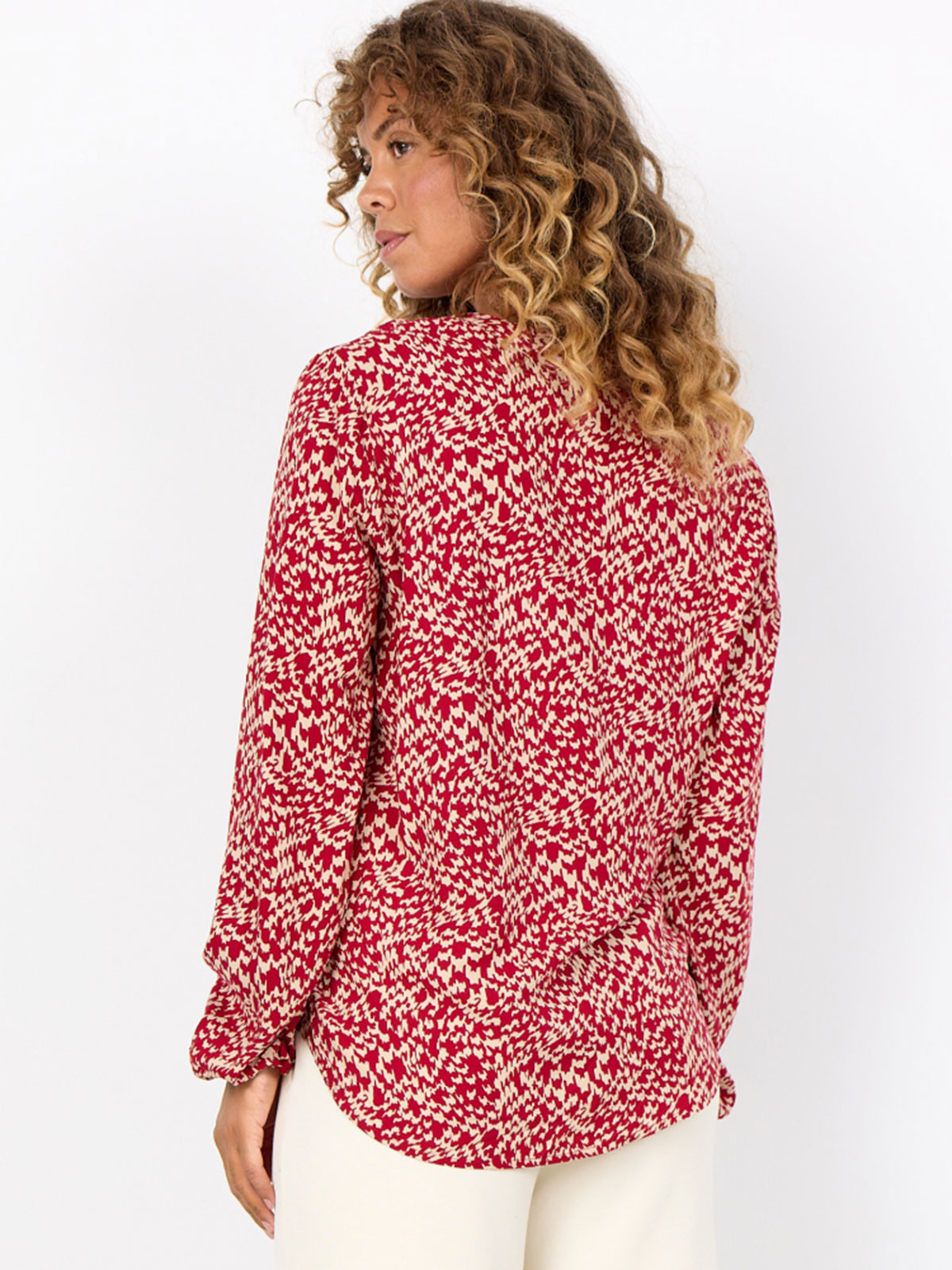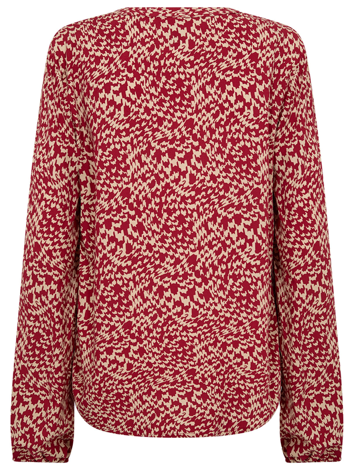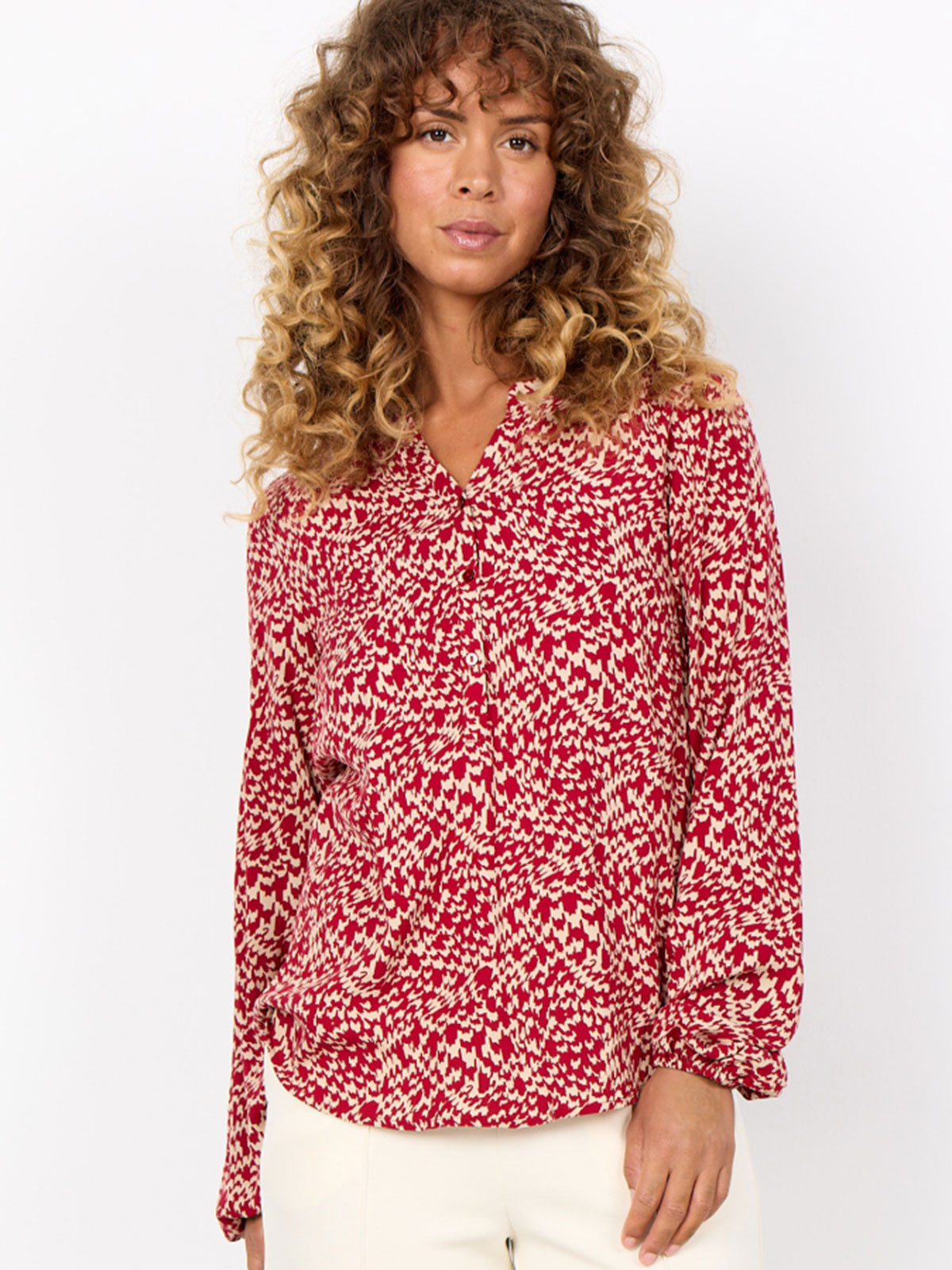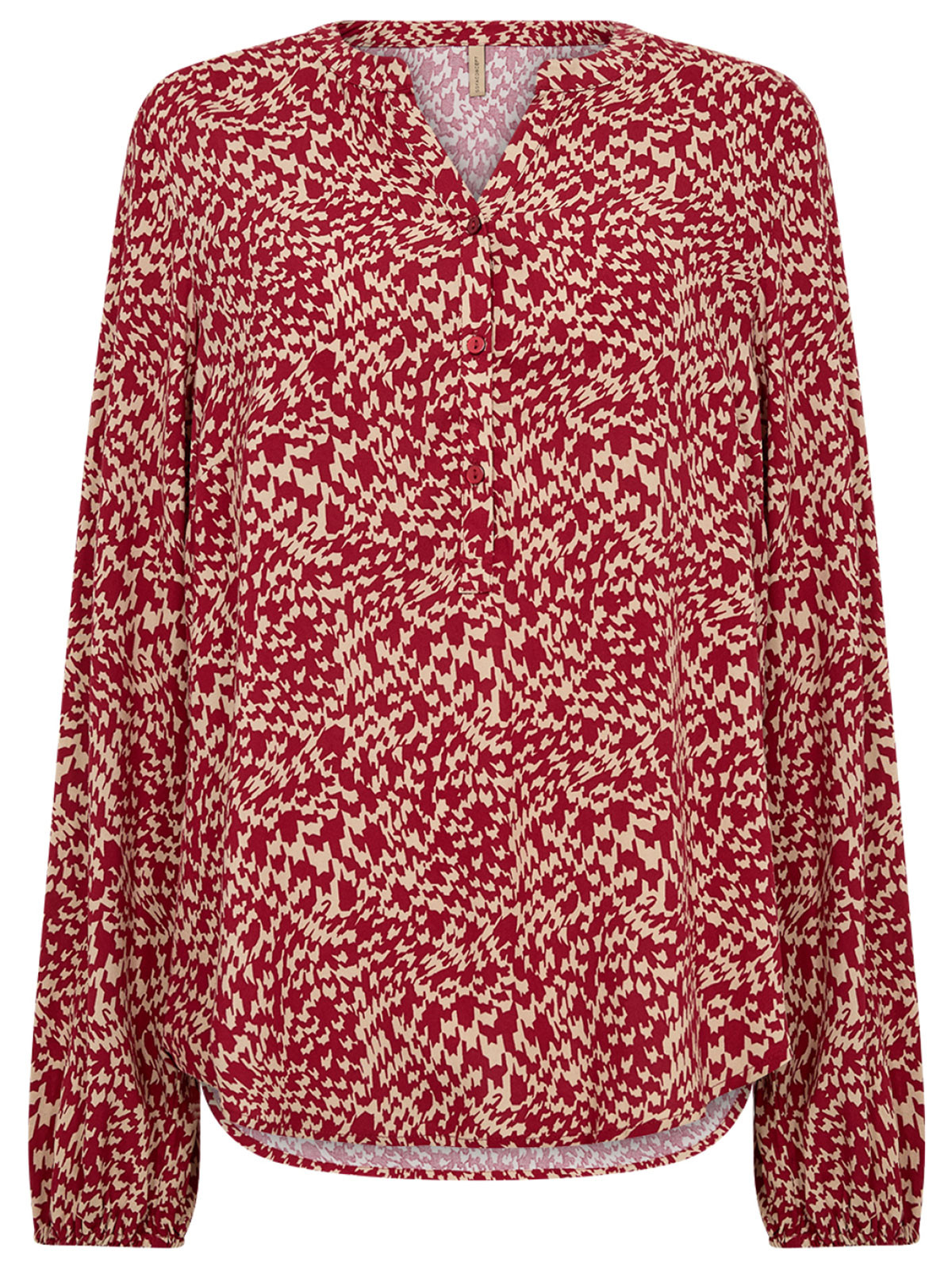 Skön viskosblus från SoyaConcept med ett grafiskt mönster i rött och beige. Modellen har en V-ringad hals med kort knäppning framtill, långa vida ärmar med elastiska muddar. Nederkanten är mjukt rundad.