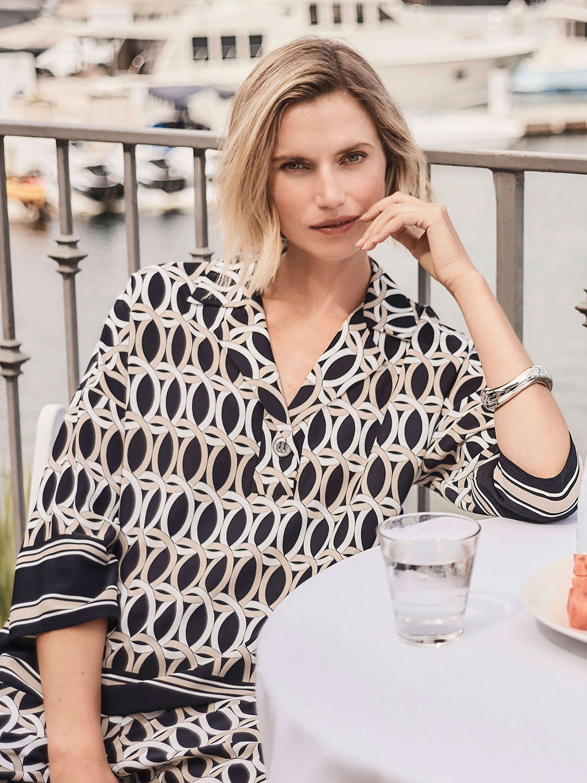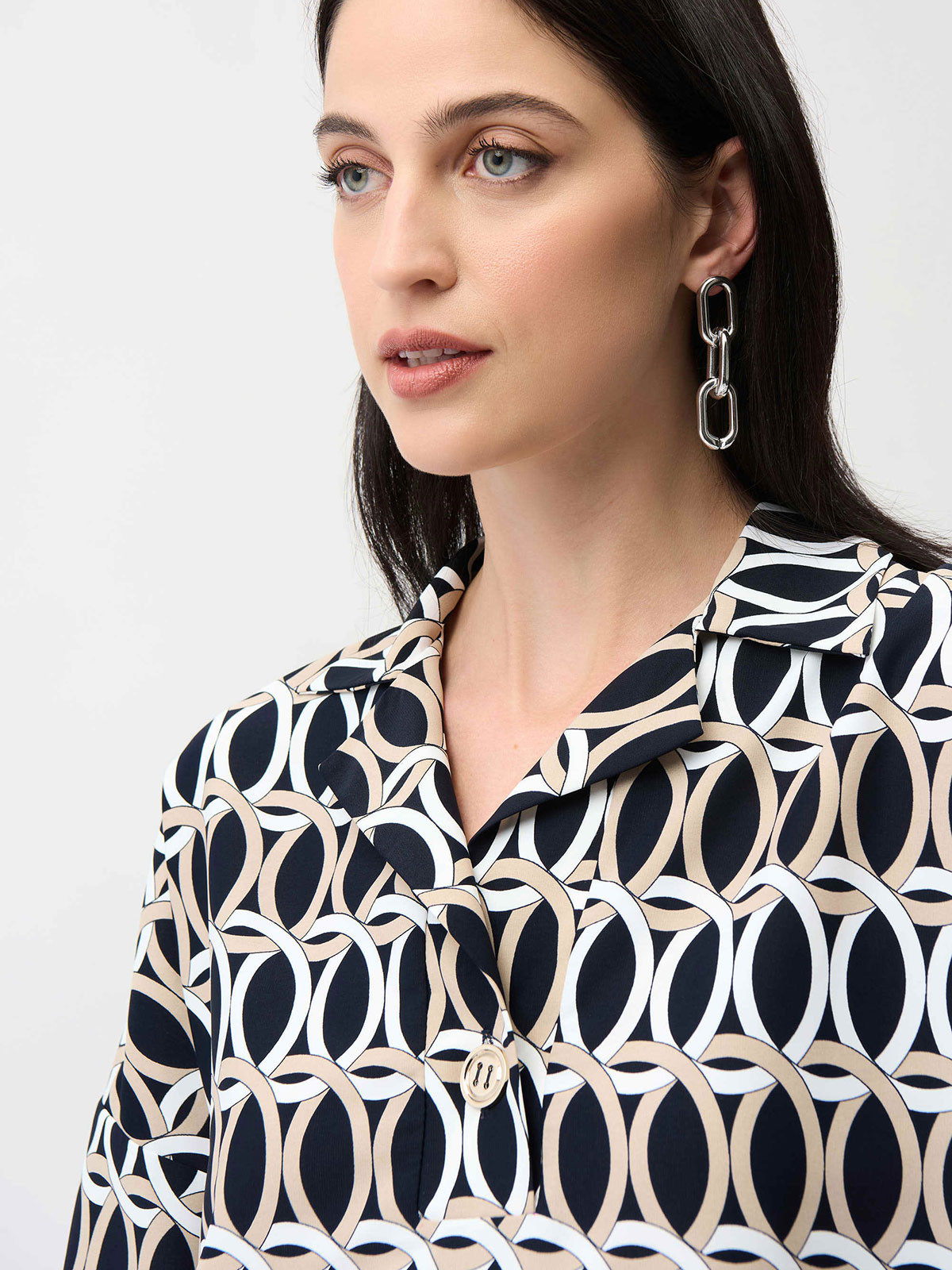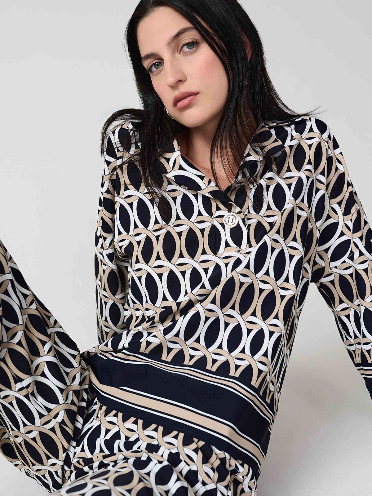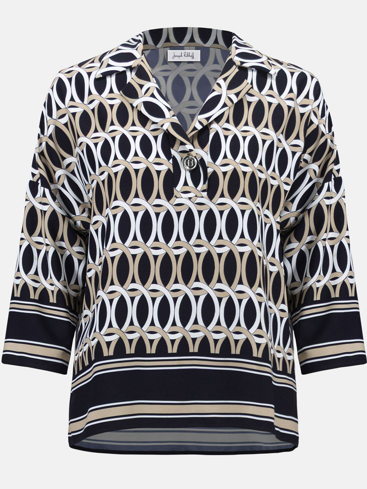 Denna mönstrade blus kombinerar klassisk elegans med ett modernt uttryck. Det grafiska ringmönstret i svart, beige och vitt ger ett stilrent och exklusivt intryck som är lätt att matcha. Blusen har en avslappnad passform, trekvartsärm och en v-ringad hals med dekorativ knapp, vilket skapar en smickrande silhuett och en sofistikerad helhet.