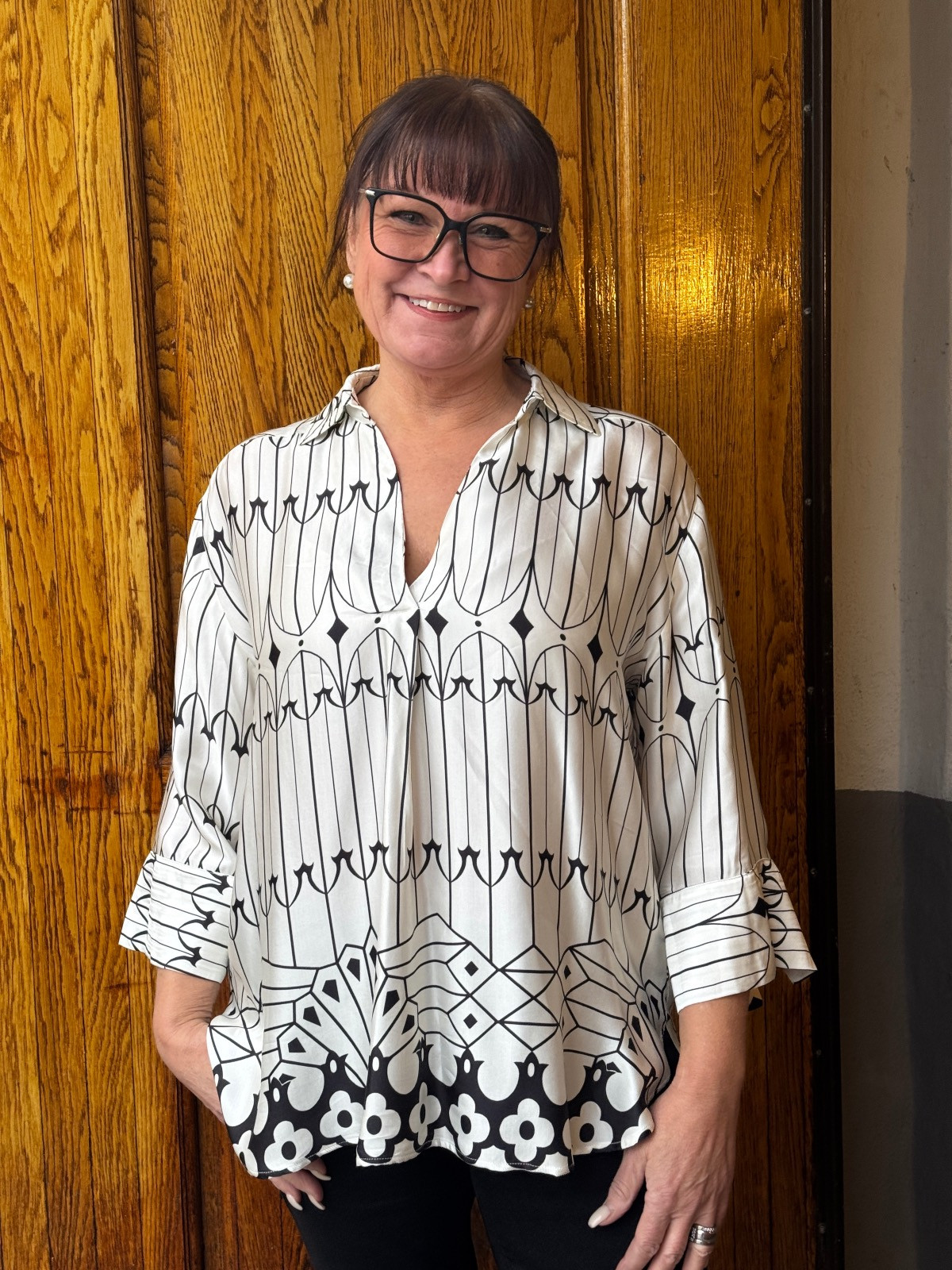 Taliga från Tinta Style kombinerar ett grafiskt uttryck med en elegant och lättburen silhuett. Det dekorativa mönstret i svart på ljus botten ger plagget karaktär och ett modernt, stilrent intryck som känns både tidlöst och personligt.
