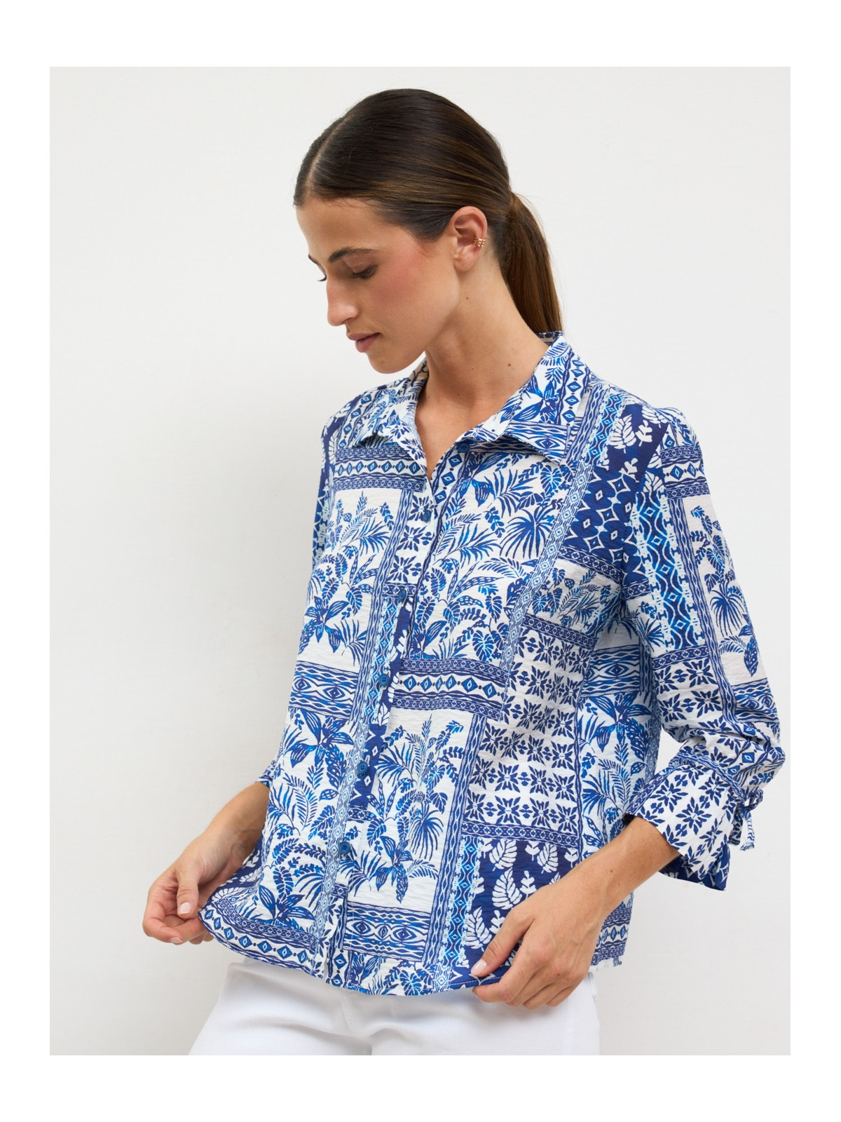 Blusen har en klassisk krage, knappslå framtill och trekvartsärm med lätt vidd som ger ett mjukt och feminint fall. Passformen är avslappnad och bekväm, vilket gör den enkel att bära både till vardags och vid mer uppklädda tillfällen. Styla den med ljusa byxor eller jeans för en fräsch look, eller kombinera med enfärgade plagg för att låta mönstret stå i fokus. En mångsidig favorit som fungerar säsong efter säsong.