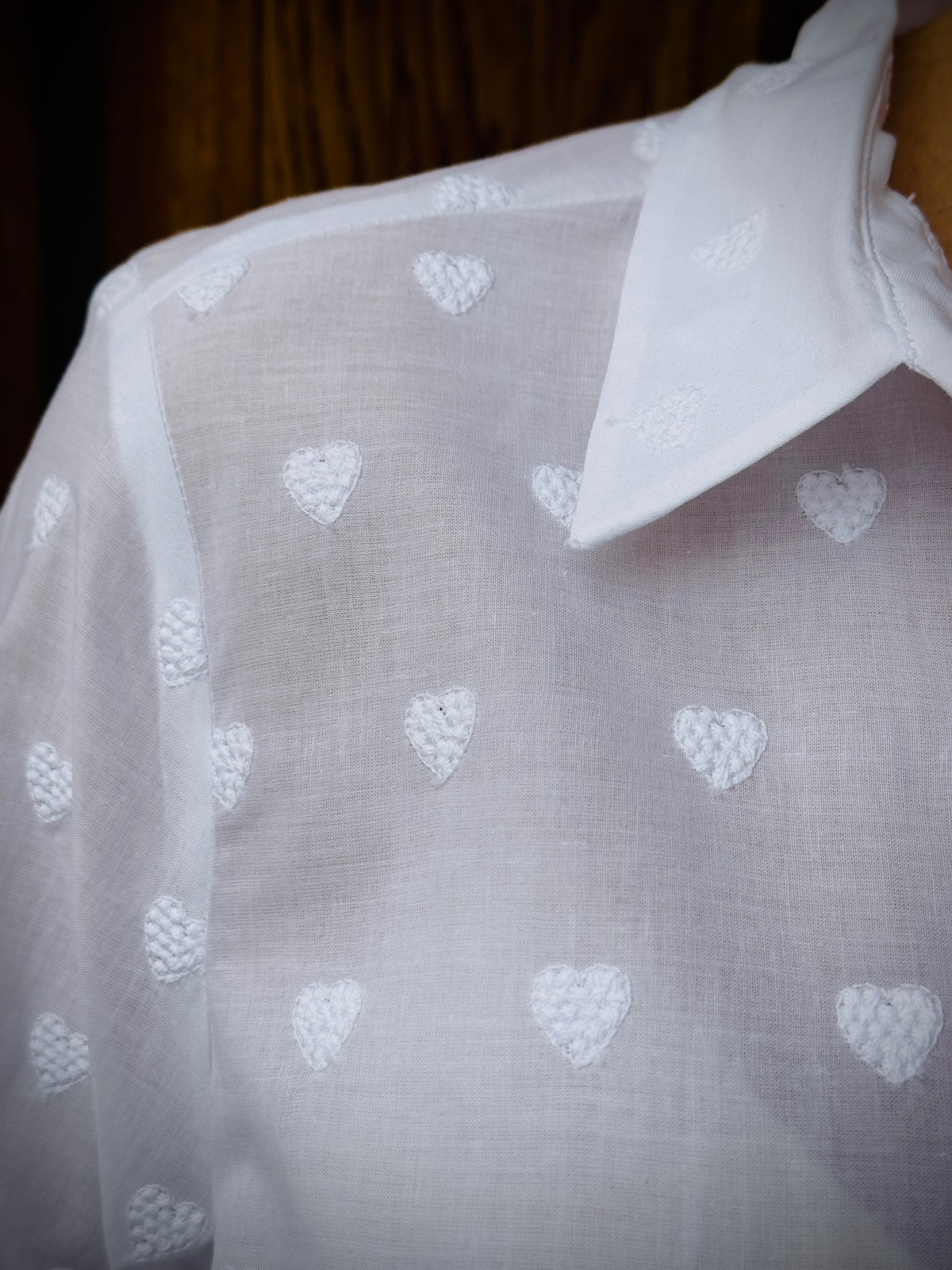 Söt och vacker blus med broderade hjärtan på, tunn i tyget, trekvartsärm.