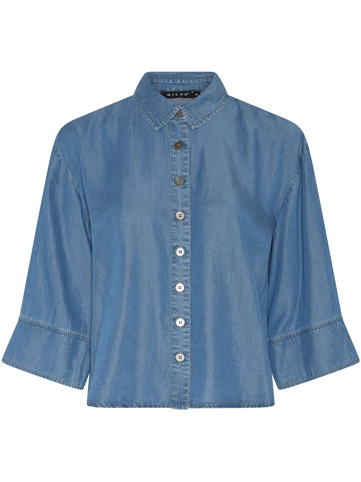 Söt denimblus från Micha i 100% lyocell. Modellen är rak och vid med skjortkrage och trekvartslång ärm. Nederkanten är rak och lite croppad vilket ger en tuff siluett.