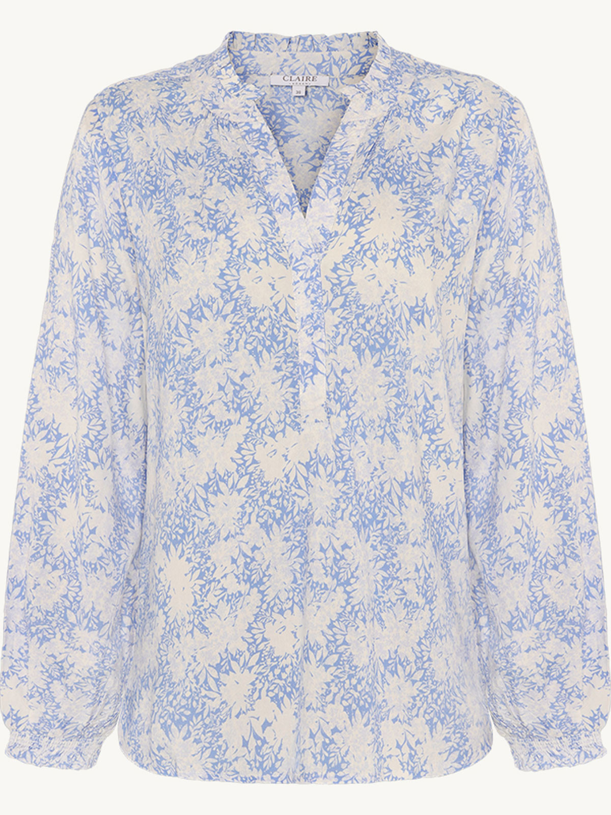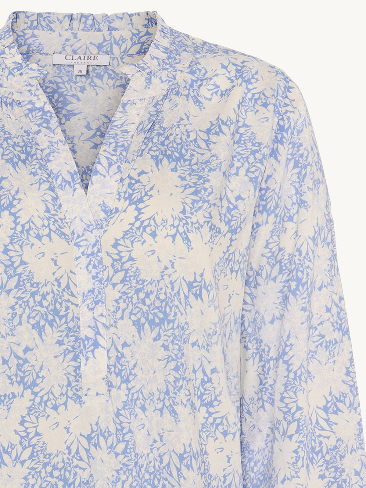 Söt viskosblus från Claire Woman. Modellen är vid med rundad hals med kort volangkant. Framtill finns en V-formad öppning. Den vida ärmen samlas ihop i en smal smock som ger volangkant även där.