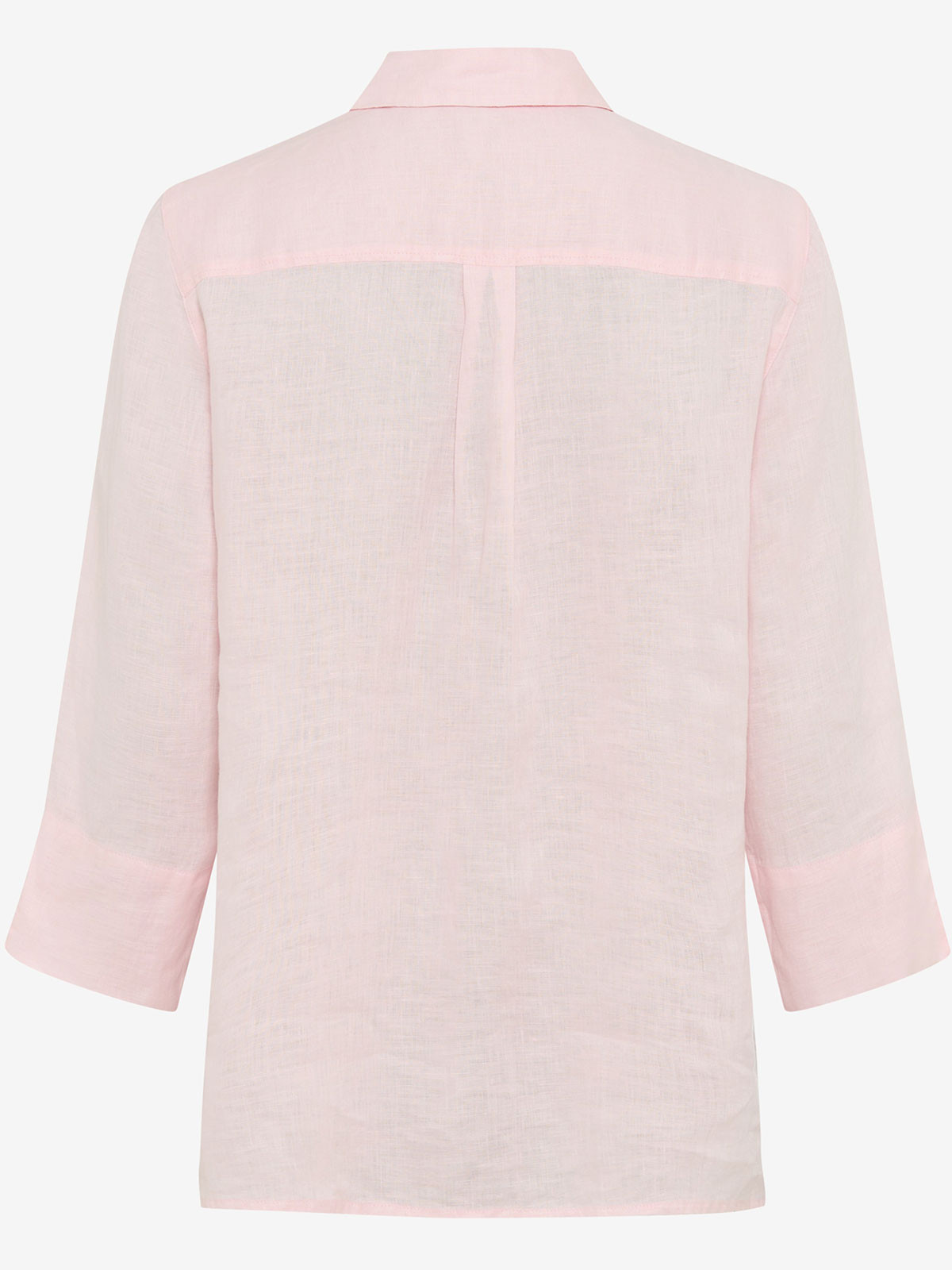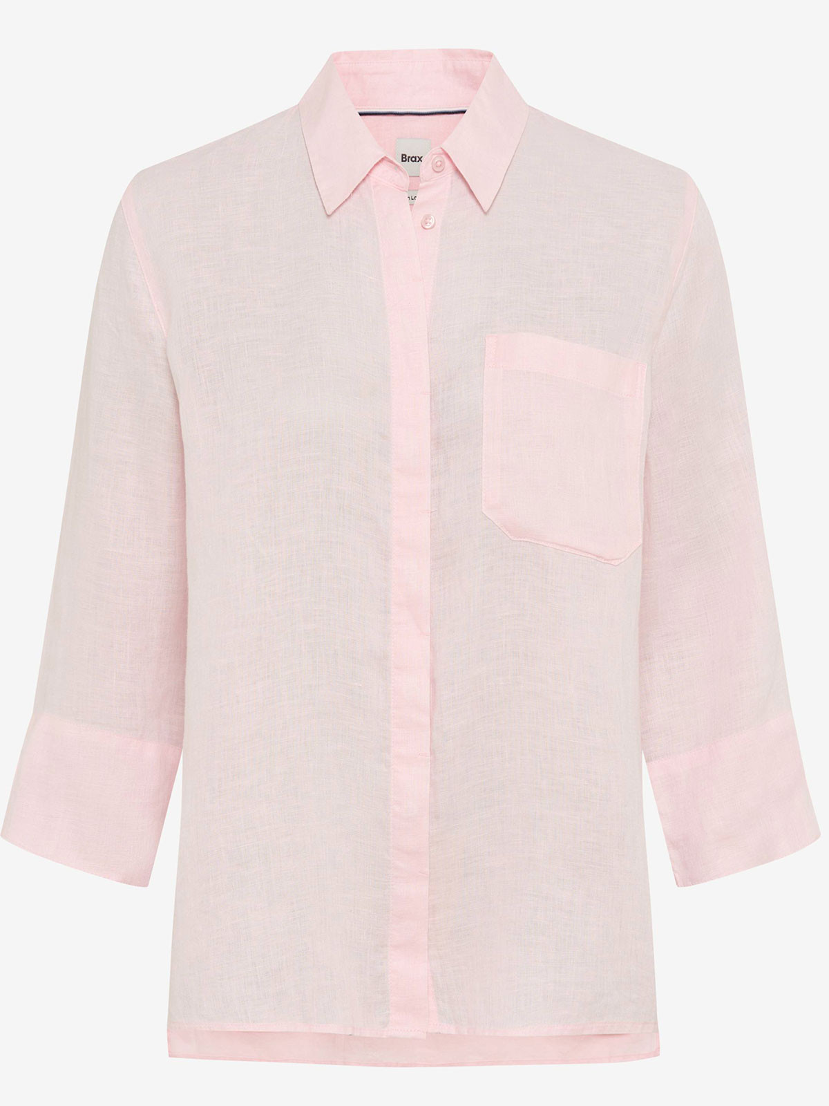 Elegant linneblus från Brax med knäppning hela vägen fram. Modellen har skjortkrage, dold knäppning och ärmen är trekvartslång med slejf. Blusen är lite längre bakoch går ner snyggt över rumpan.