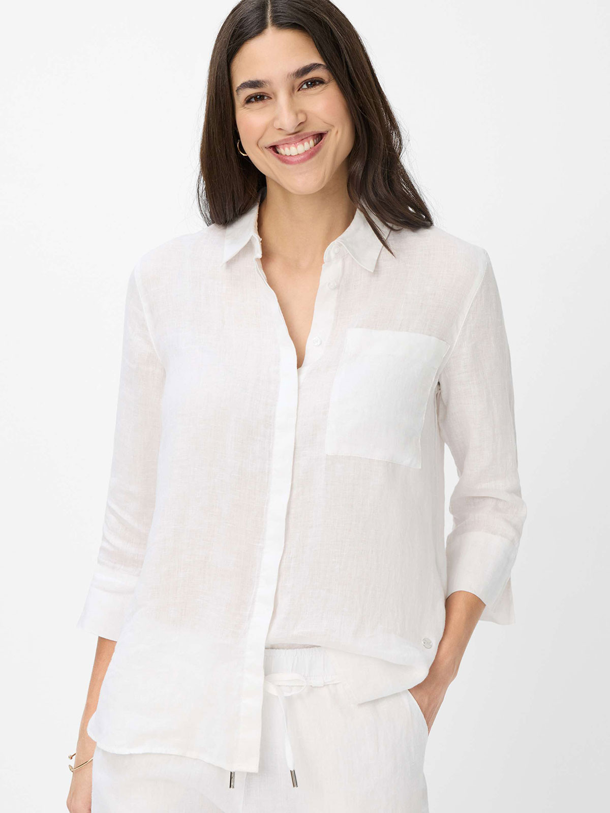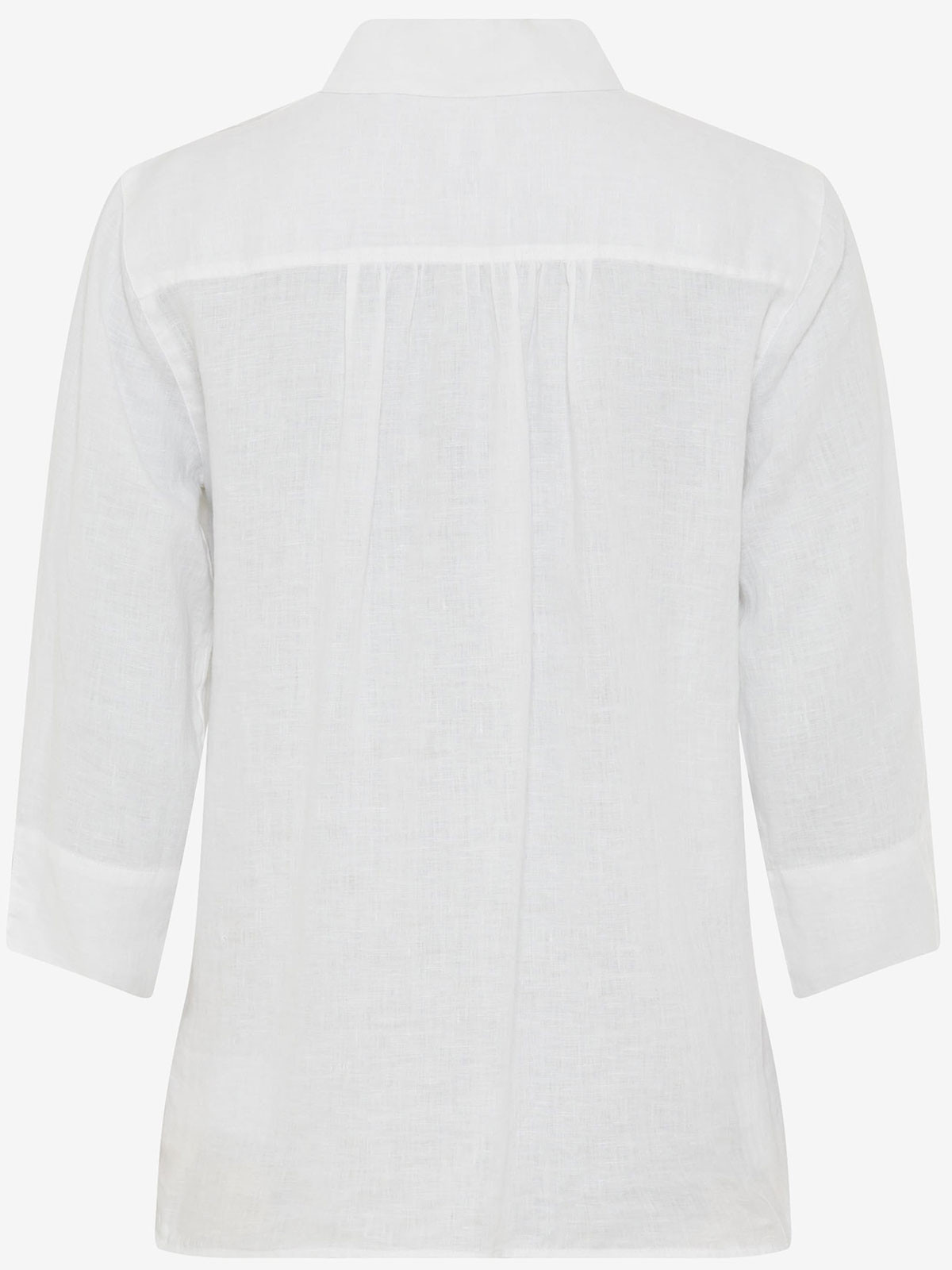 Elegant linneblus från Brax med knäppning hela vägen fram. Modellen har skjortkrage, dold knäppning och ärmen är trekvartslång med slejf. Blusen är lite längre bakoch går ner snyggt över rumpan.