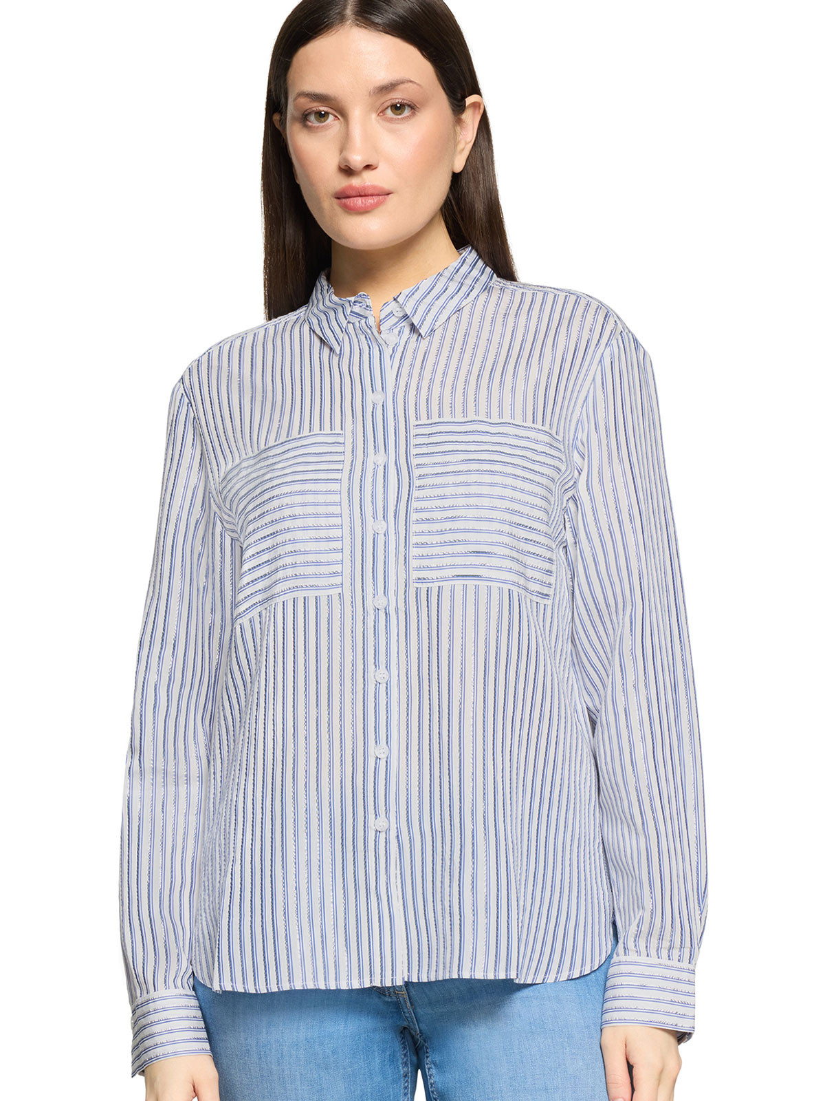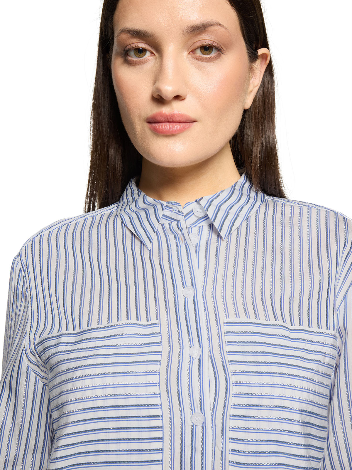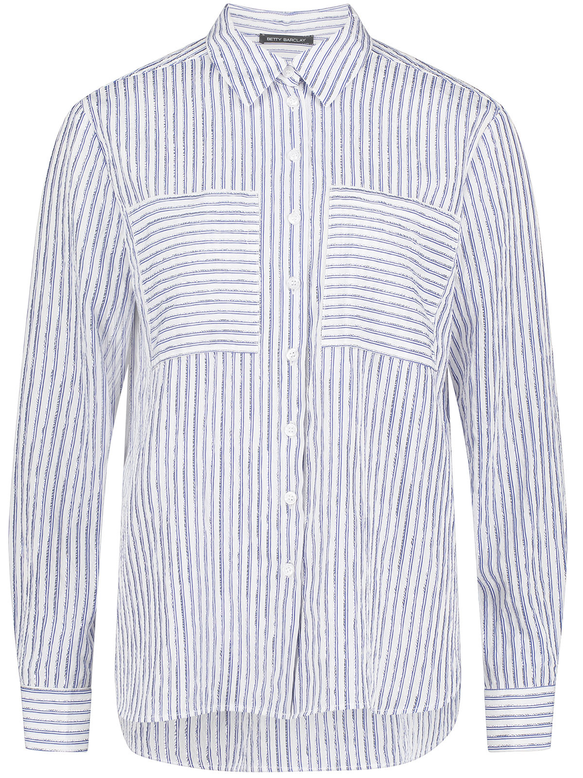 Härlig skjorta från Betty Barclay med blå och silverlurexränder som ger extra lyster. Modellen är klassisk med skjortkrage, knäppning, hellång ärm med manschett och påsydda fickor på bröstet. Mjukt rundad nederkant och längre bak.