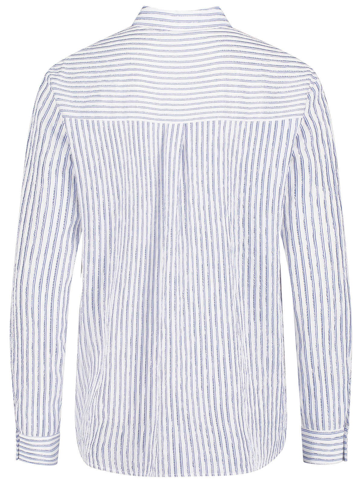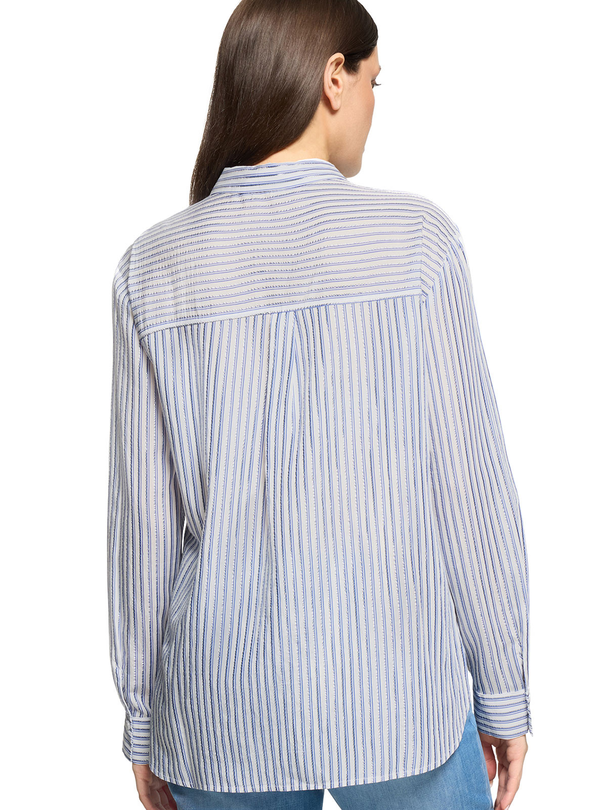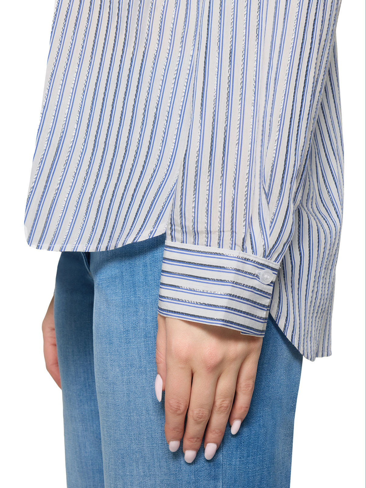 Härlig skjorta från Betty Barclay med blå och silverlurexränder som ger extra lyster. Modellen är klassisk med skjortkrage, knäppning, hellång ärm med manschett och påsydda fickor på bröstet. Mjukt rundad nederkant och längre bak.
