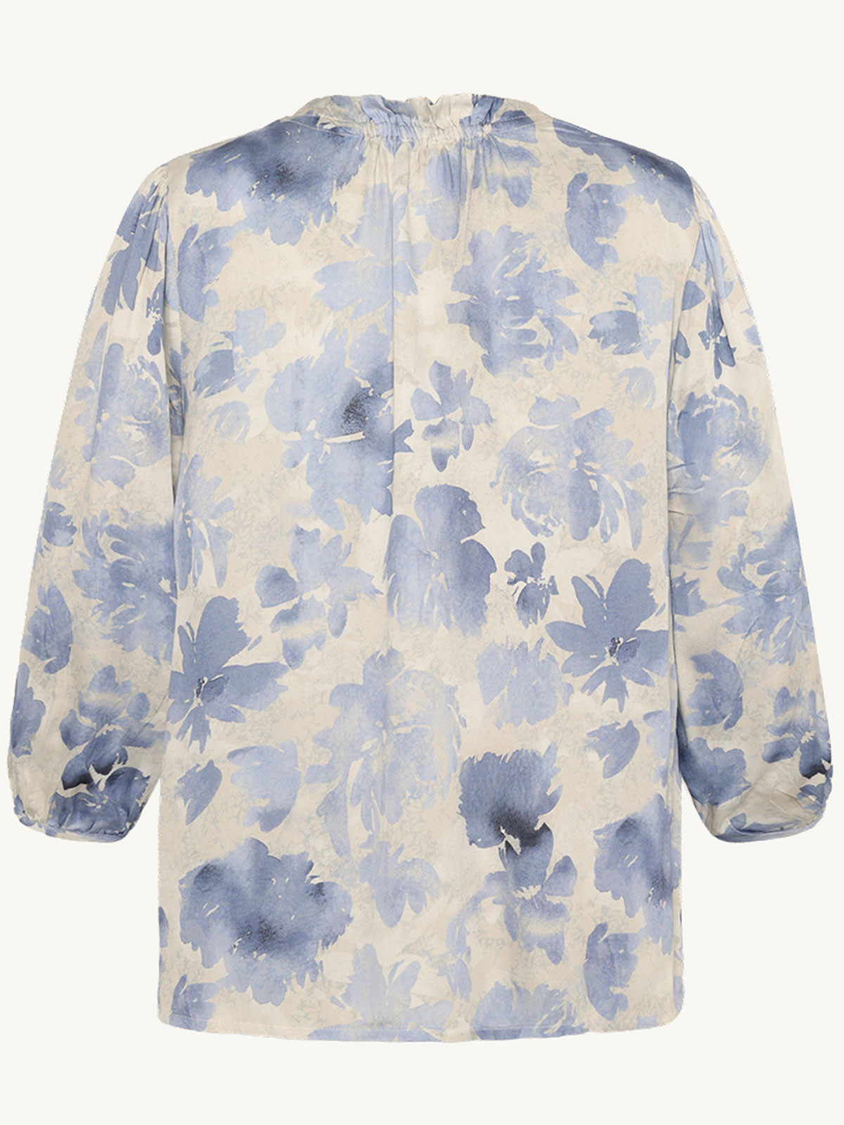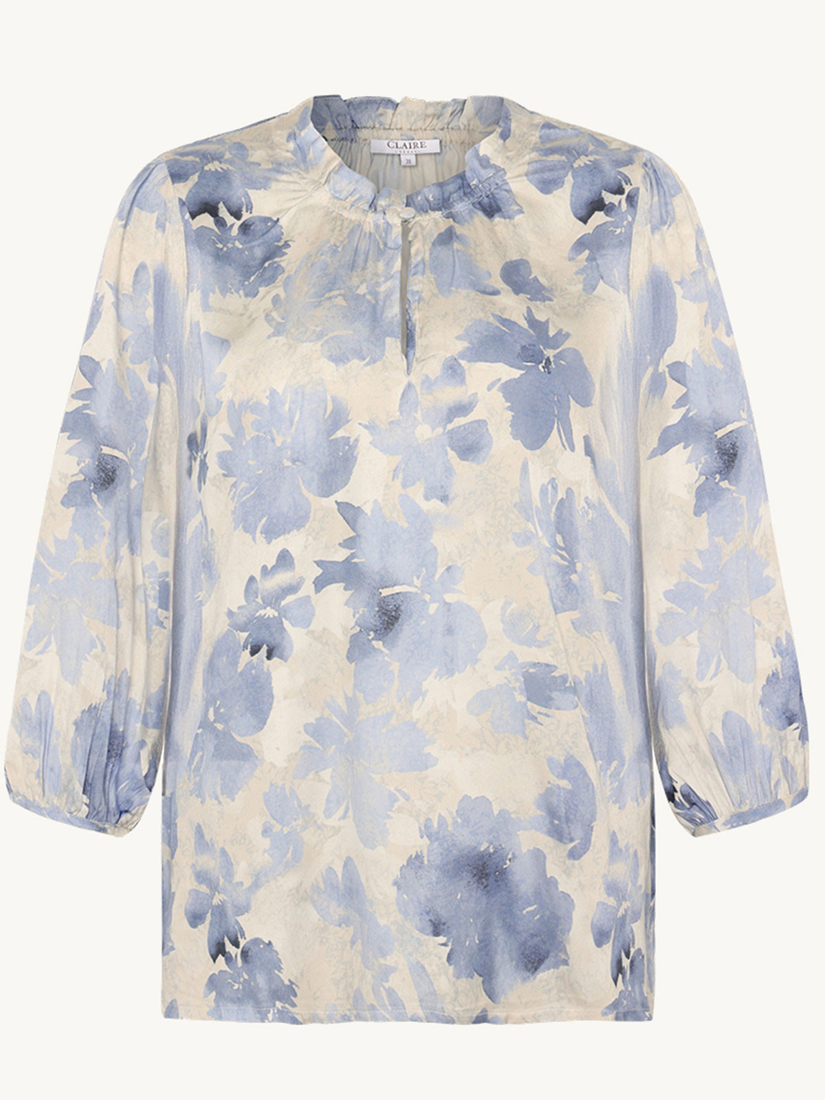 Söt satinblus från Claire Woman. Modellen är vid med rundad hals med kort volangkant. Framtill finns en V-formad öppning med en klädd knapp. Den vida, trekvartslånga ärmen samlas ihop i en smal kant. Rak nederkant med korta sprund i sidorna.