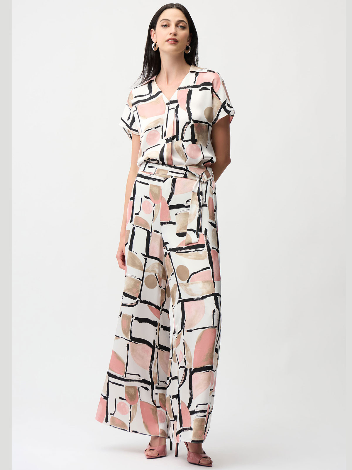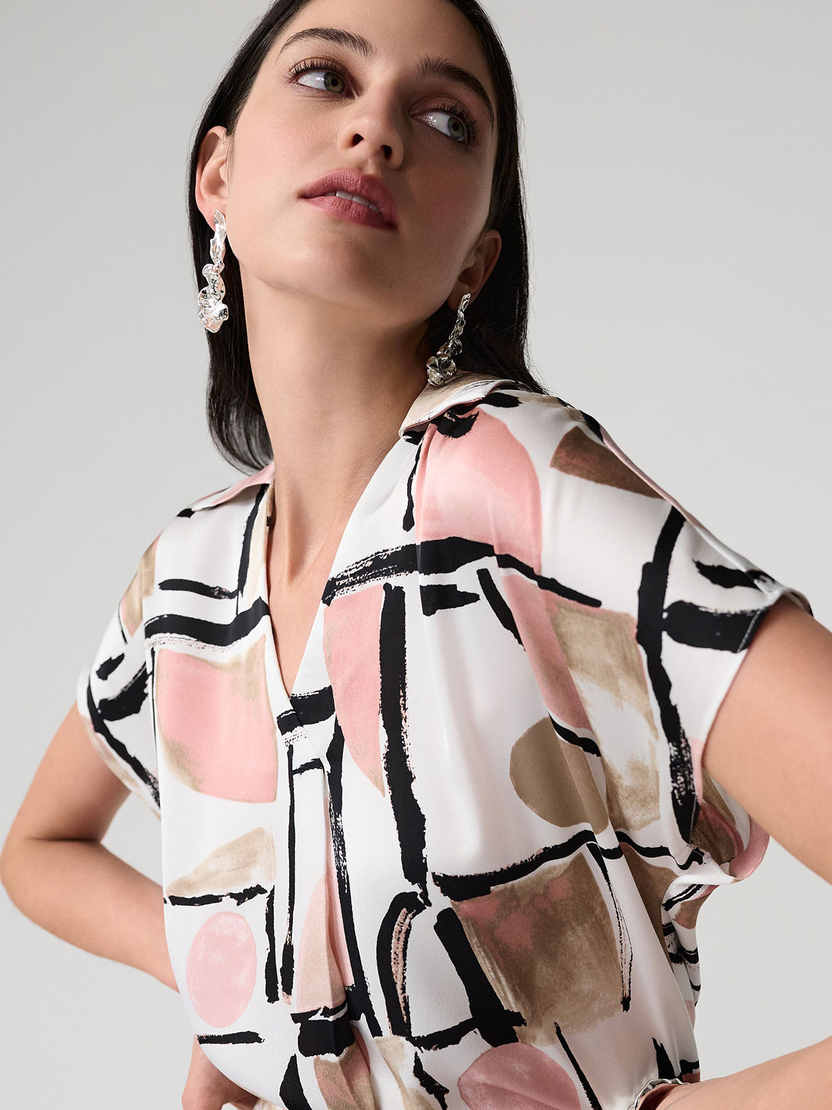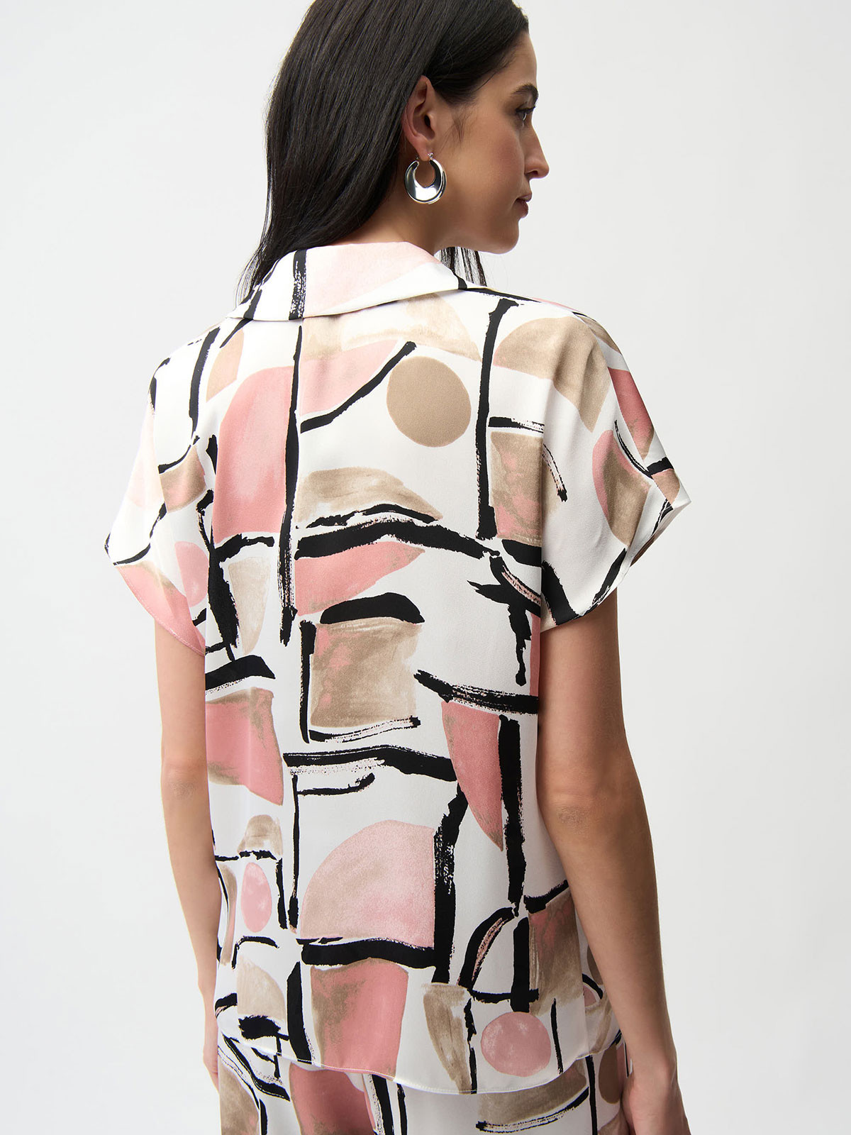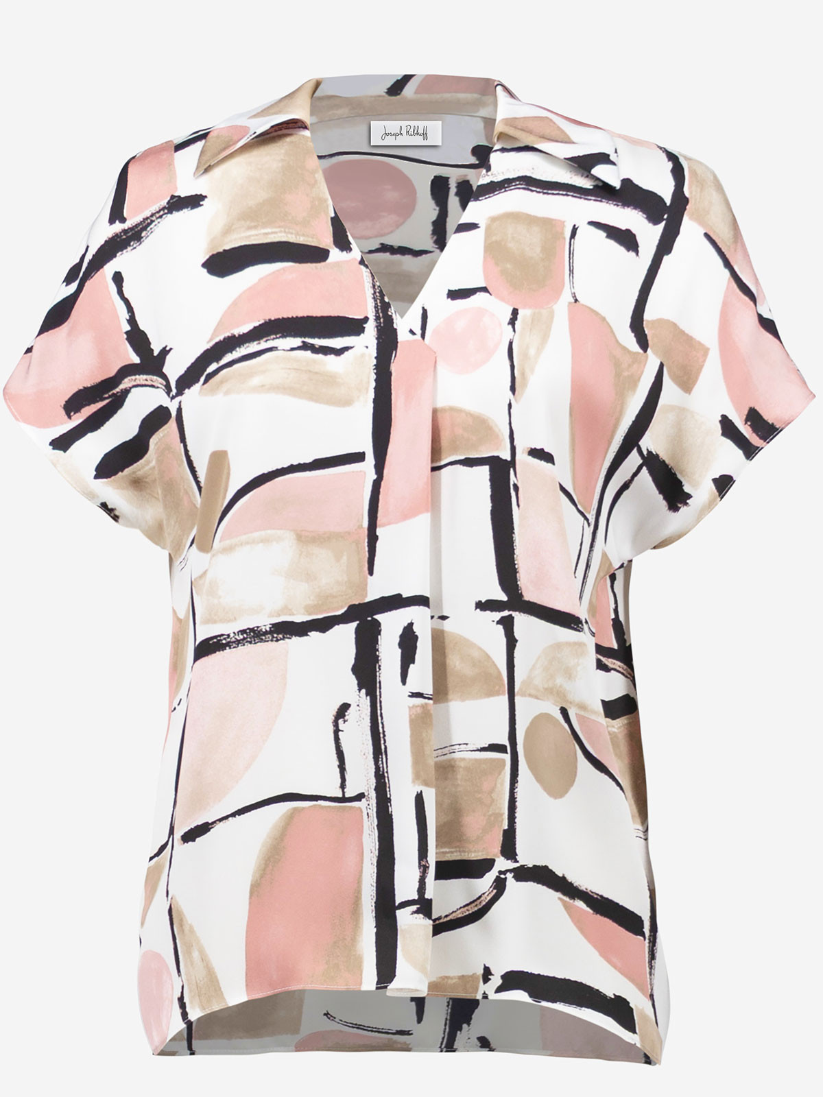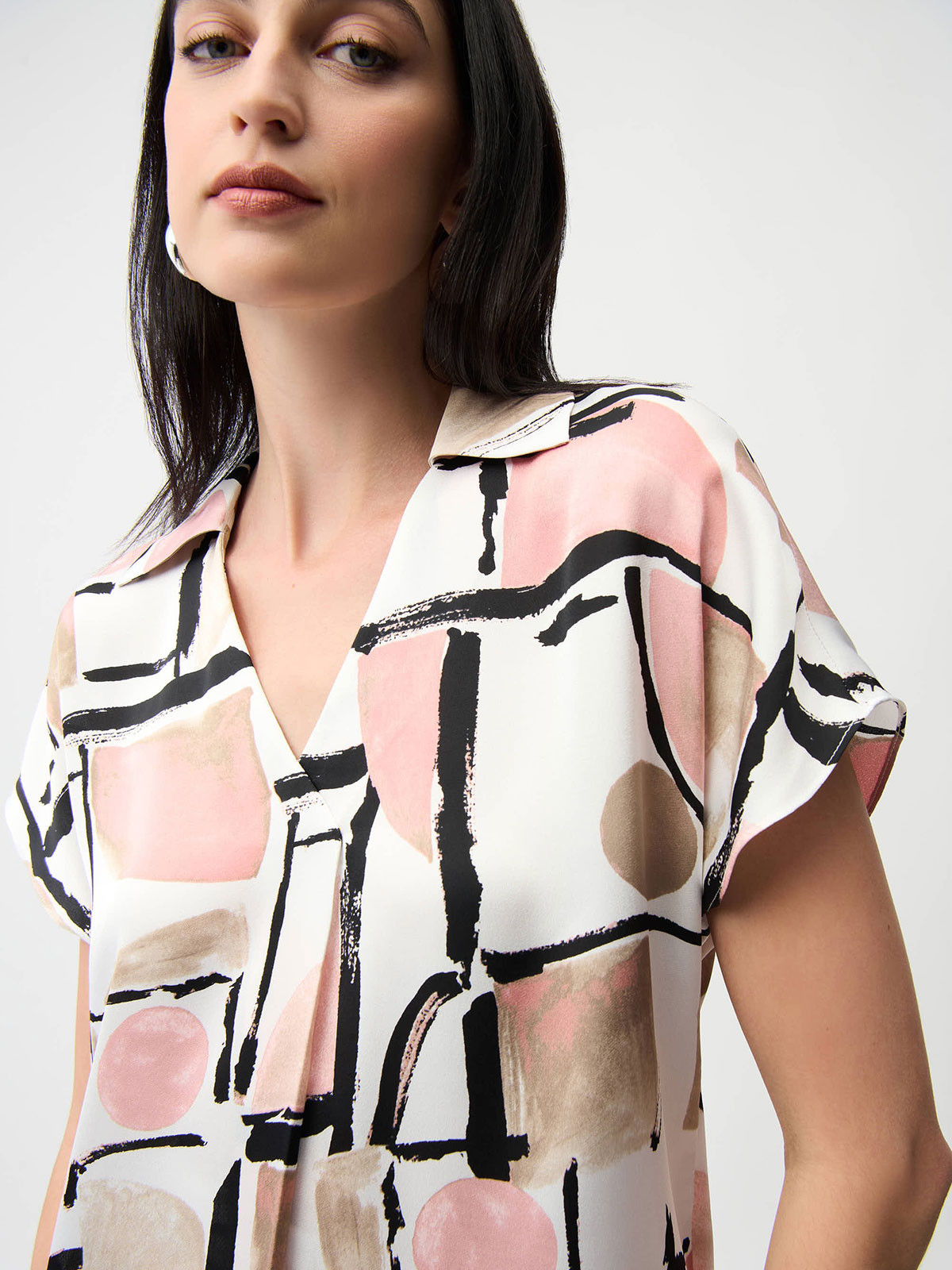 Härlig satintopp från Joseph Ribkoff i ett grafiskt mönster. Modellen är vid och ledig, har krage och V-ringad hals. Holkärmen är kort och nederkanten rak.