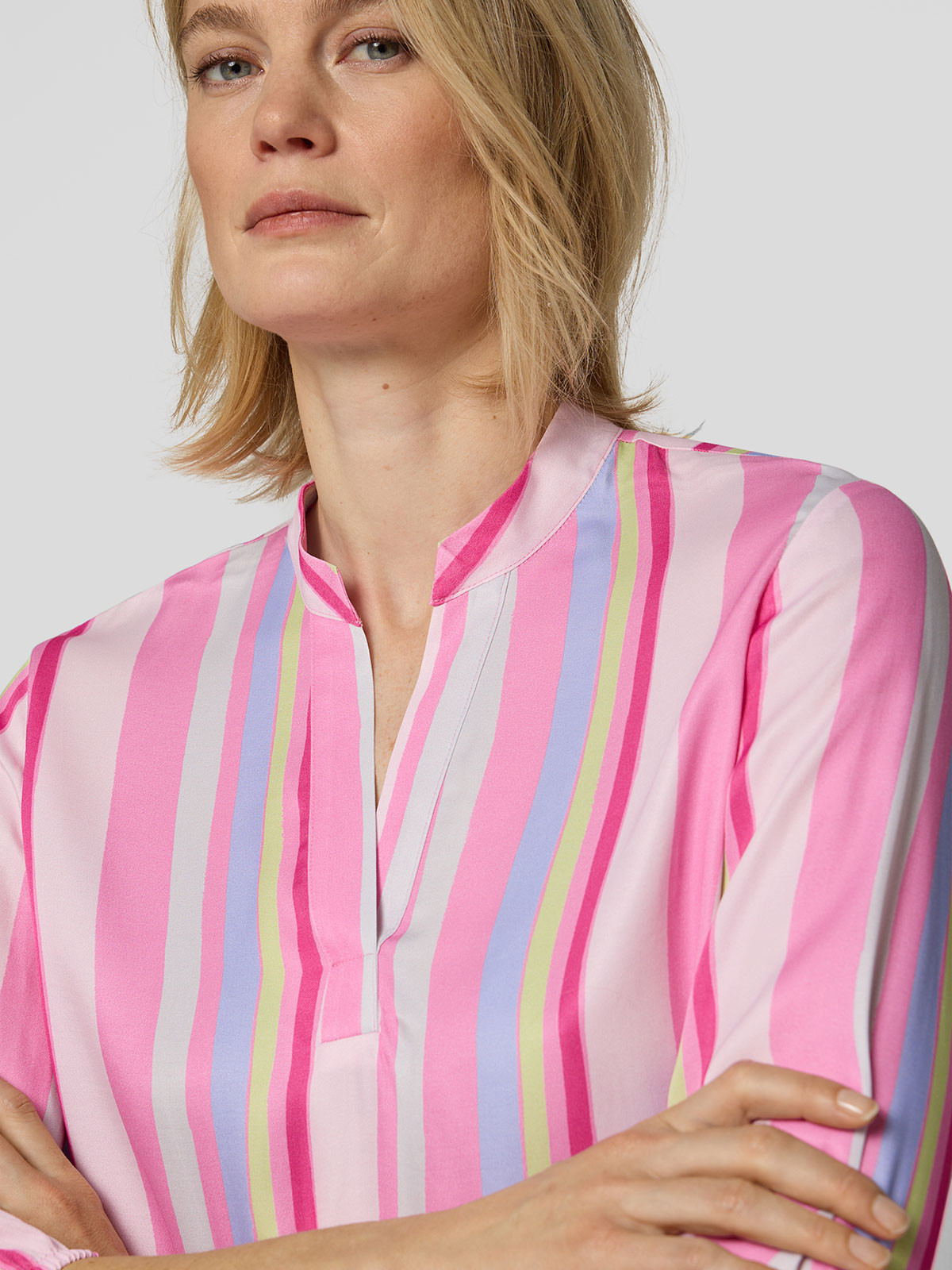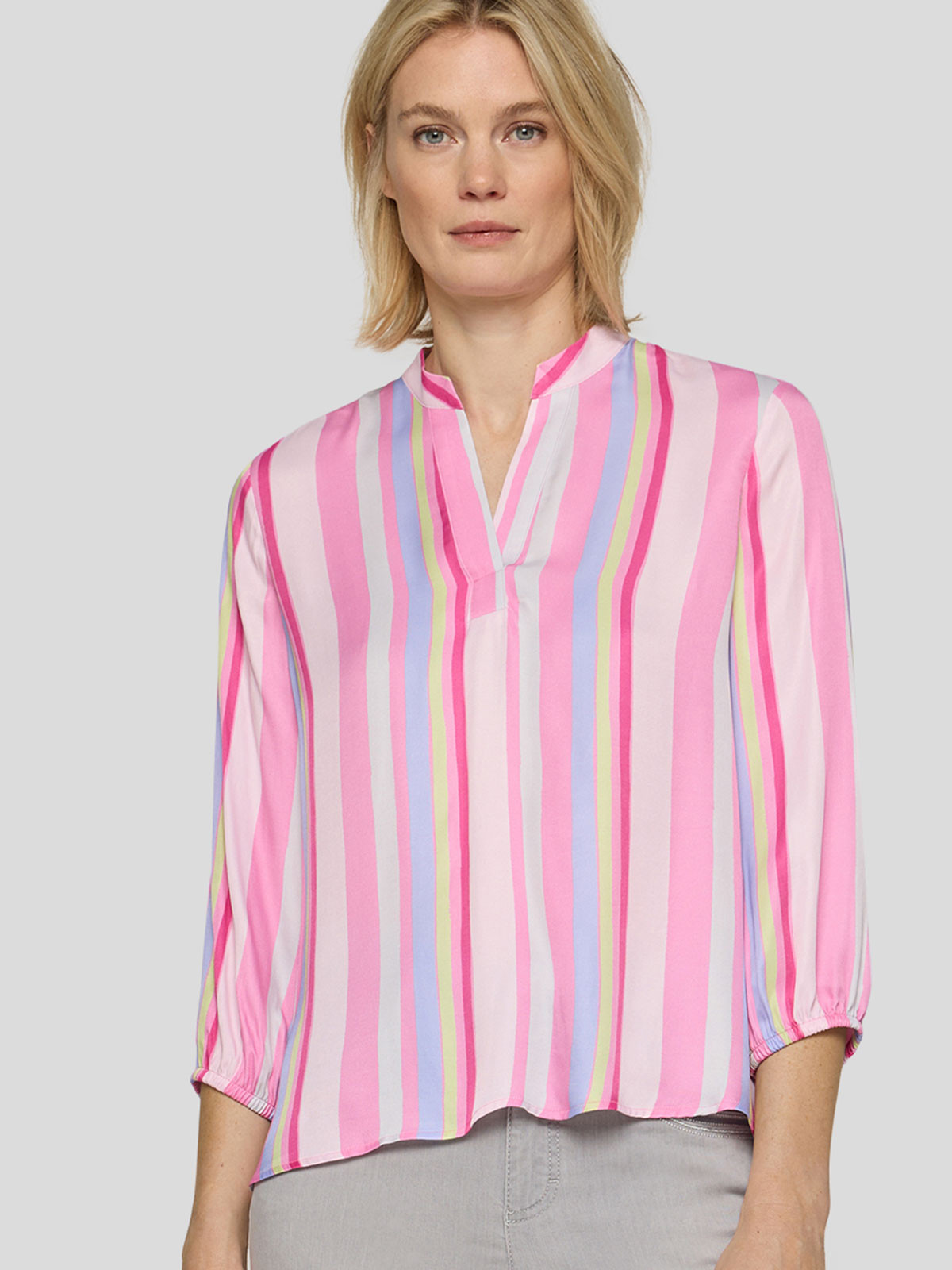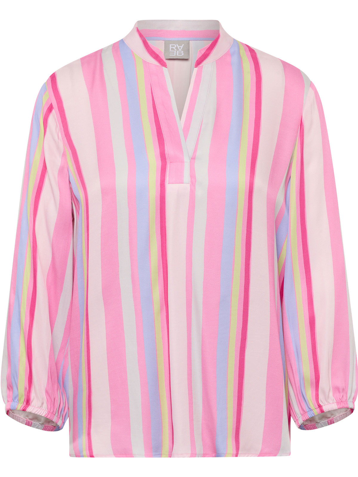Härlig viskosblus från Rabe i oregelbundna ränder. Modellen är rak och vid, har kort ståkrage och en öppning fram. Ärmen är trekvartslång med resår i nederkant. Nederkanten är rak för en tugg siluett.