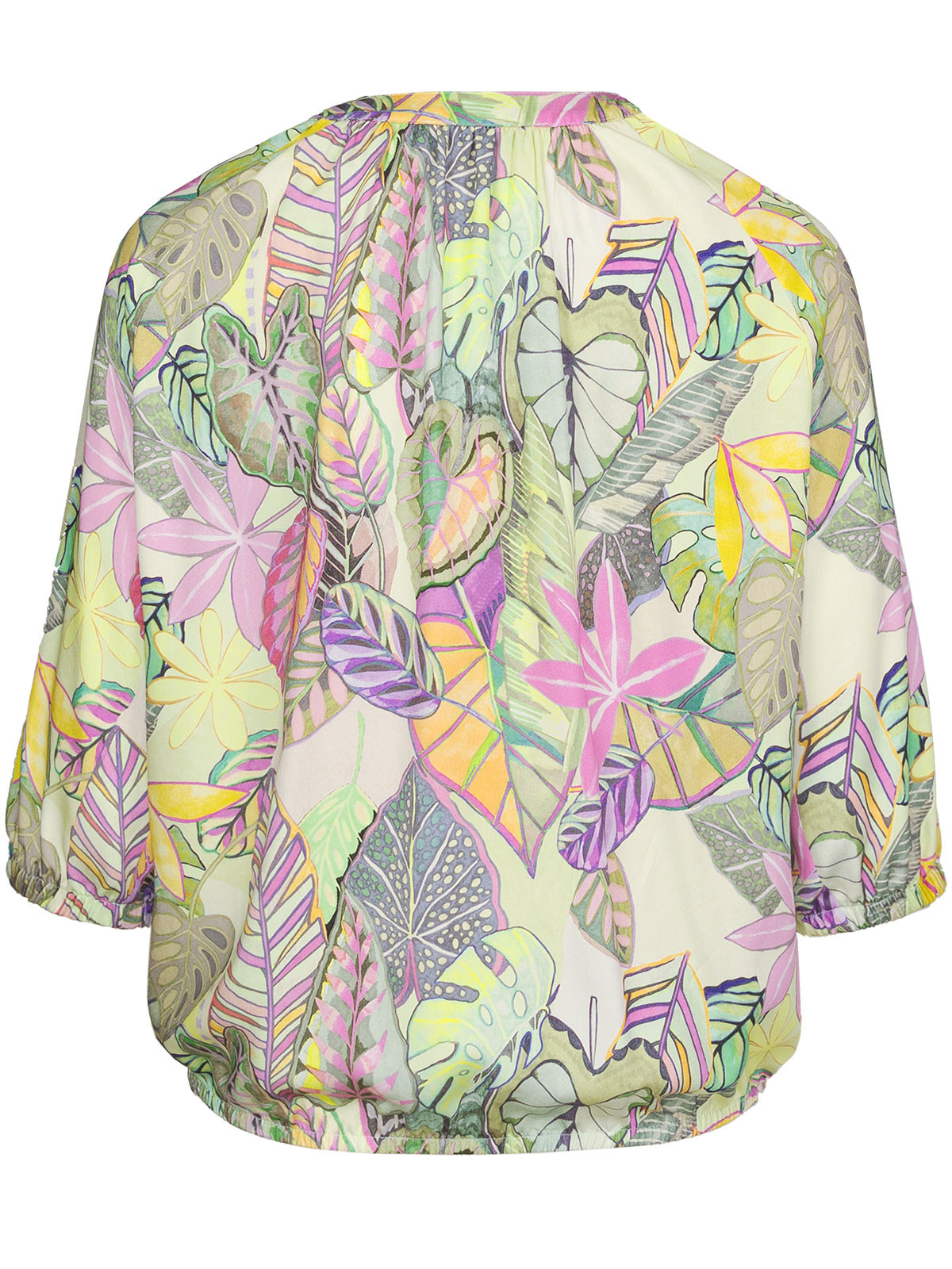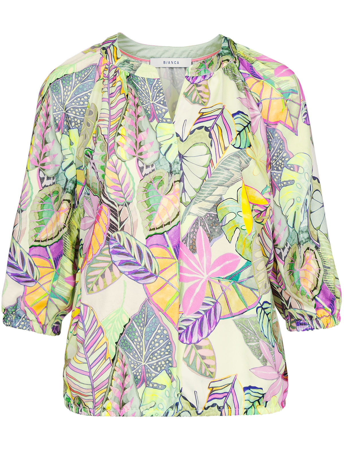 Vacker viskosblus från Bianca i härliga pastelltoner. Modellen är vid och rak och samlas ihop med en resår i nederkant. Halsen är rundad och har rynkad krage med en V-formad öppning fram. Ärmen är trekvartslång och samlas ihop med en resår även den.