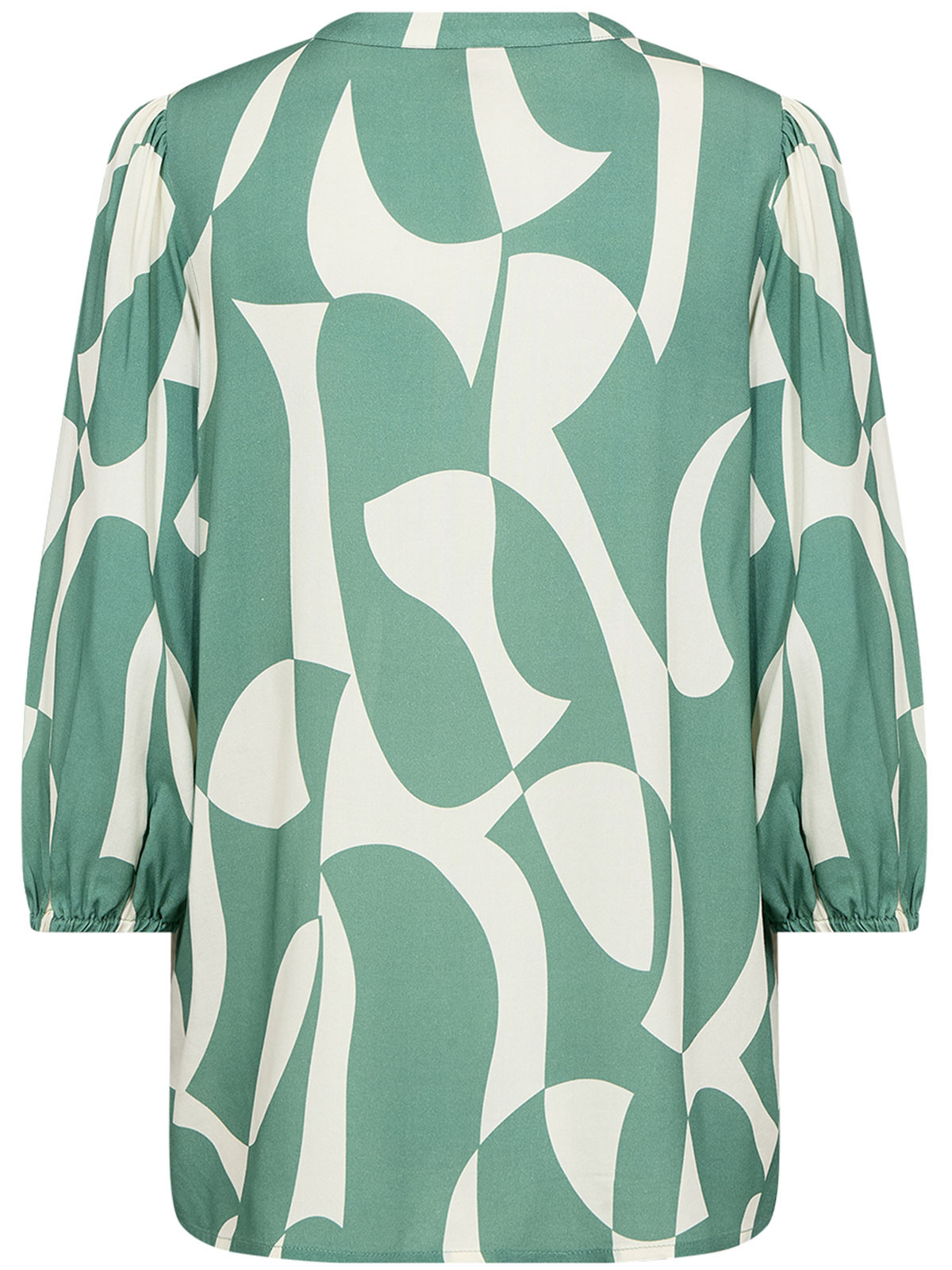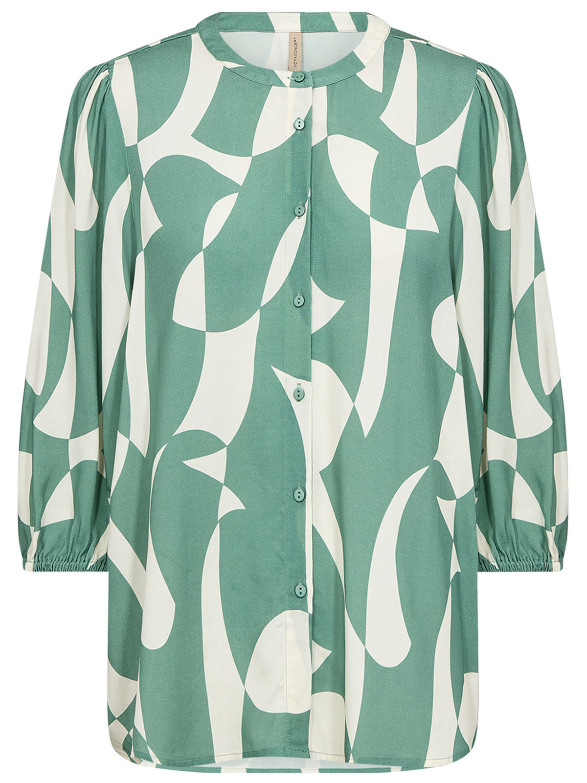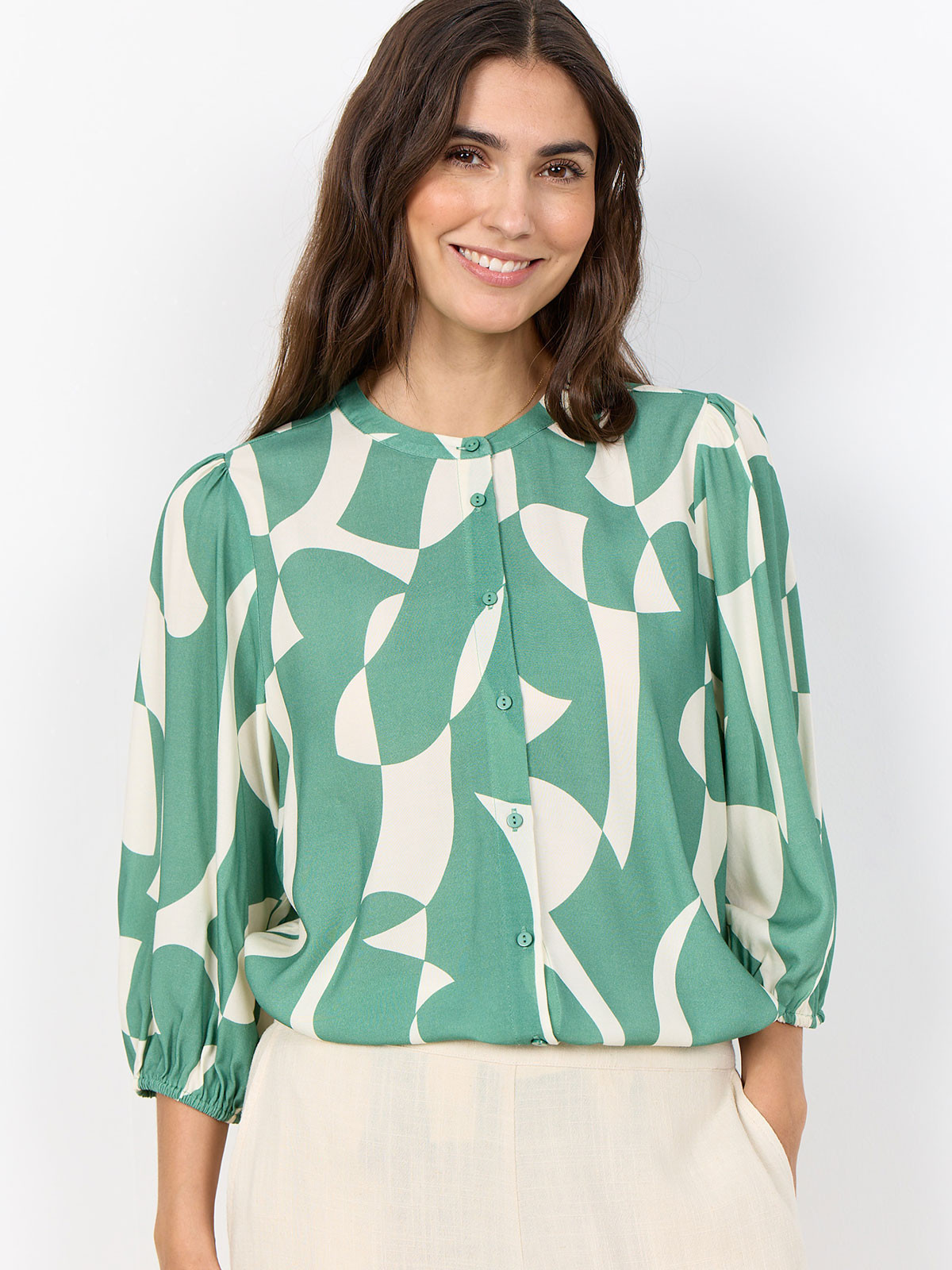 Härlig viskosblus från SoyaConcept i en vid modell. Halsen ä rrundringad och nederkanten helt rak. Ärmen är vid och av trekvartdslängd. Den har puff och en ihopsamlande resår i nederkant.