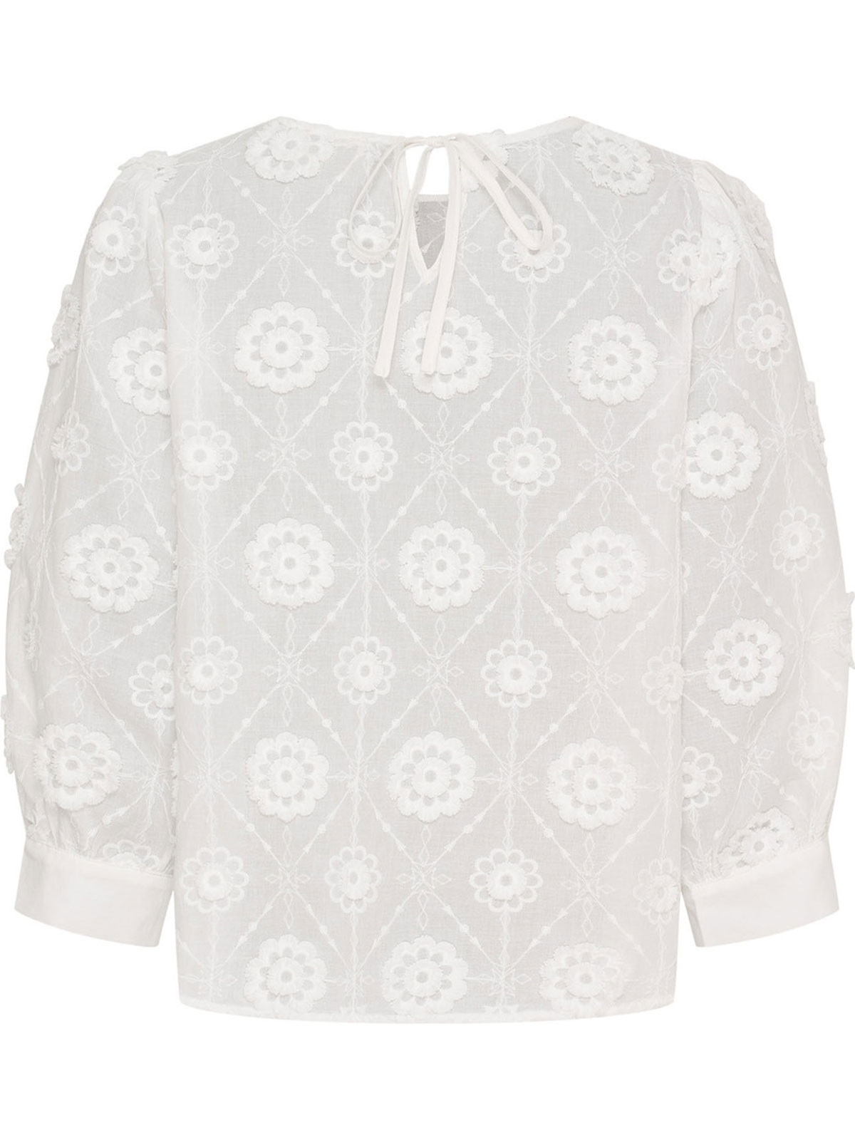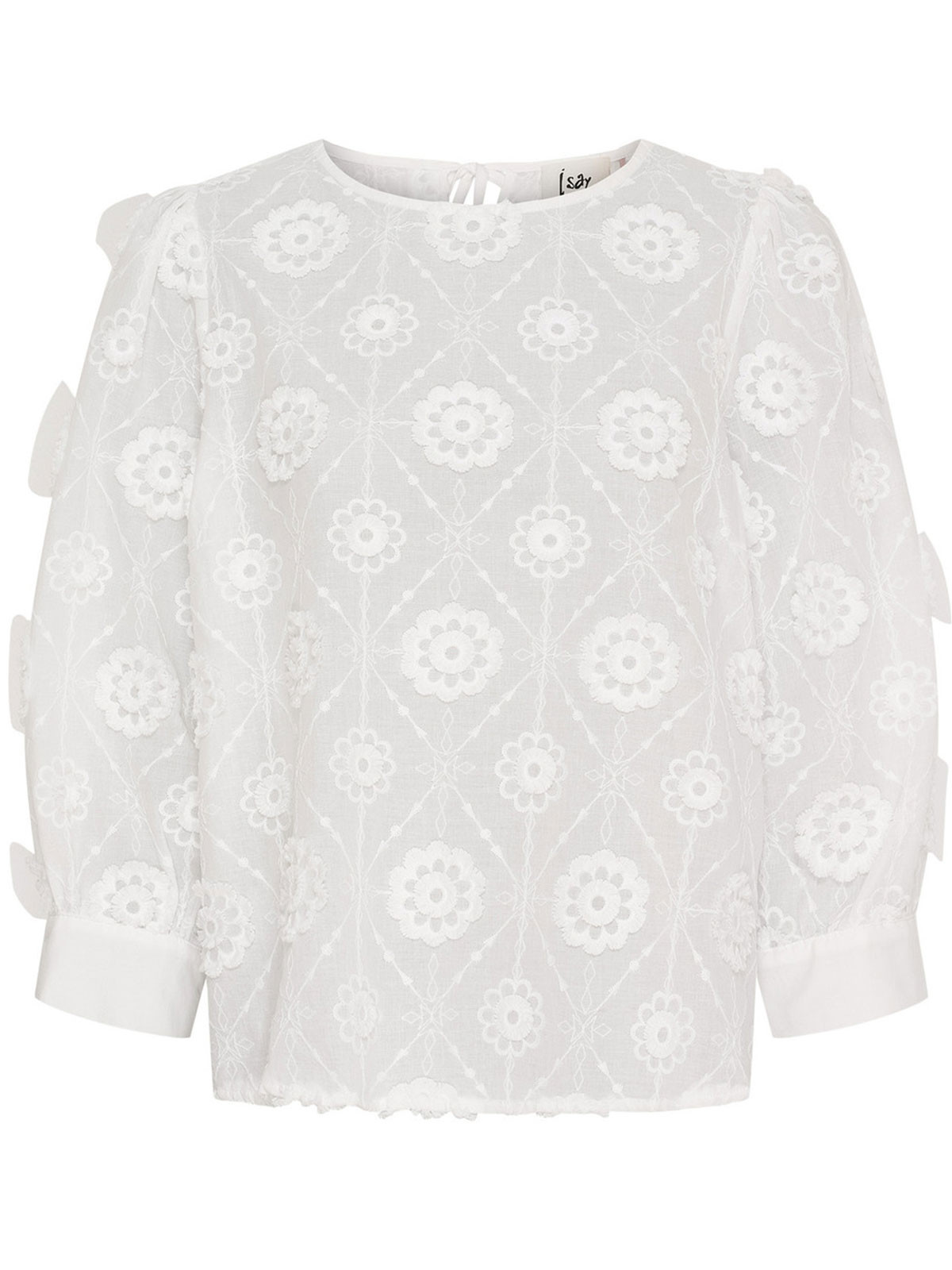 Underbar blus från Isay med vita broderier på vitt bomullstyg. Modellen är boxig med rundad hals, trekvartslång puffärm. I nacken knyts blusen ihop med tygband.