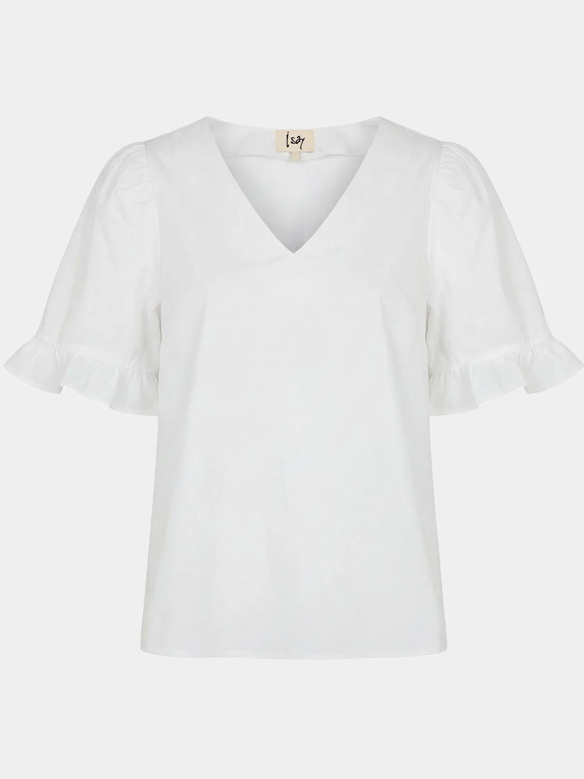 Härlig bomullsblus från Isay. Modellen är rak och har V-ringad hals. Den vida och korta ärmen har rejäl puff och volang i nederkant Supertuff till vidare byxor eller kjol.