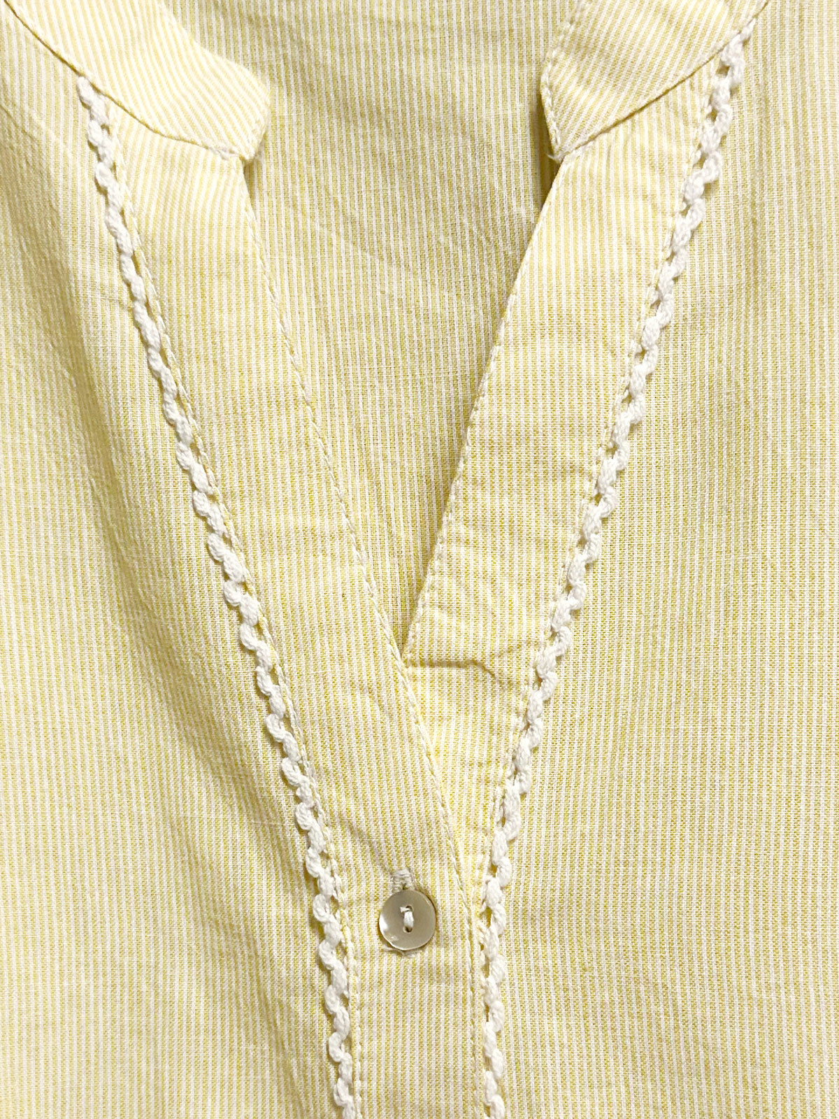 Supersöt bomullsblus från Micha i ett smalrandigt gult tyg. Modellen är rak och har rundad hals med V-formad öppning ner till knäppningen. Ärmen är kort och har puff. Längs med knäppningen finns det en vit virkad kant som ger blusen extra karaktär.