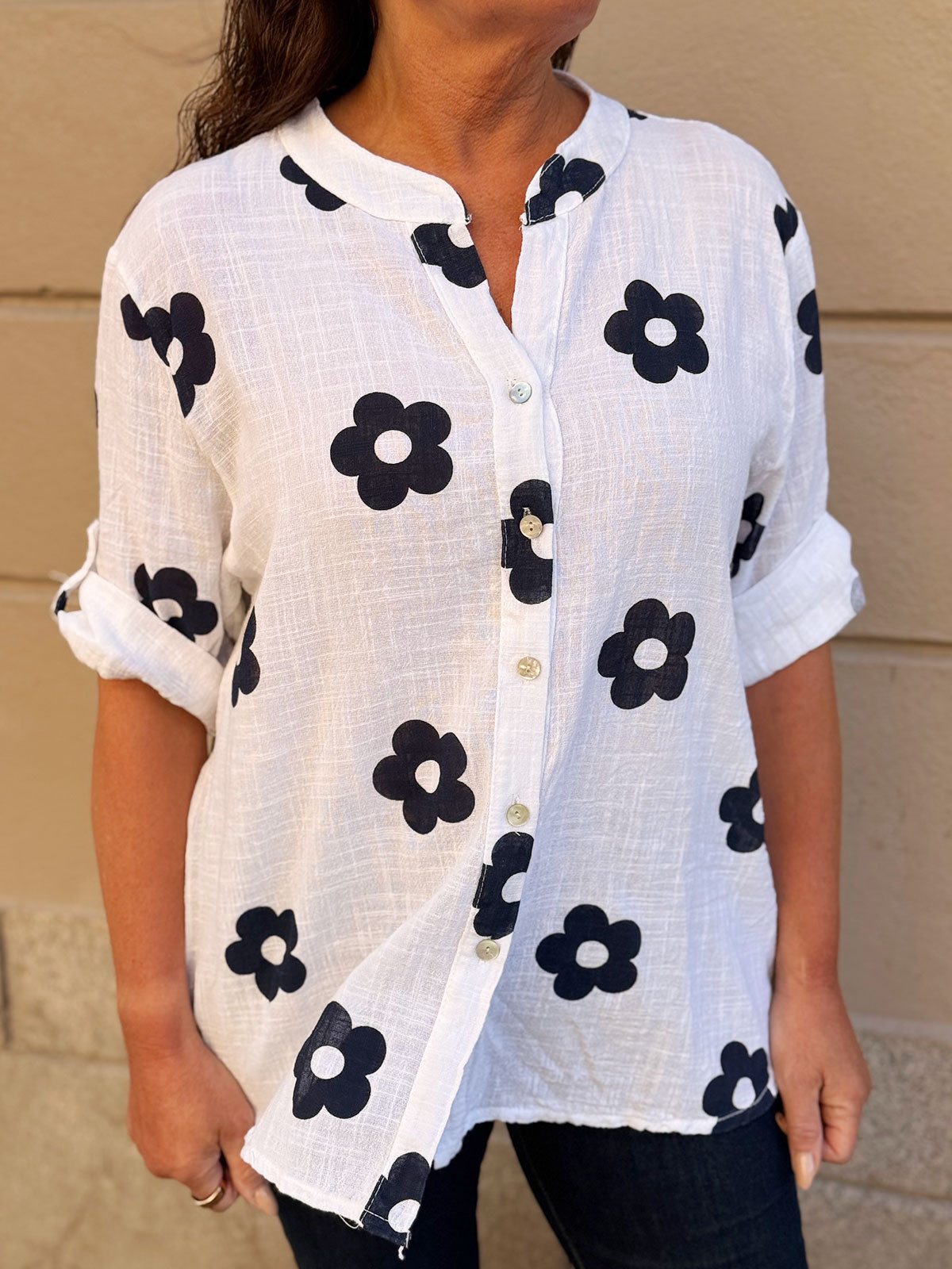 Härlig blus i ett luftigt och lite grövre bomullstyg. Modellen är rak och har rundad krage  och trekvartslång ärm med slejf för uppvik. Mjukt rundad i nederkant.
