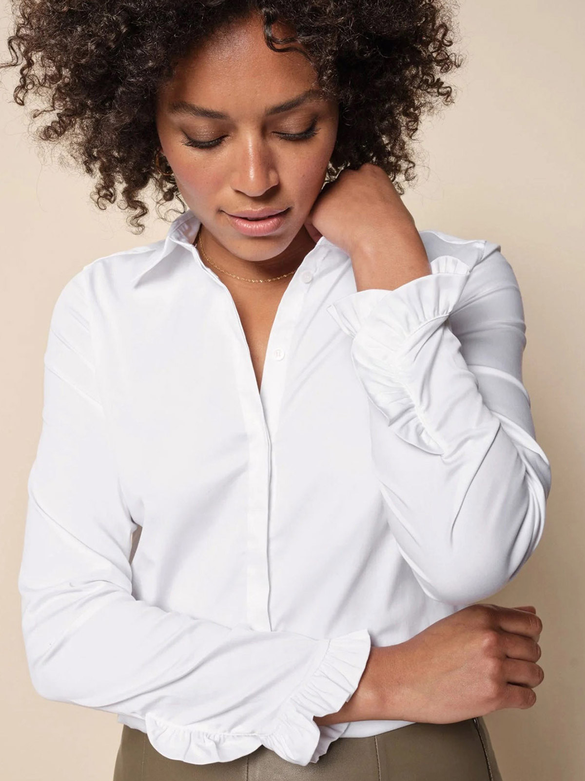 Snygg skjorta med feminin touch från Mos Mosh. Modellen är figursydd och tyget har en fin lyster och skönt stretchig kvalitet. Kragen är klassisk och knäppningen dold. På ärmarnas ändar finns en dekorativ volangkant.